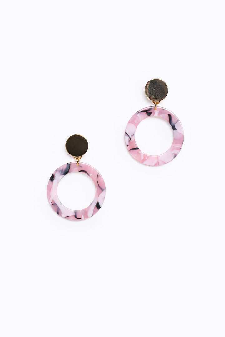 “Add a pop of color and a touch of sophistication to your outfit with the Pink Marble Acrylic Circle Earrings from Piper & Scoot.”