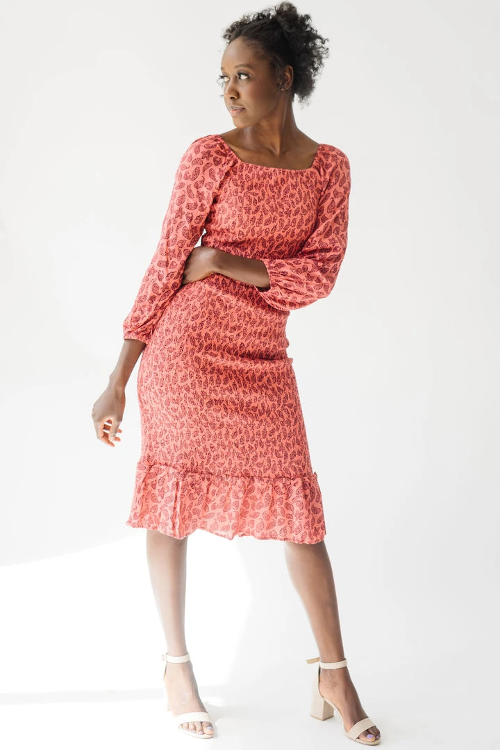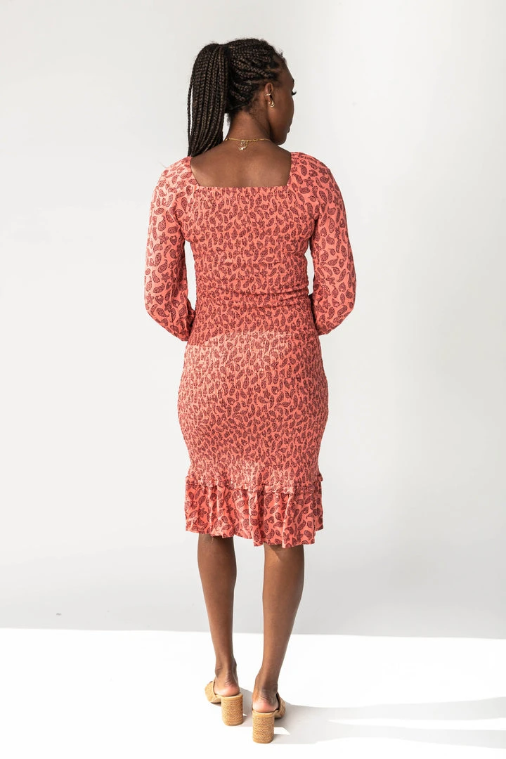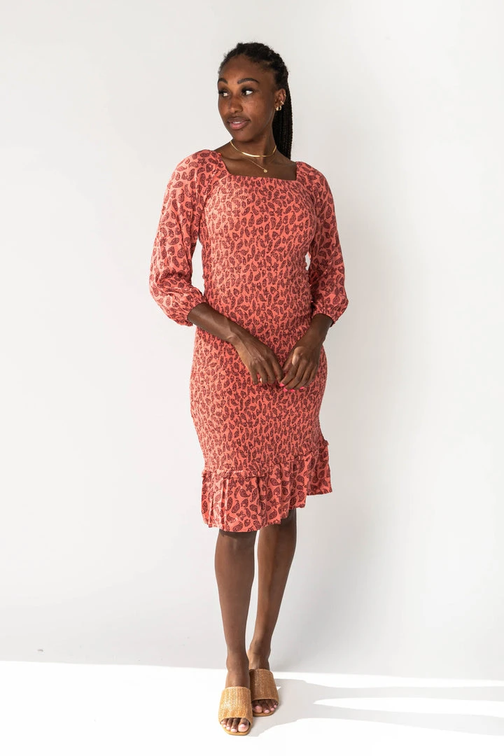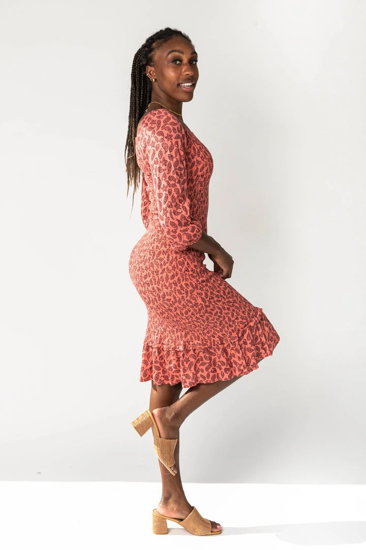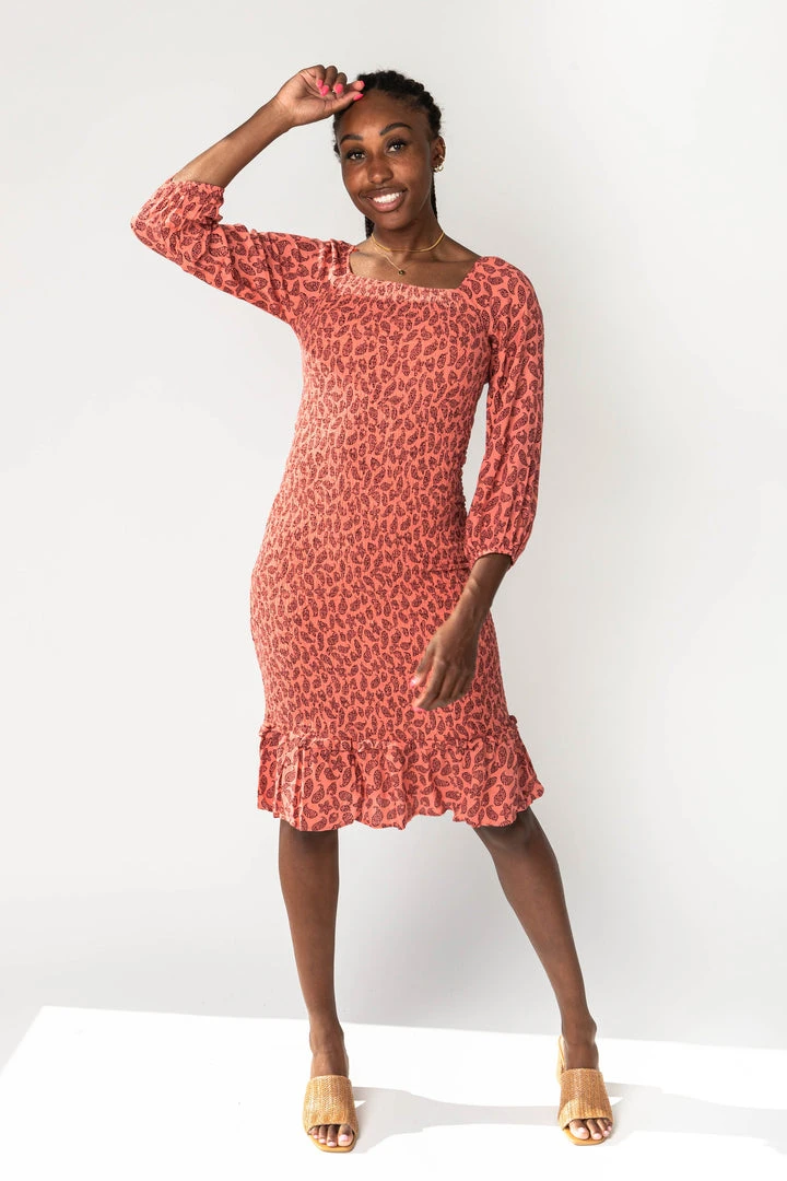 This dress is exclusive to us and comes in inclusive sizing. The smocking provides a stretchy + slim that is flattering + comfy. The paisley print is timeless + on-trend. It has elastic cuffs + a ruffled hemline.Â