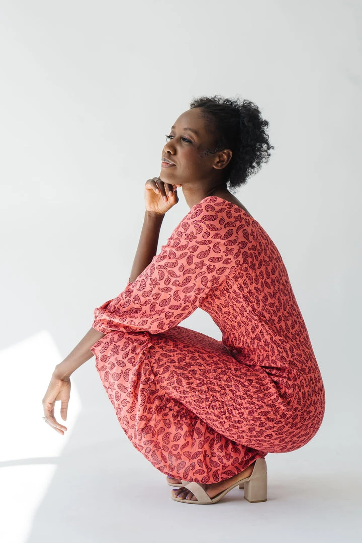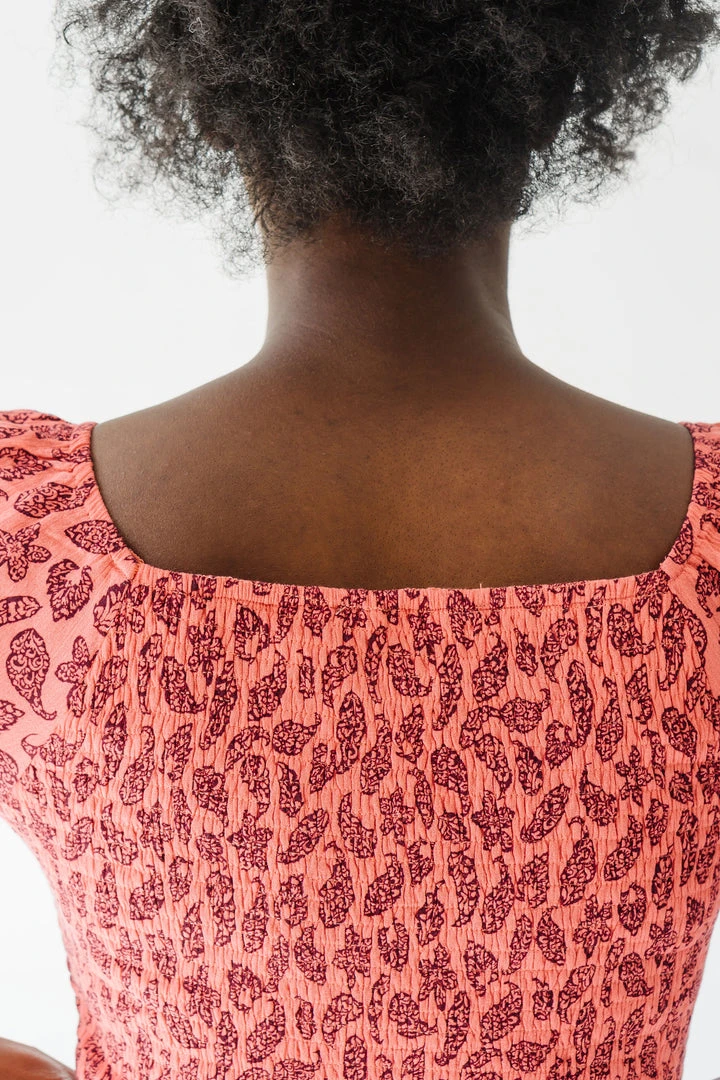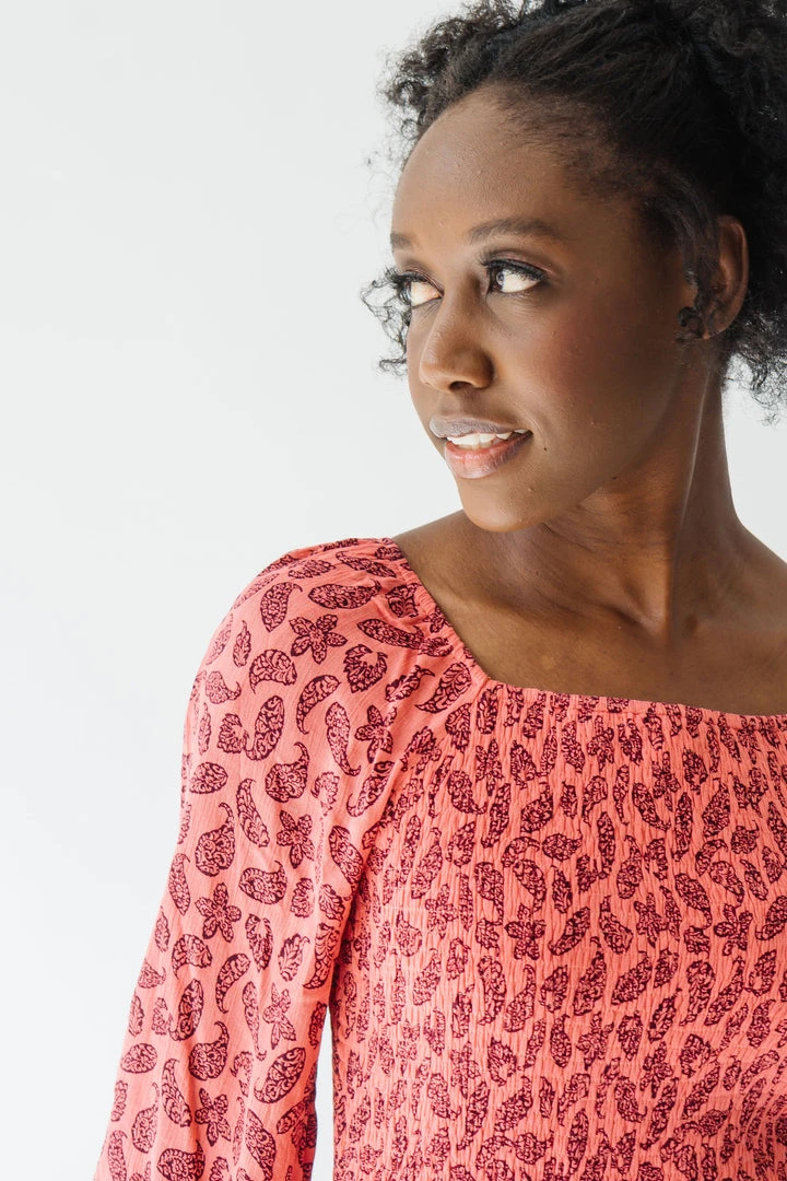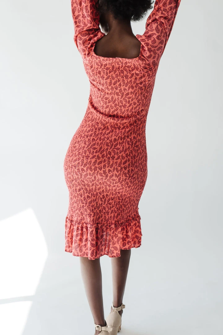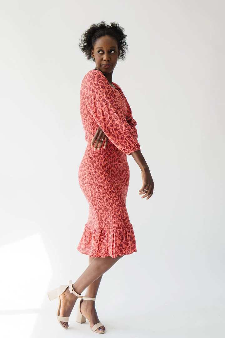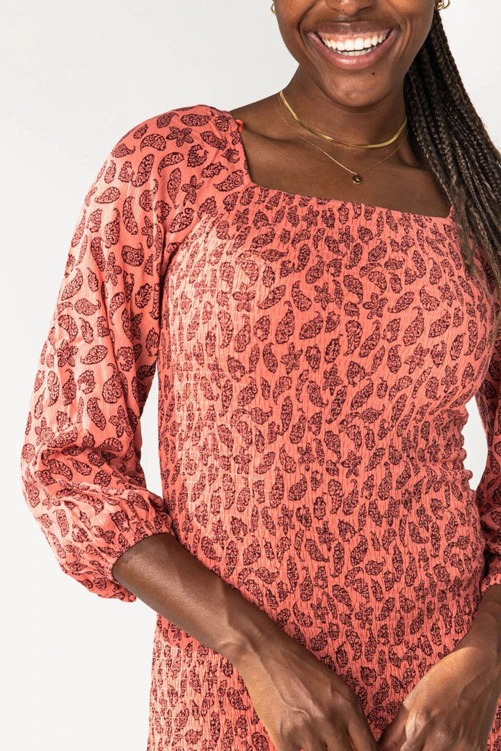 This dress is exclusive to us and comes in inclusive sizing. The smocking provides a stretchy + slim that is flattering + comfy. The paisley print is timeless + on-trend. It has elastic cuffs + a ruffled hemline.Â