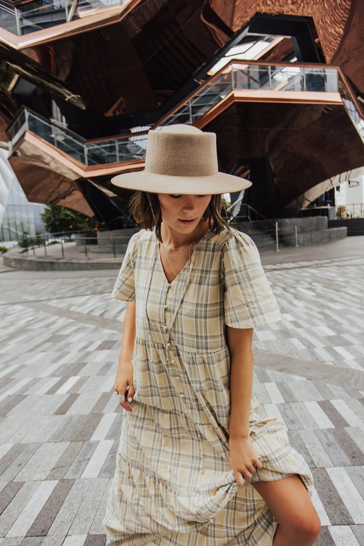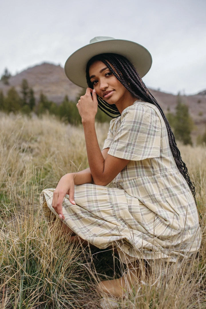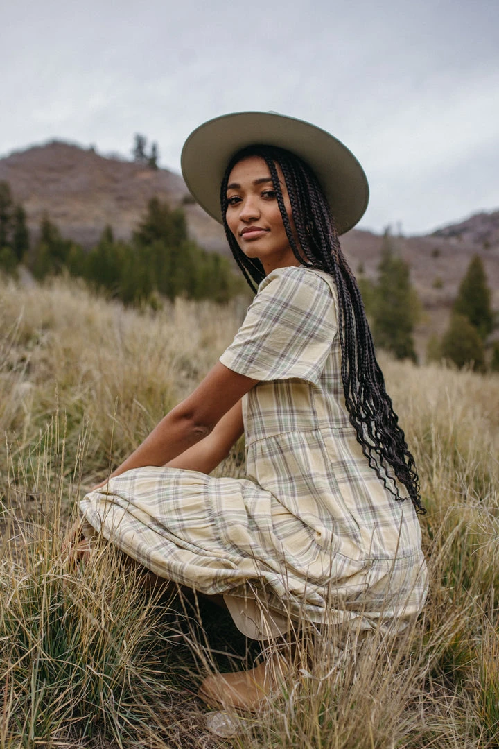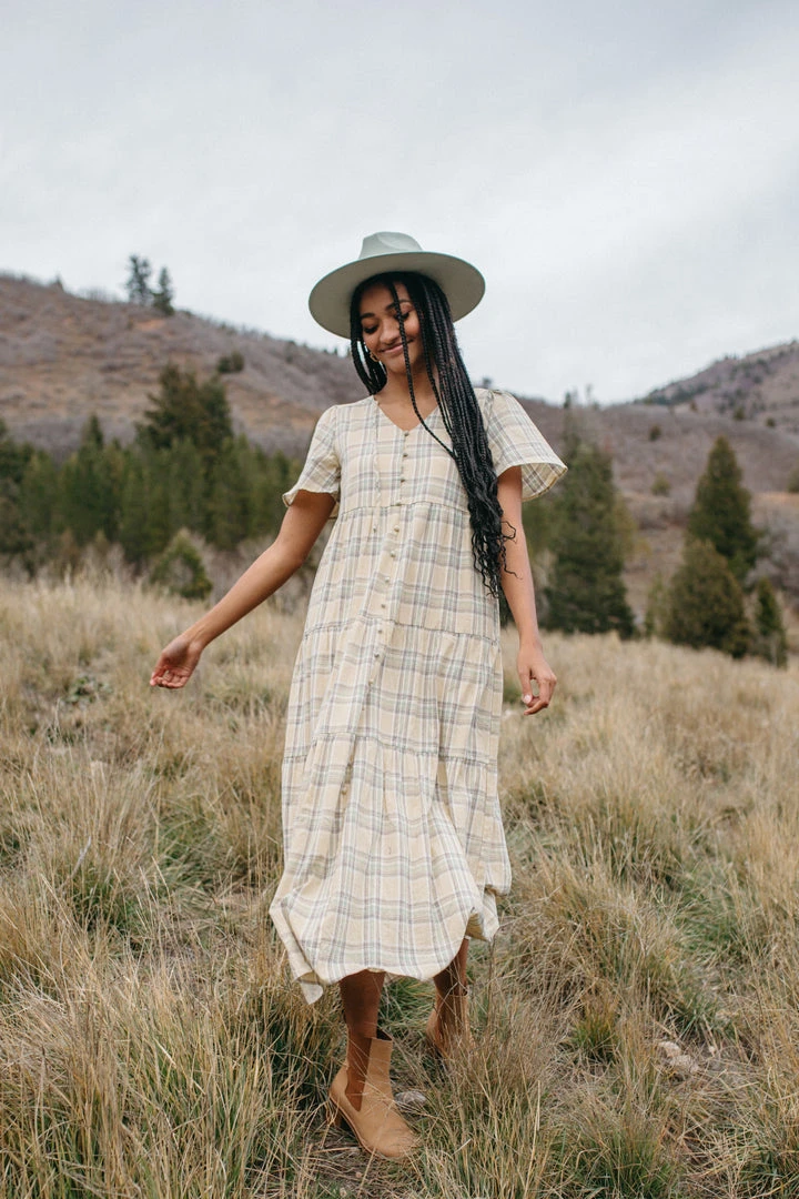 Plaid perfection. This neutral plaid dress has timeless details that make it transitional through every season. It has a simple silhouette with ties at the v-neckline, an empire waistline, and is made from breathable cotton. It has buttons down the front making it nursing-friendly. It comes in extended sizing.Â