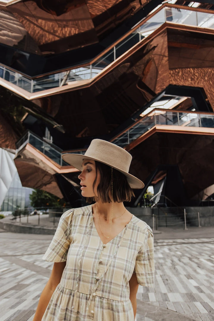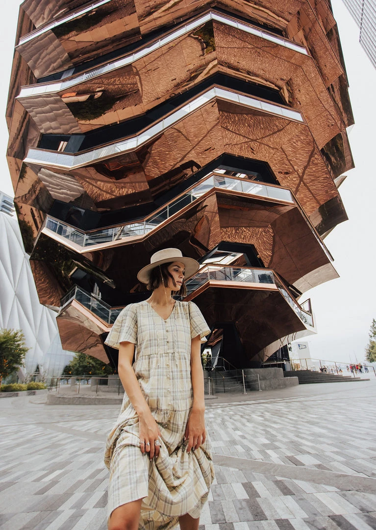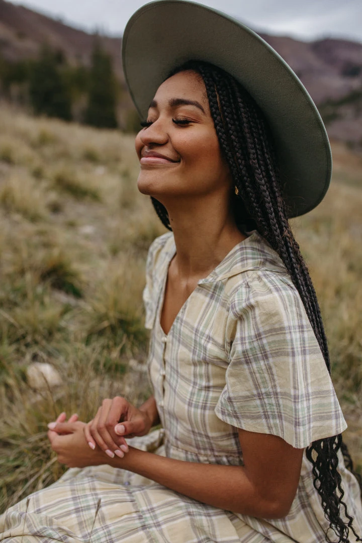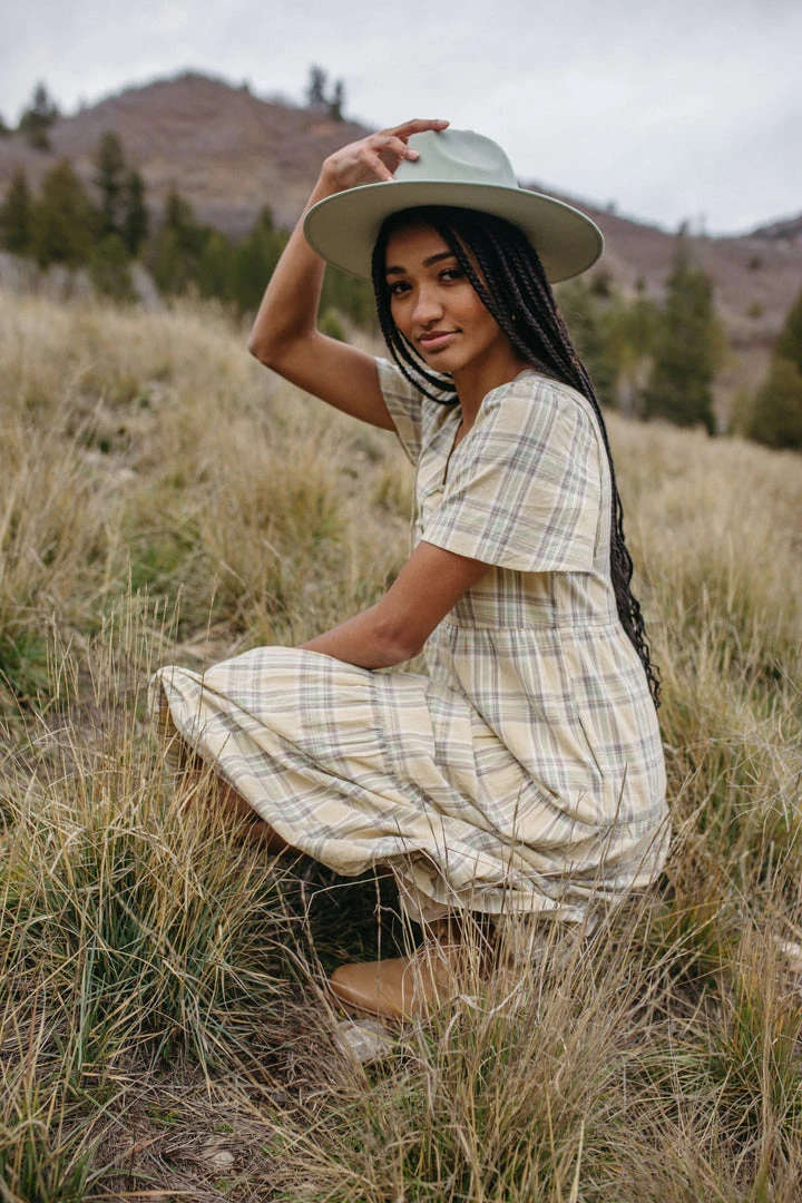 Plaid perfection. This neutral plaid dress has timeless details that make it transitional through every season. It has a simple silhouette with ties at the v-neckline, an empire waistline, and is made from breathable cotton. It has buttons down the front making it nursing-friendly. It comes in extended sizing.Â