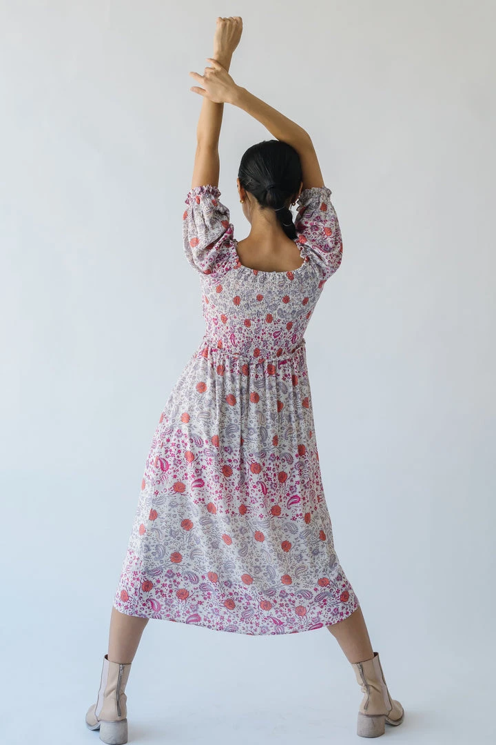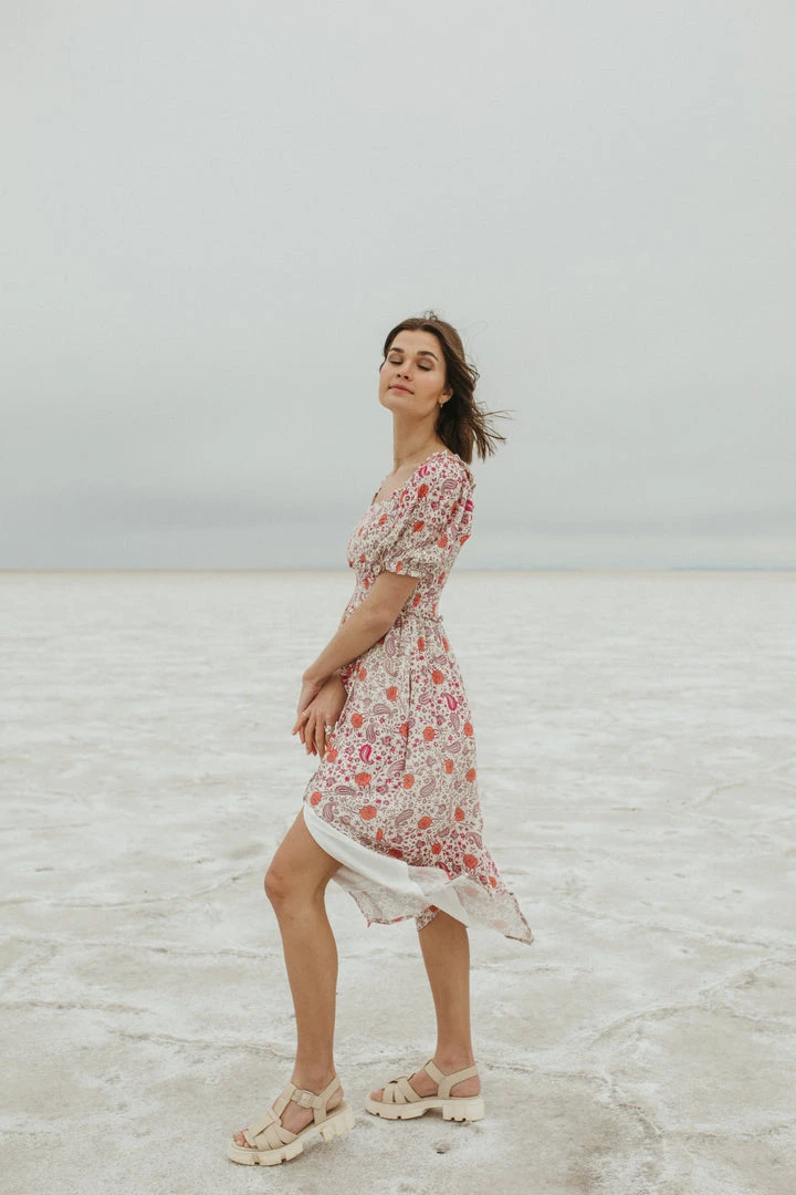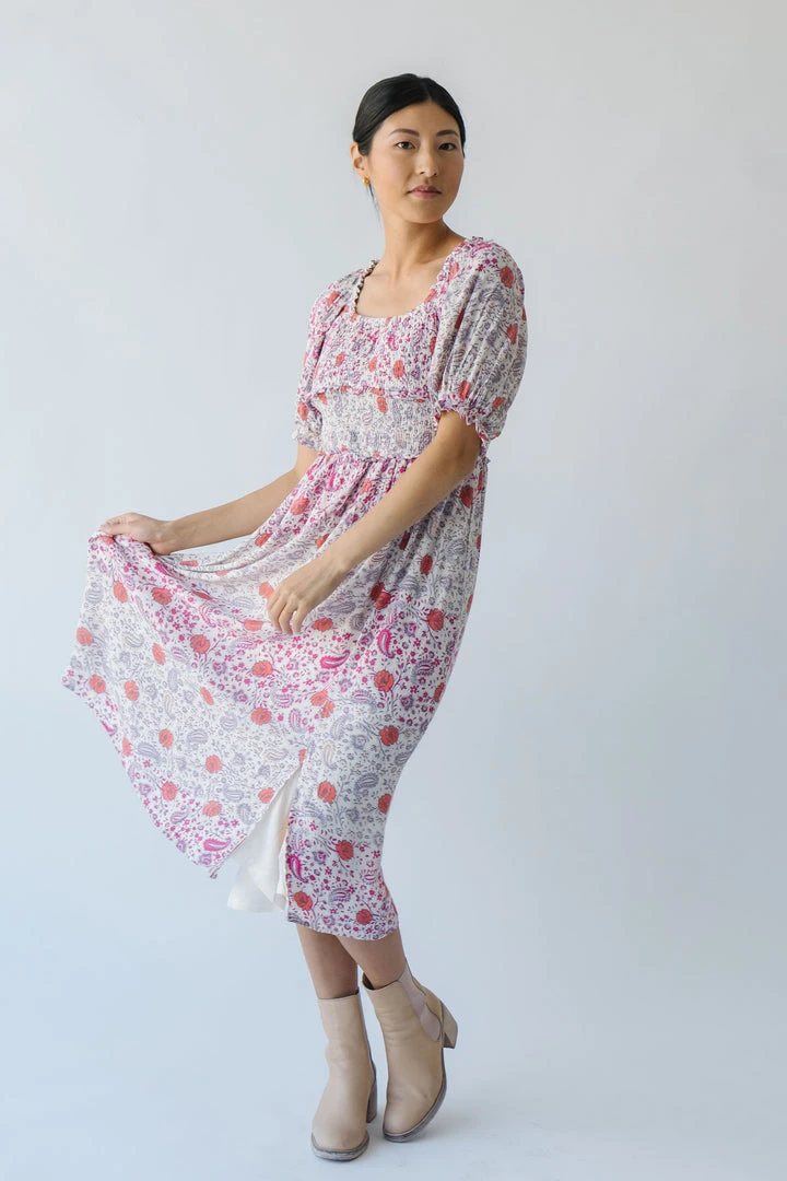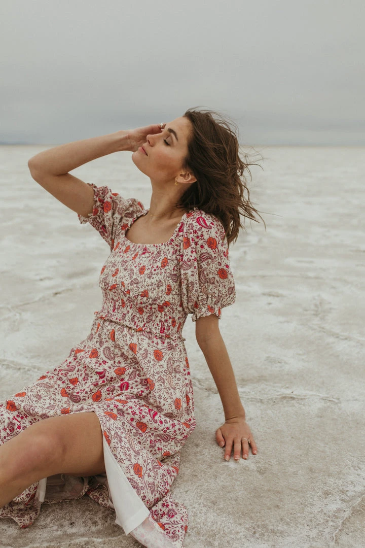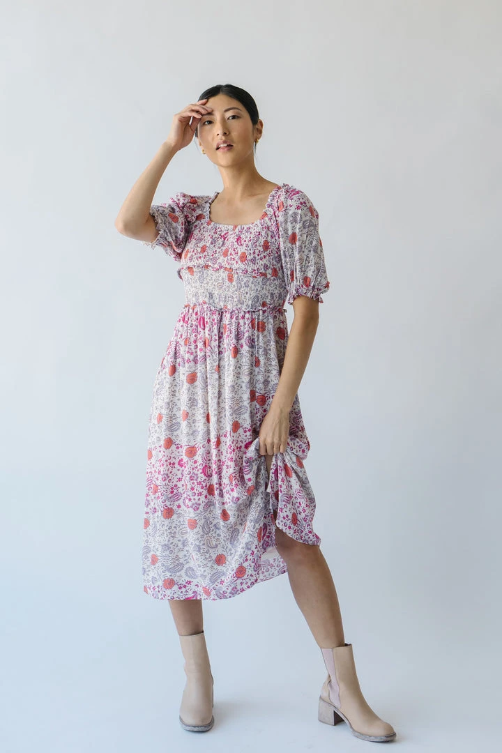 The Myla Floral Dress is as flattering as it is comfortable. It comes in inclusive sizing, has a flexible smocked top, and a tiered skirt. There is ruffle detailing that adds a feminine flair. It comes lined.Â