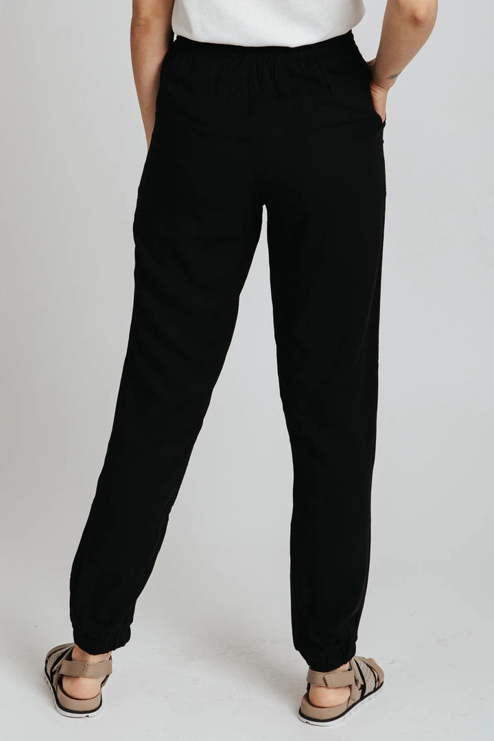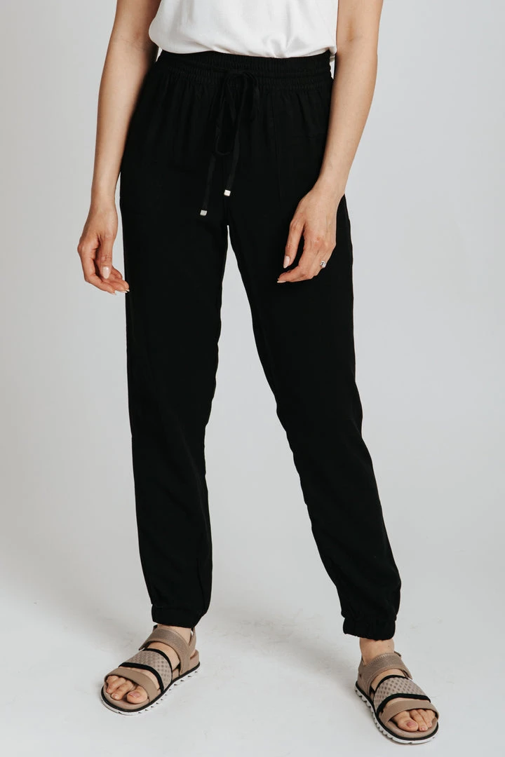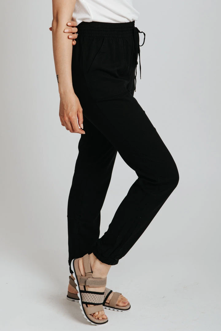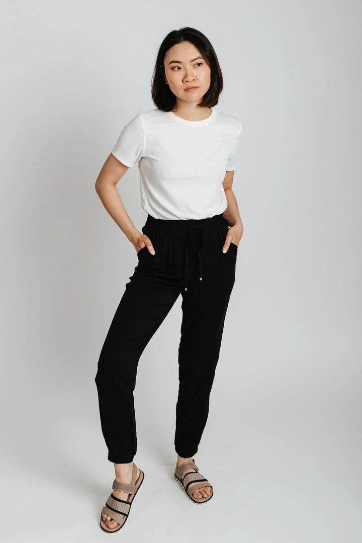 Summer’s coming so getting ready has gotta be breezier + easier. The Junie Drawstring Joggers are a sporty style with comfort in mind. They have a flexible waistline, side pockets, and a tapered jogger-style leg.Â