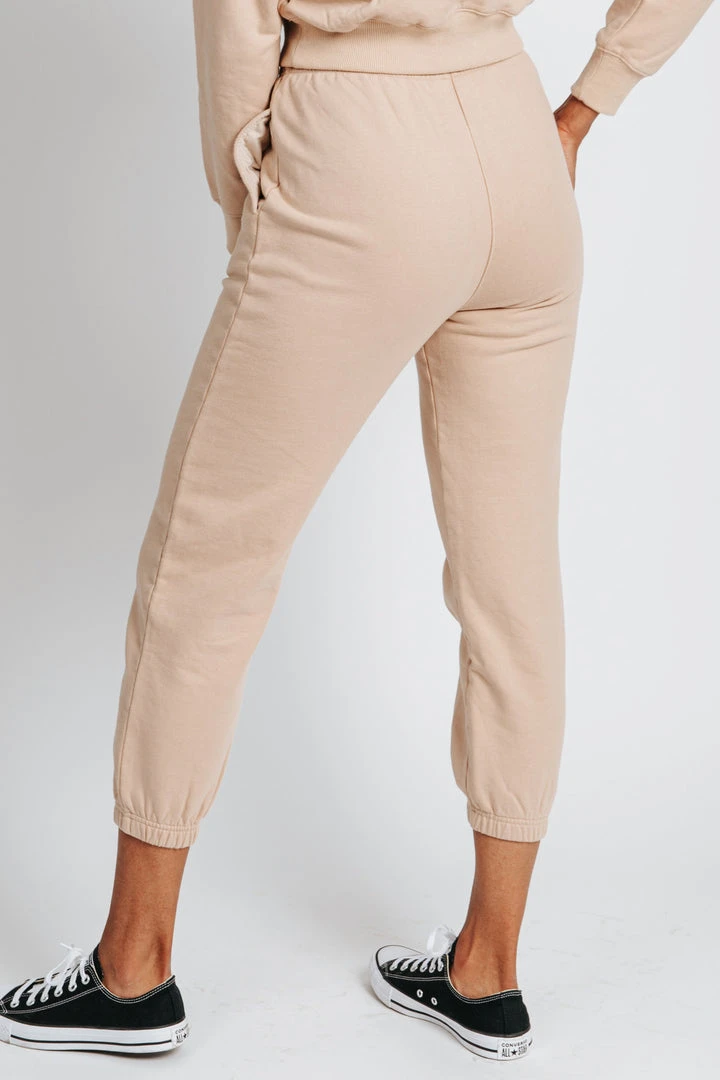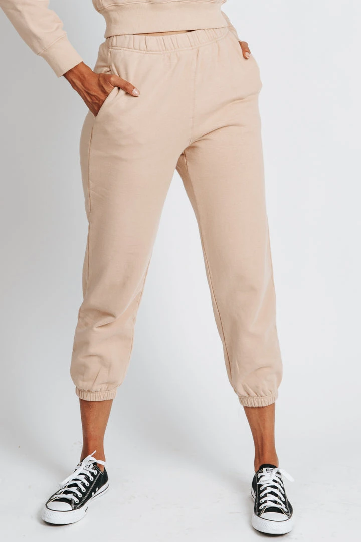 Stay cozy + comfy without sacrificing style. The Kahlo Cozy Joggers are a lighter tan color with an elastic waistline. They are a sporty jogger style. They can be paired with The Frida Half-Zip Pullover to make it a set or mix + match your own styles. Â