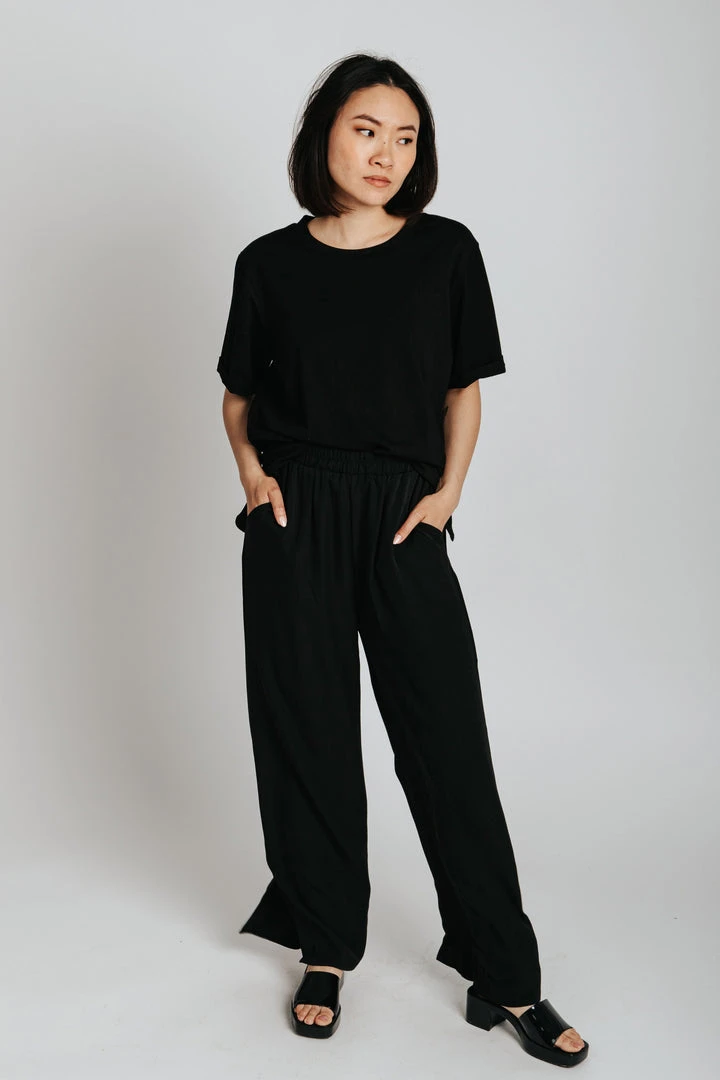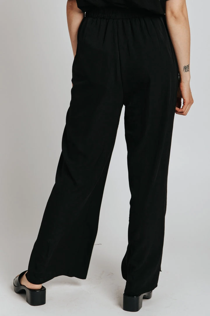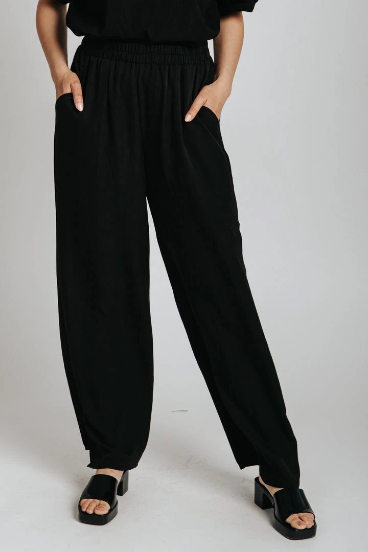 Give your jeans a break. The Pearson Trousers are black with an elastic waistline. It has hidden side pockets. These trousers can be dressed up or down.Â