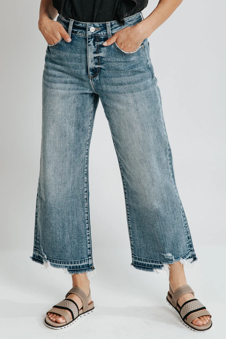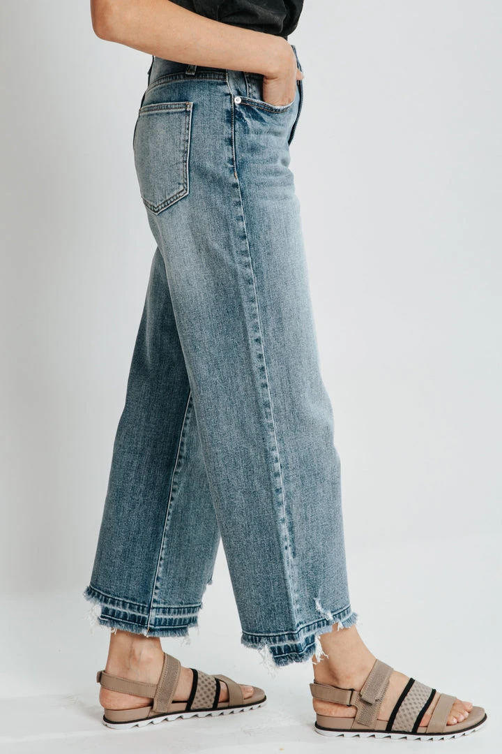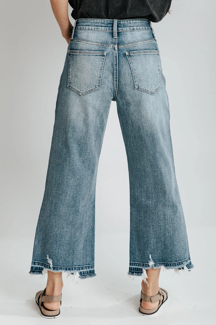 These super stretchy jeans have a light wash with a higher waistline. They have a flared leg + raw hemline.Â