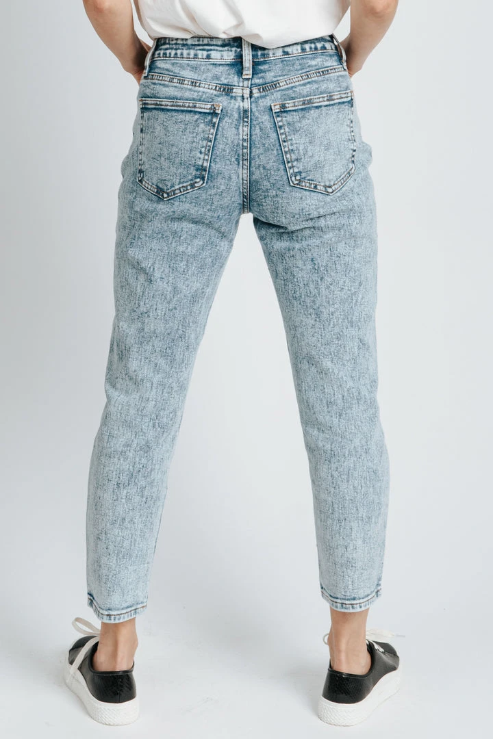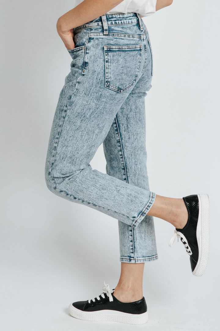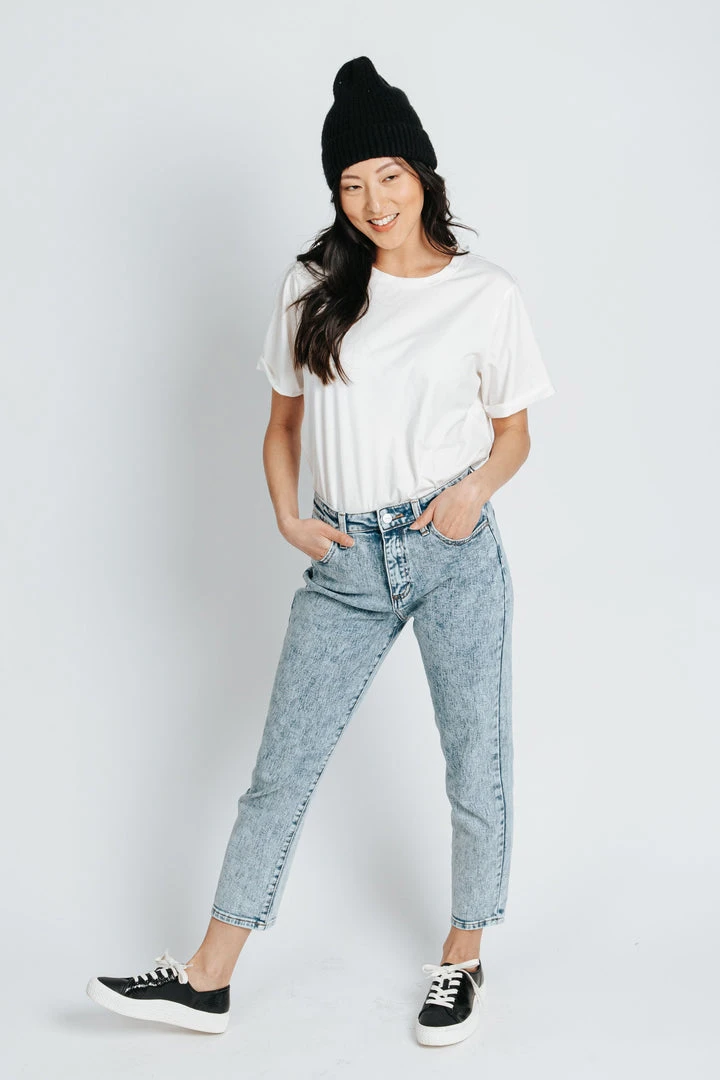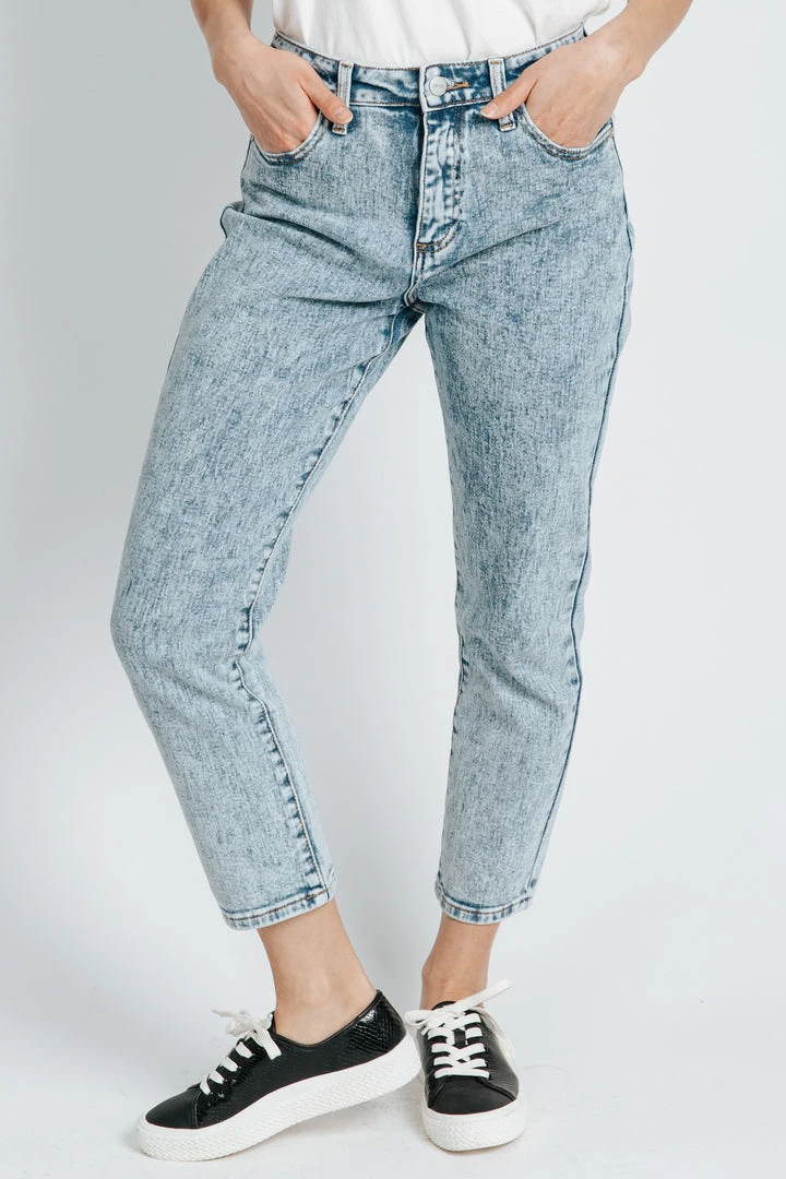 These jeans have stylish throwback vibes. They have a higher waistline with a more tapered + cropped leg. They are an acid wash in super stretchy cotton material.Â