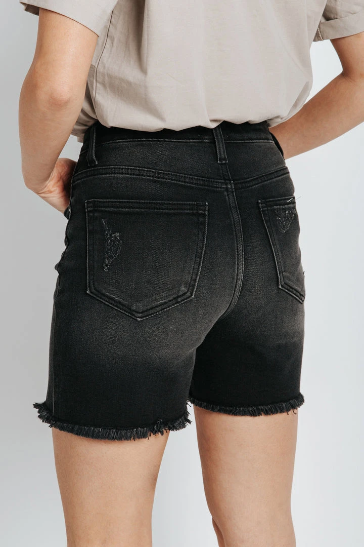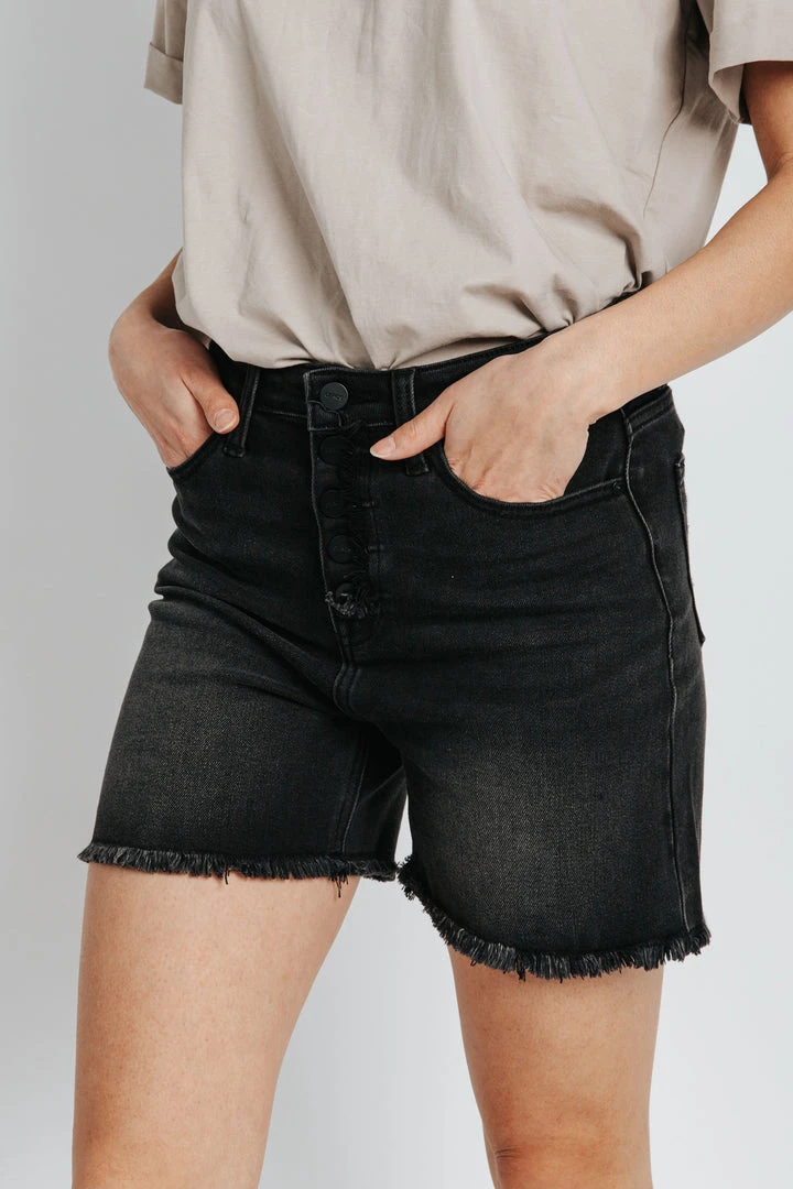 These high-rise shorts have a frayed hemline + button fly. They are made from stretchy cotton in a deep grey color. They are GOOD.