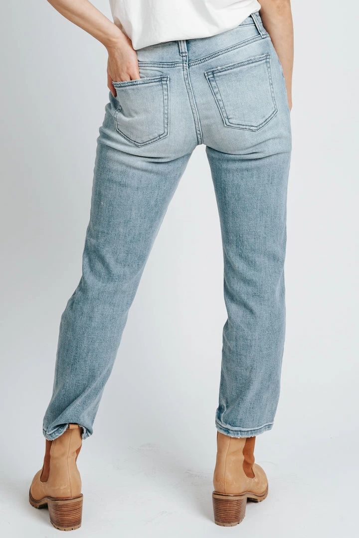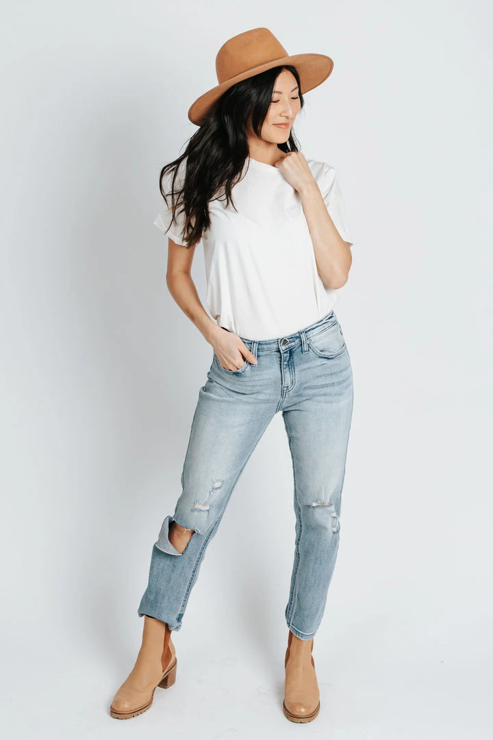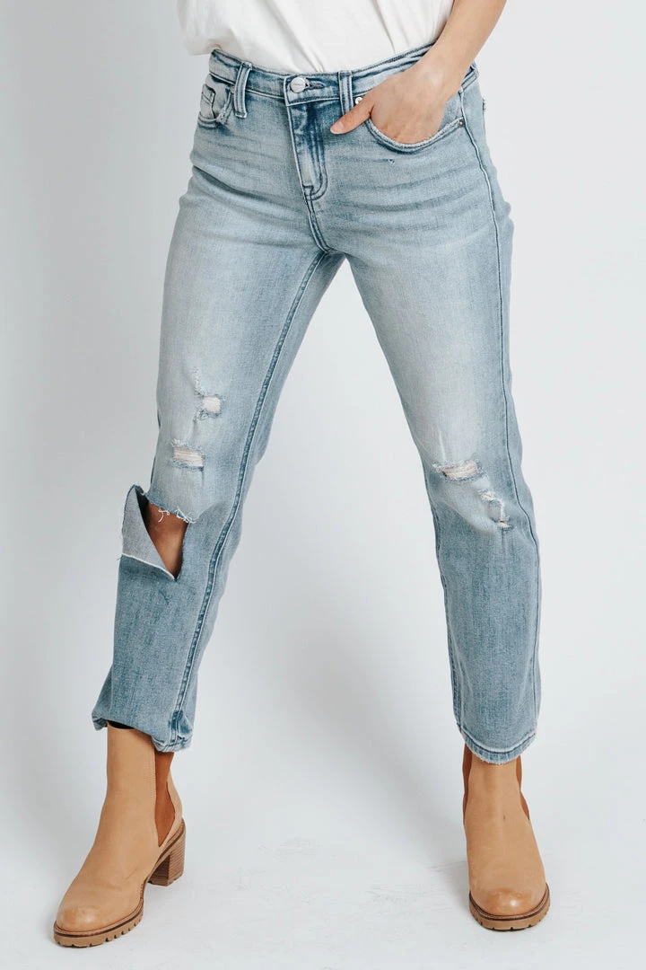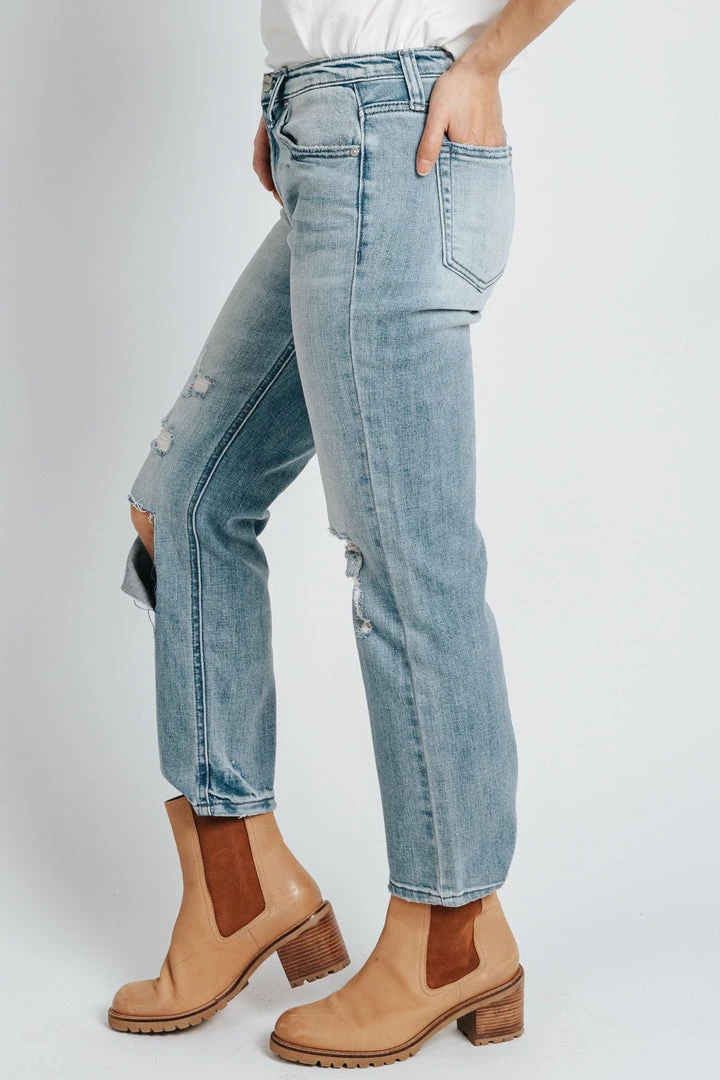 These mid-rise jeans have a structured fit with distressing on the knees + hemline. They are a medium blue wash.