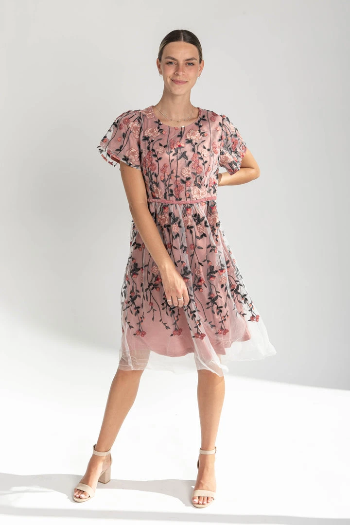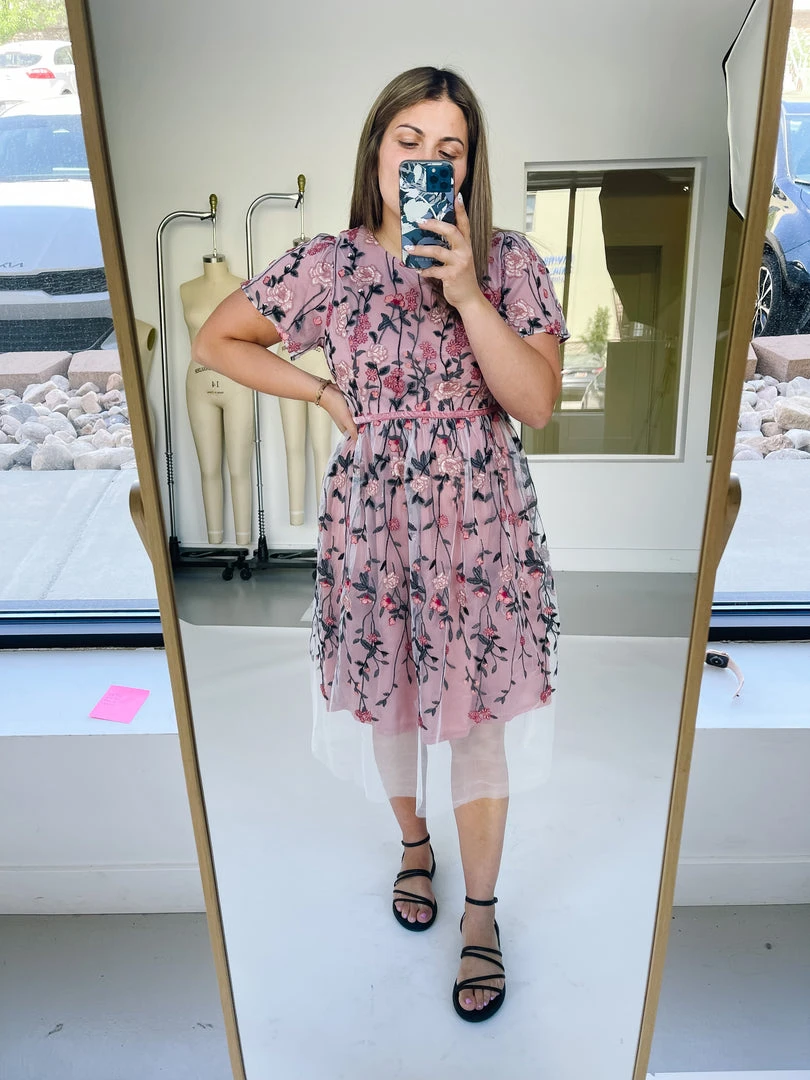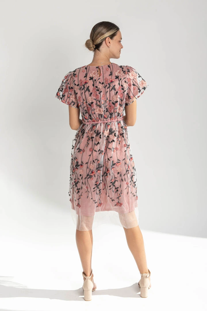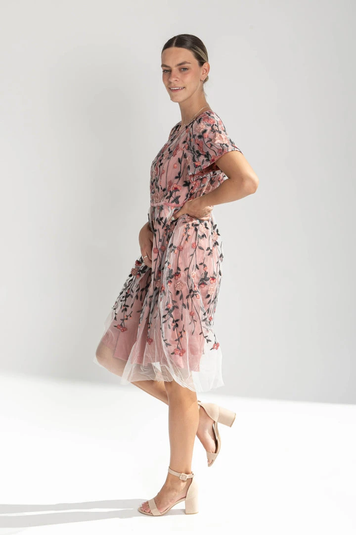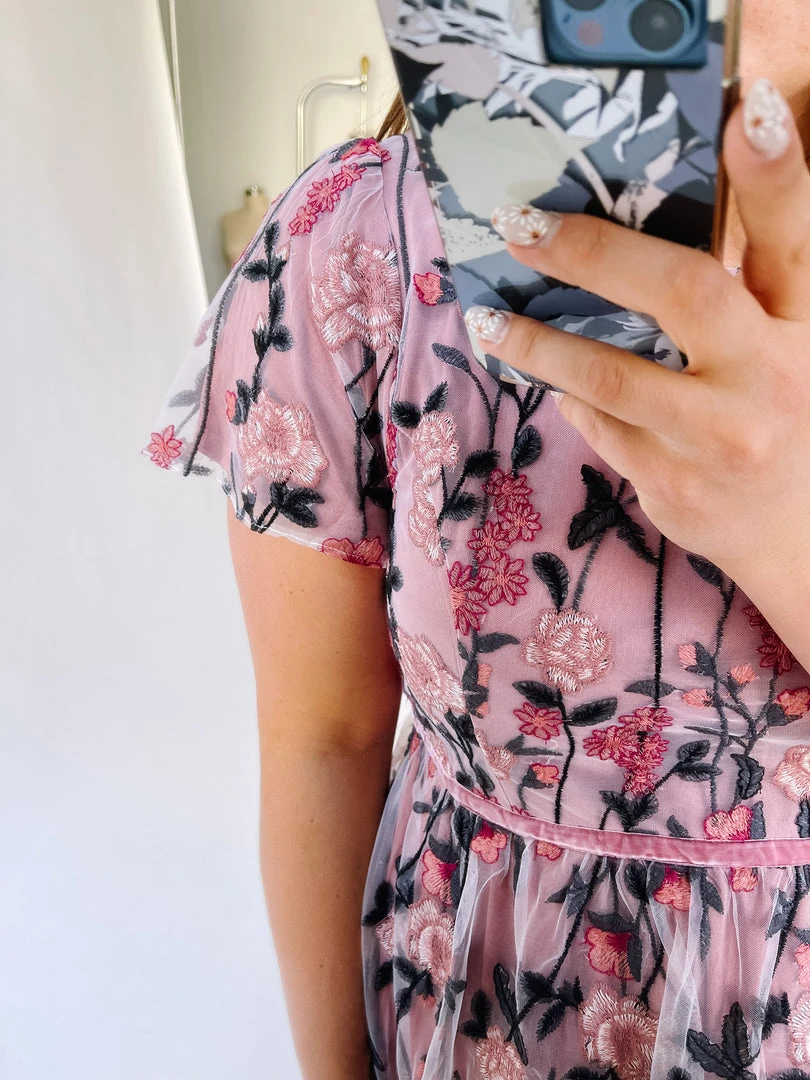 The Asha Embroidered Lace Detail Dress is blush- colored with a tulle embroidered overlay. It has a velvet trim detail around the waistline. This dress has pretty party vibes all over it.Â