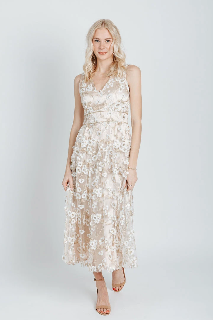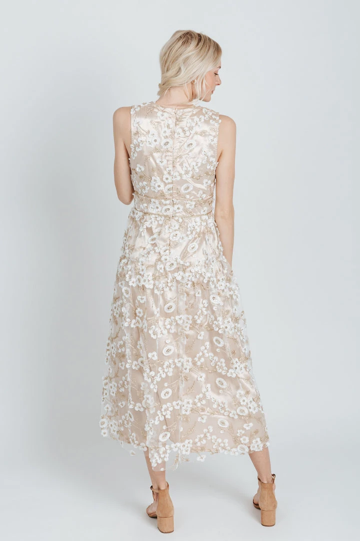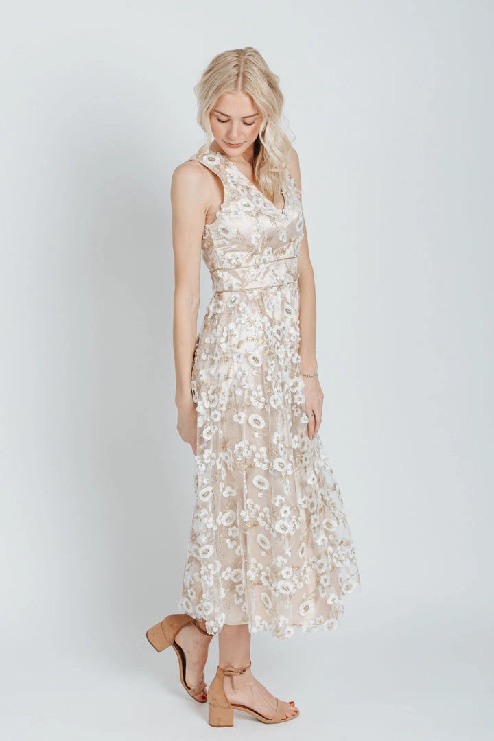 This dress was made for memories. The Berkley Floral Detail Dress has a rose gold metallic satin lining with a textural floral lace overlay. It is a tank style with a v-neckline. It has a structured waistline with zipper closure in the back.