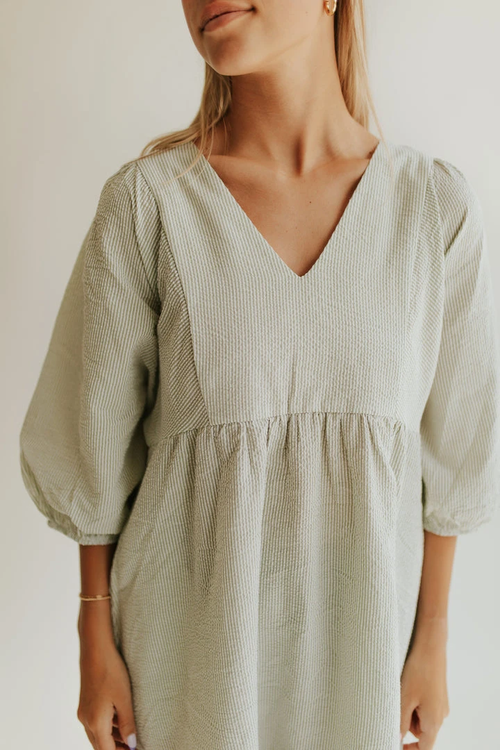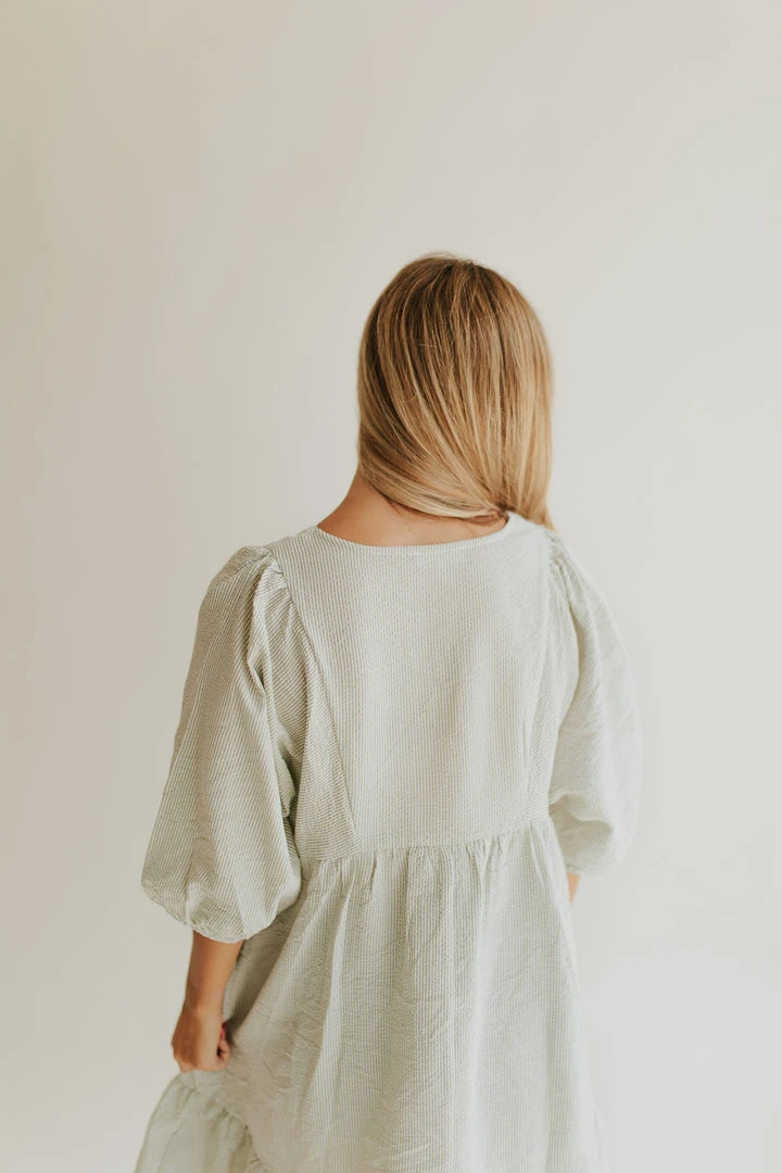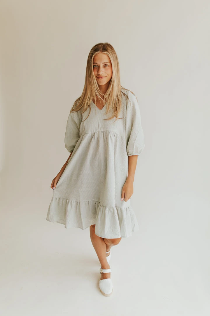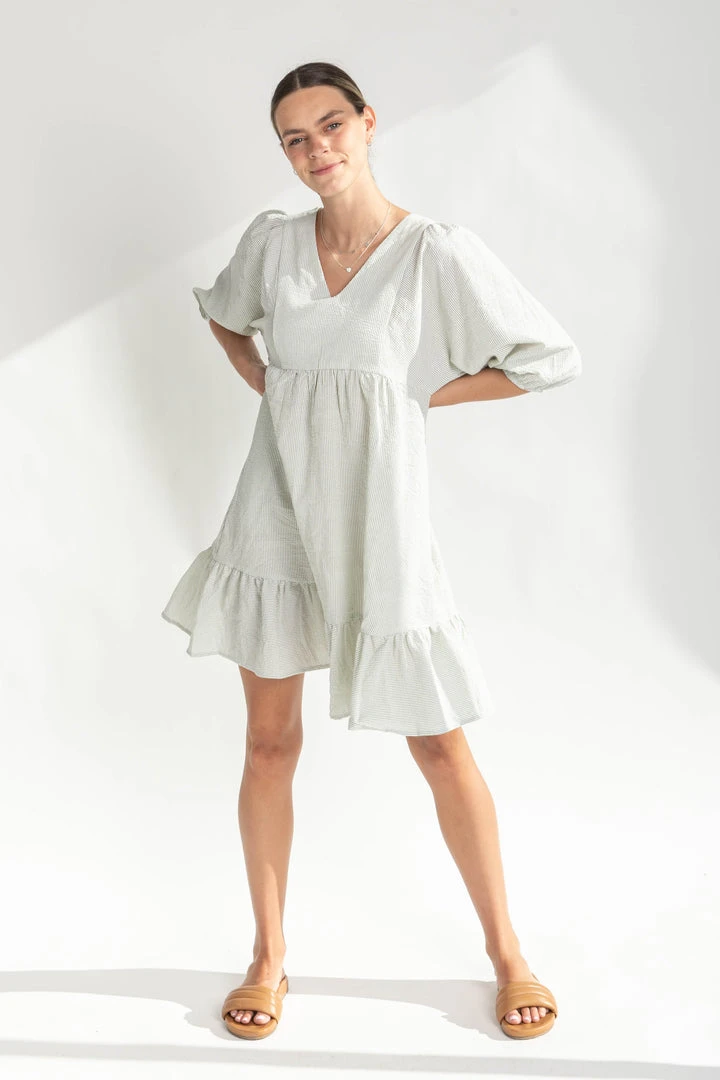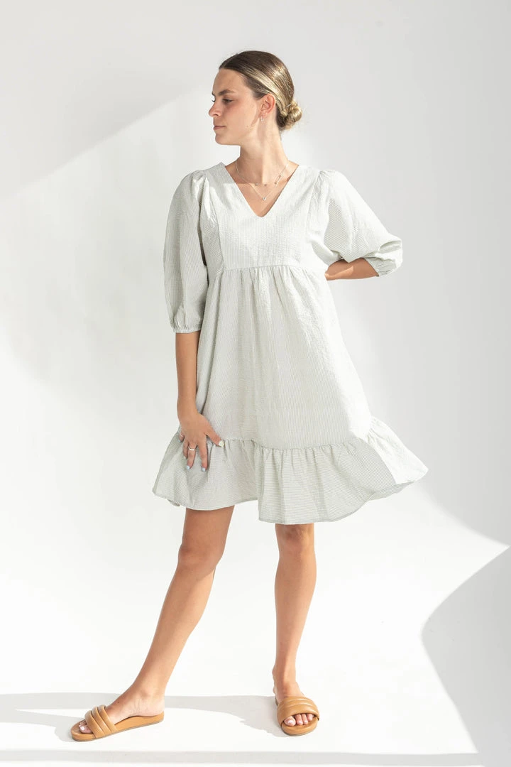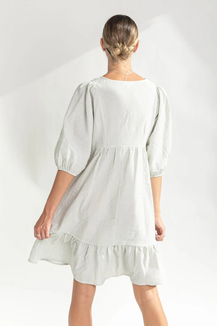 The Bodie Seersucker Textured Dress is a classic style with an updated fit. It has a v-neckline, a shorter + structured silhouette, and a ruffled hemline. The puff sleeves add stylish volume.