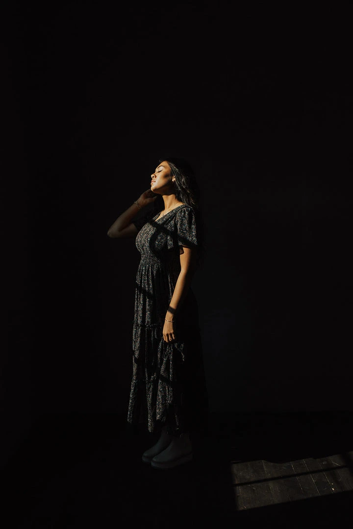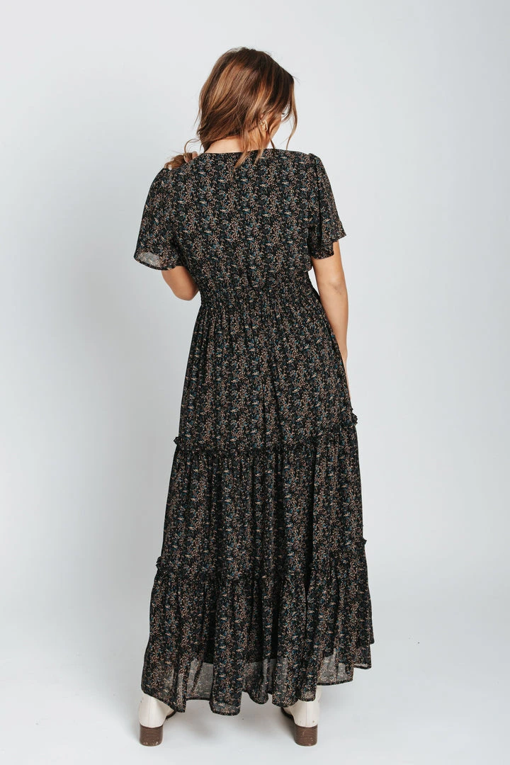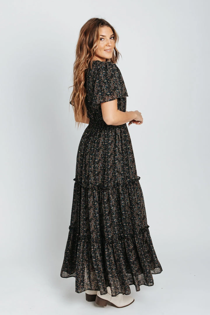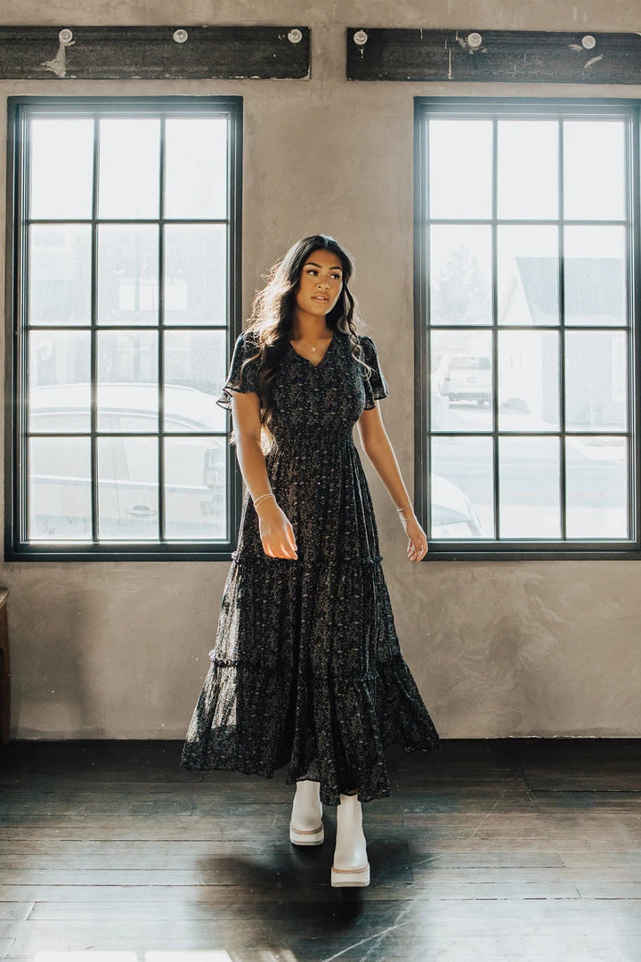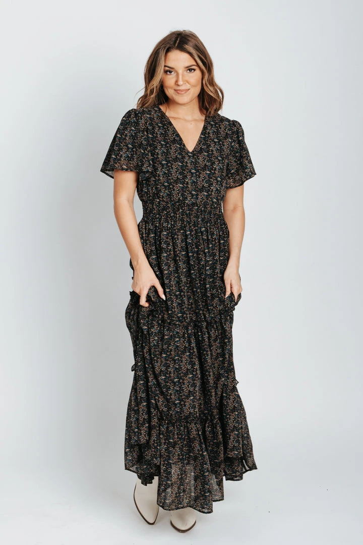 The Eden Floral Maxi Dress has a v-neckline, flutter sleeves, and a smocked waistline. The tiered skirt provides cute coverage. It’s been so popular that we’ve brought it back in black.Â