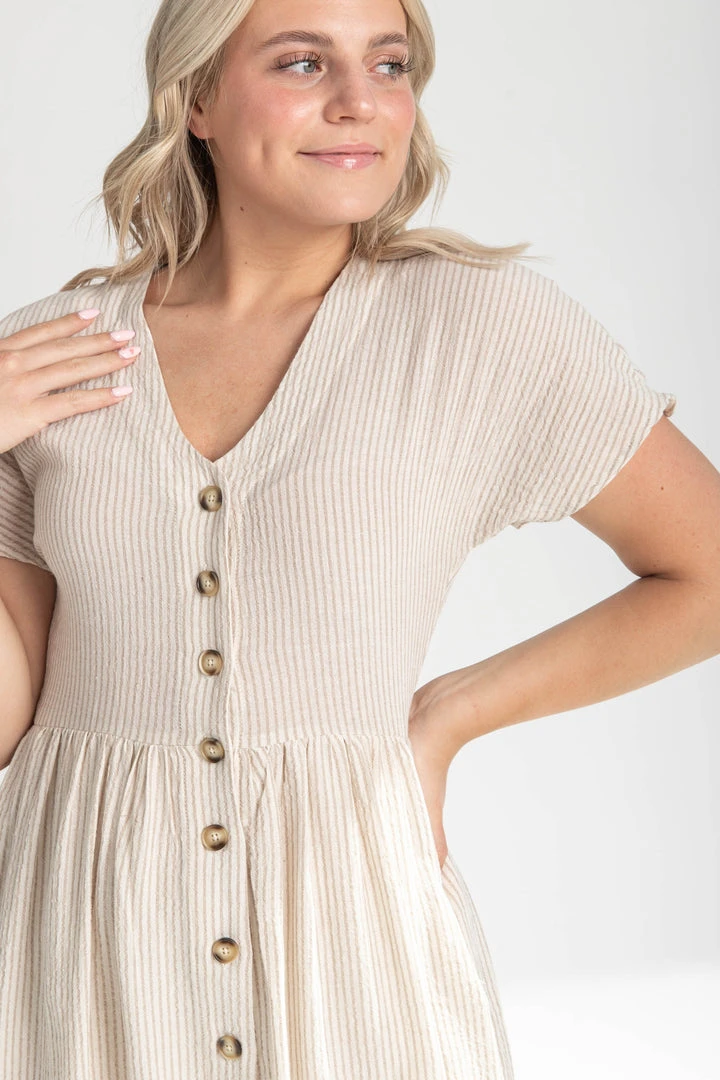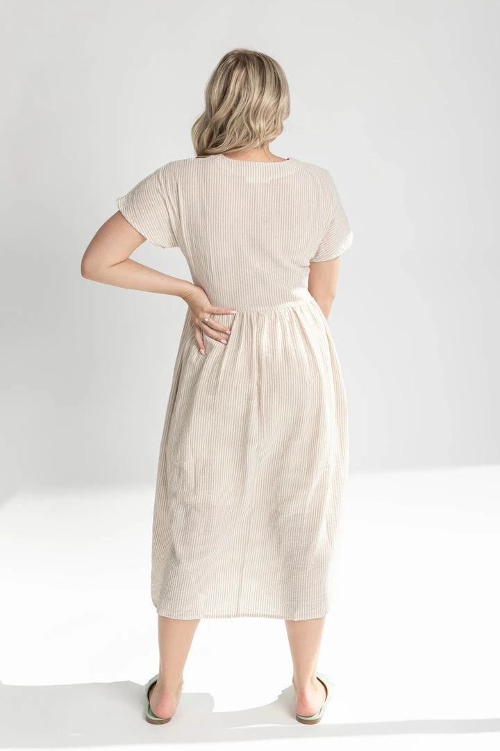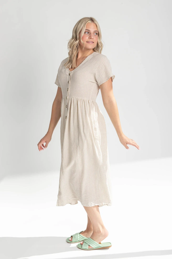 Simply stunning. The Helga Button Down Midi Dress is a light neutral with subtle vertical stripes + contrasting buttons down the front. It has a flattering fit + runs true to size.Â