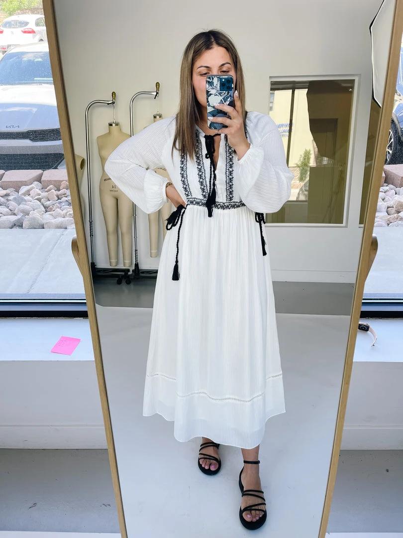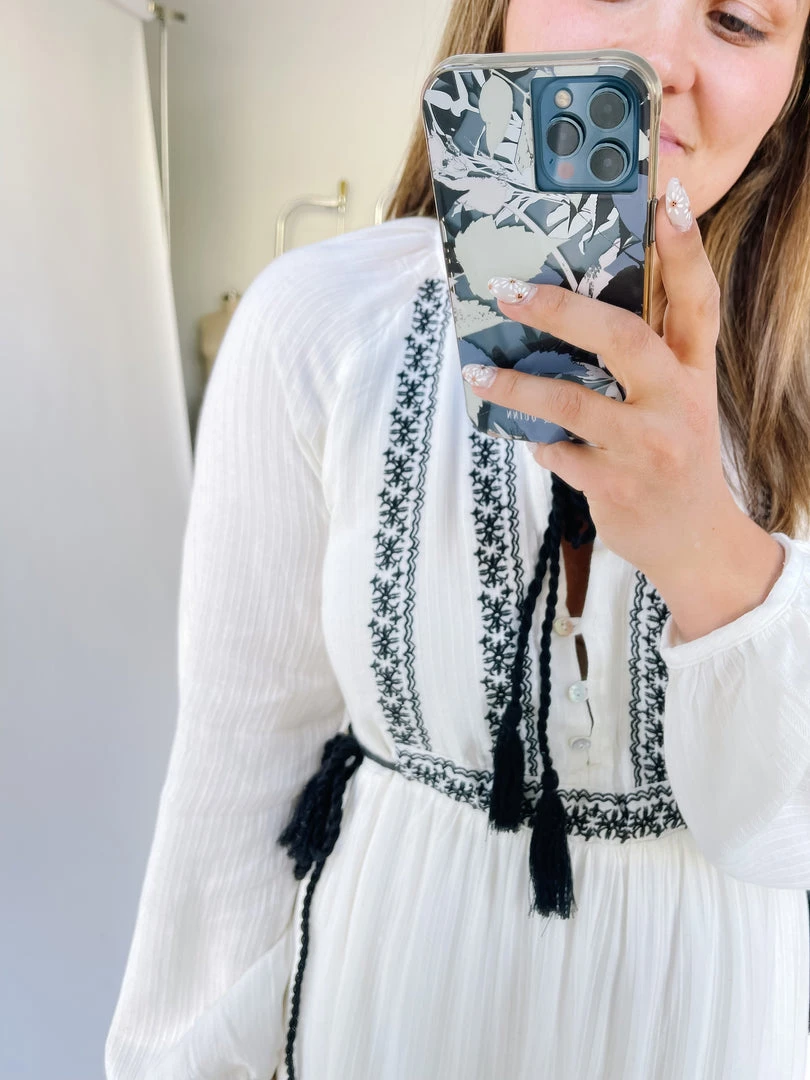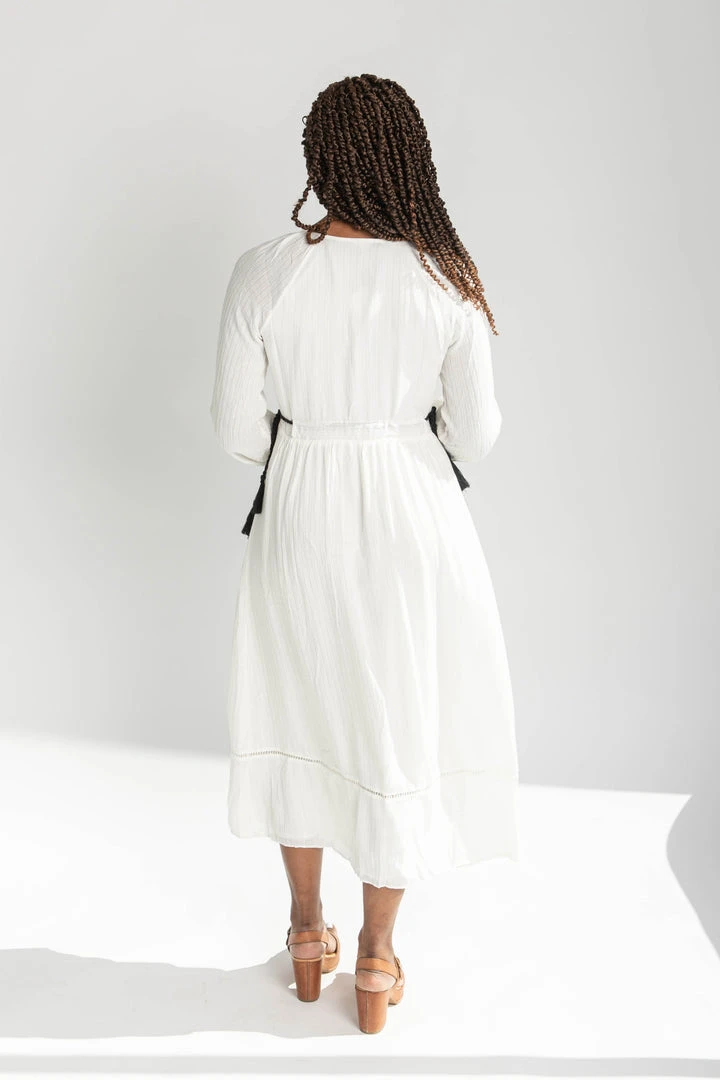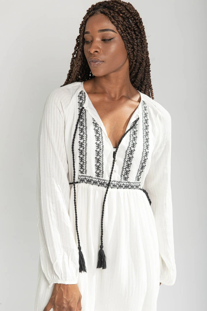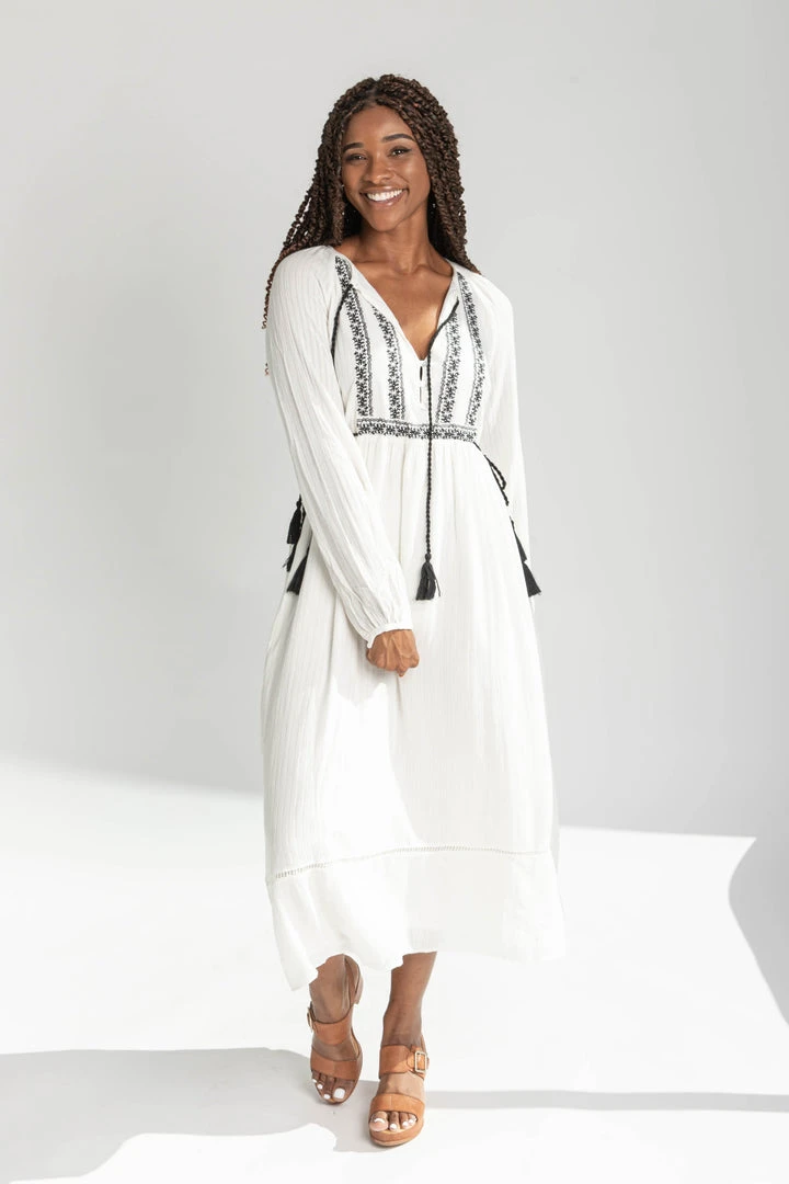 This maxi dress features black embroidery + tassel ties that offer textural detail + definition. It has breathable long sleeves. There are buttons down the top half.
