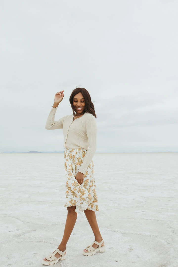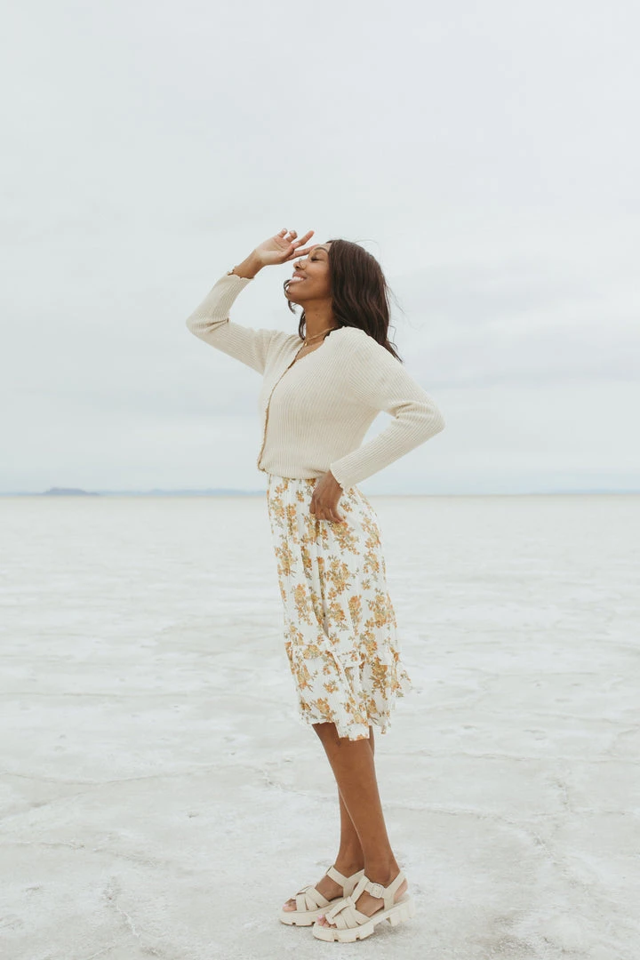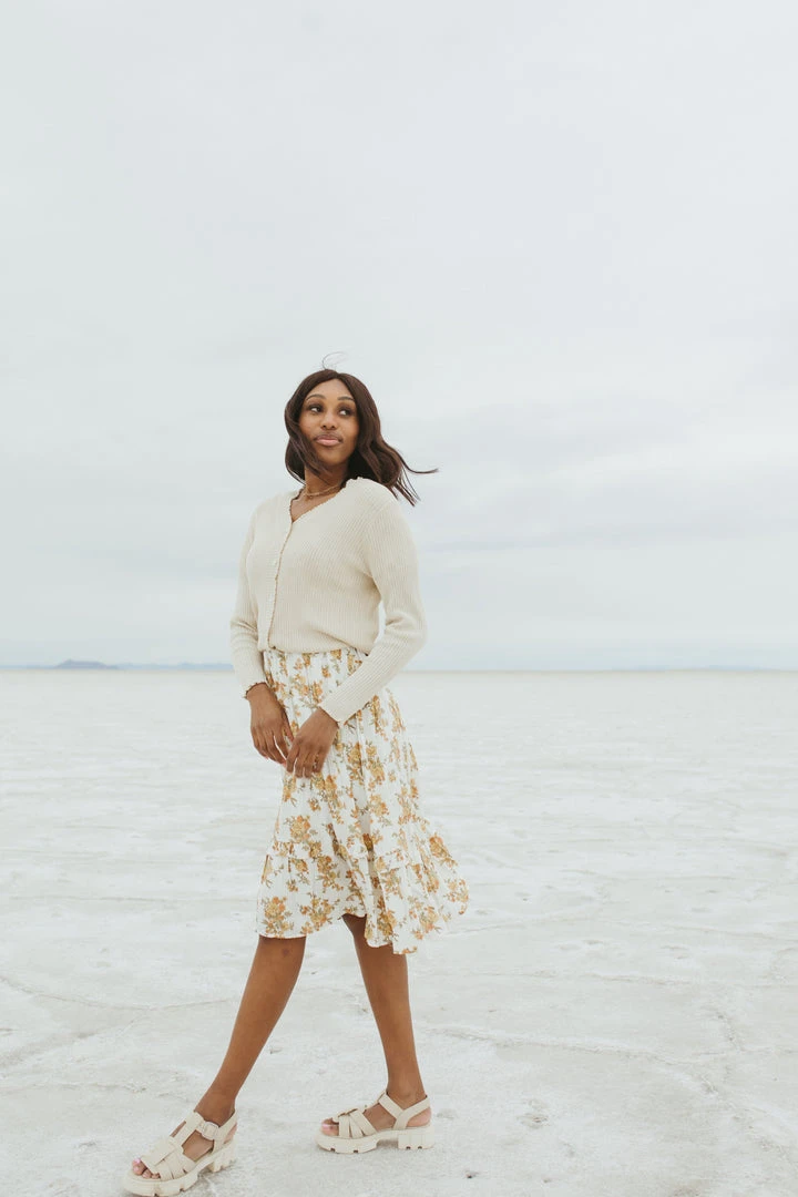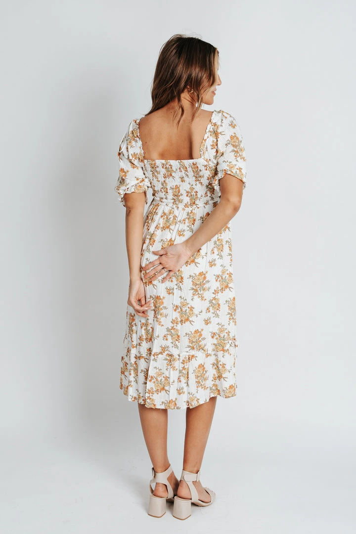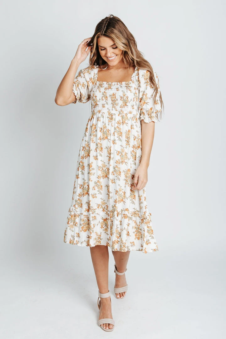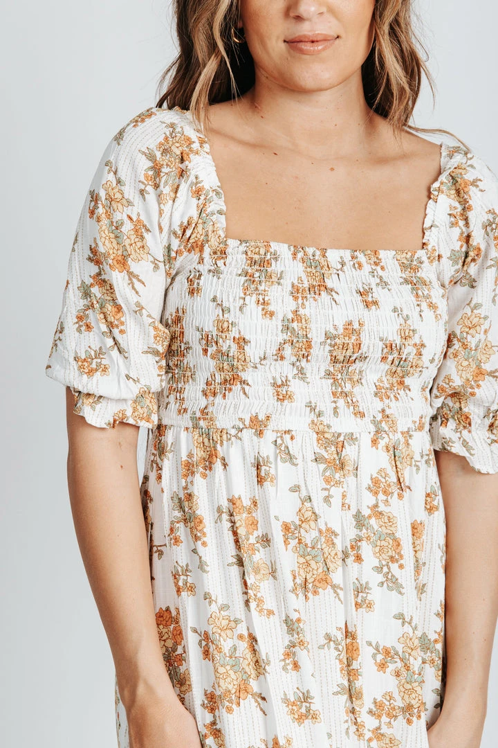 The Matthews Smocked Floral Dress features a neutral-colored floral print that feels fresh + timeless. It has a square neckline with a smocked bodice + an empire waistline. The sleeves have ruffled sleeves with elastic cuffs that mimic the ruffled hemline.