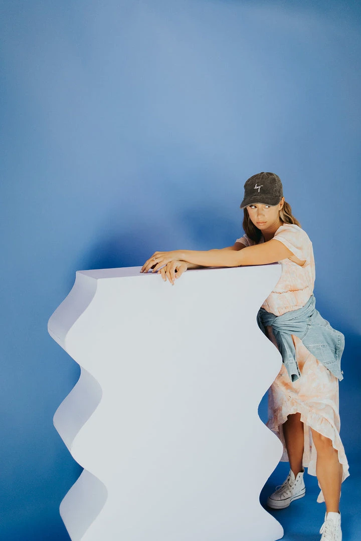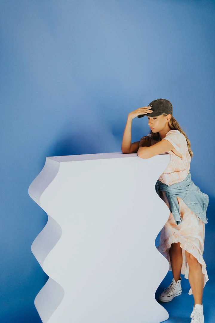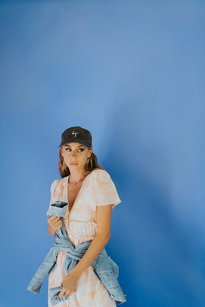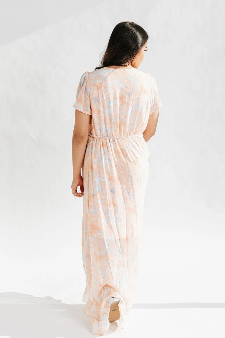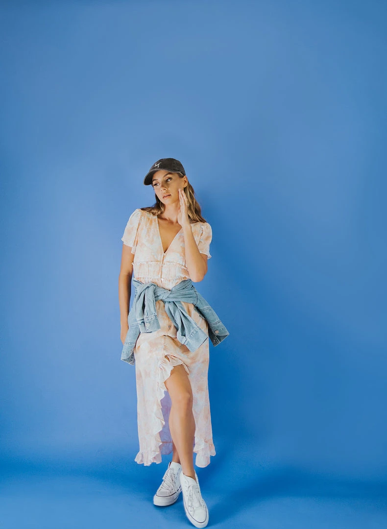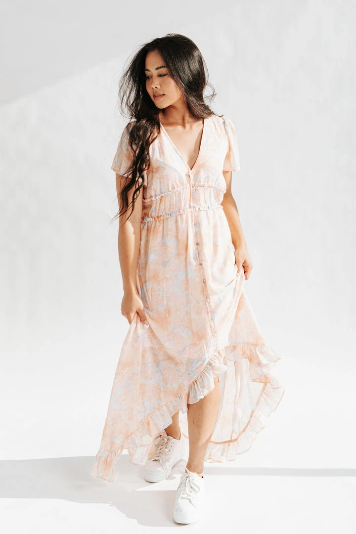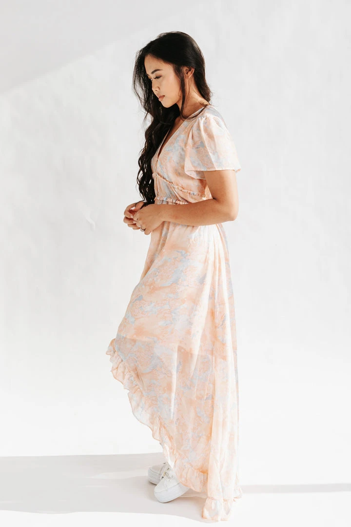 The Parsons Watercolor Dress is wearable art with an ethereal feel. This pastel peach dress is lined with a chiffon overlay. It has a flexible waistline that defines + flatters. It has a ruffled hi-low hemline.Â