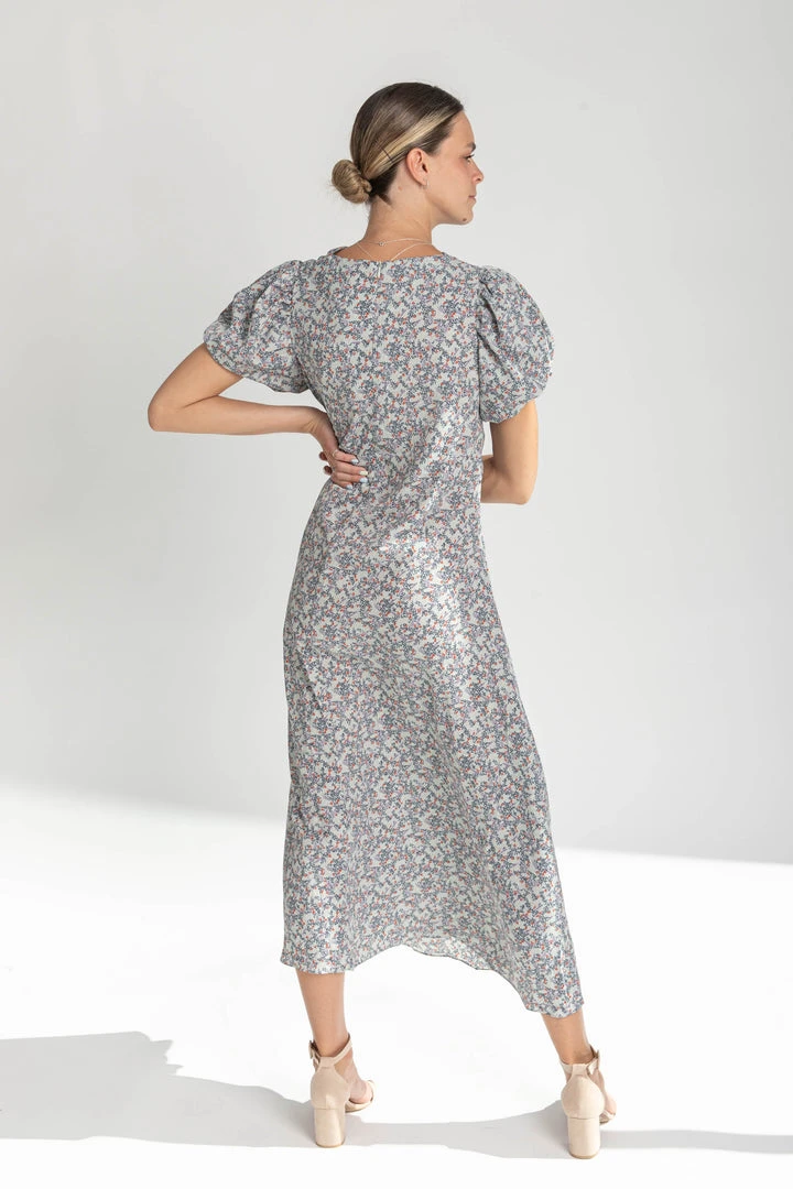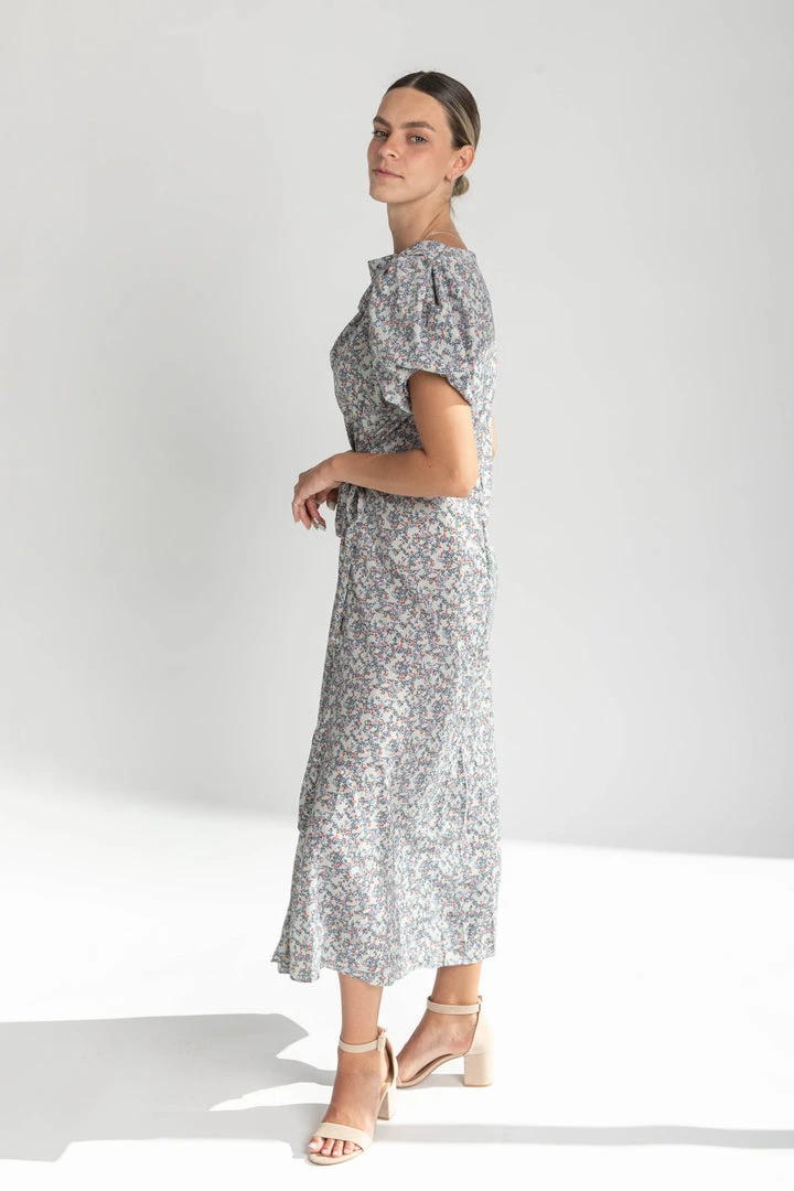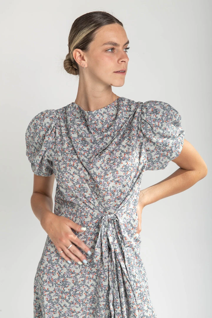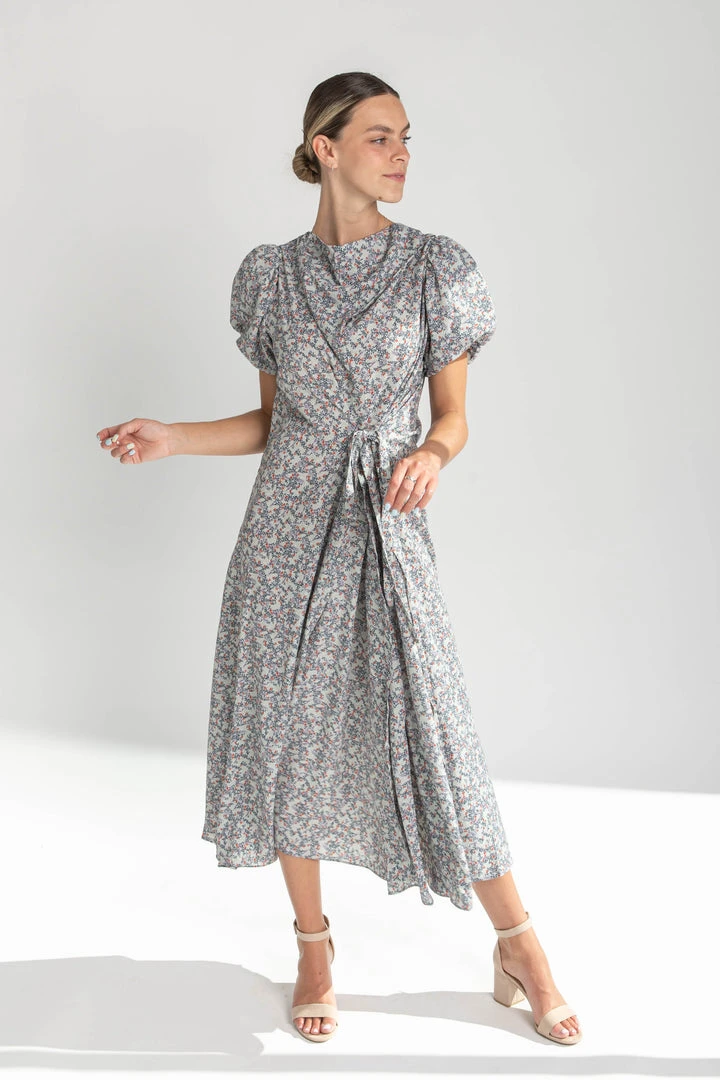 The Ramada Draped Neck Midi Dress has a timeless look with stylish draping across the bodice. It has puff short sleeves. It has a structured silhouette with an adjustable tie at the waistline.