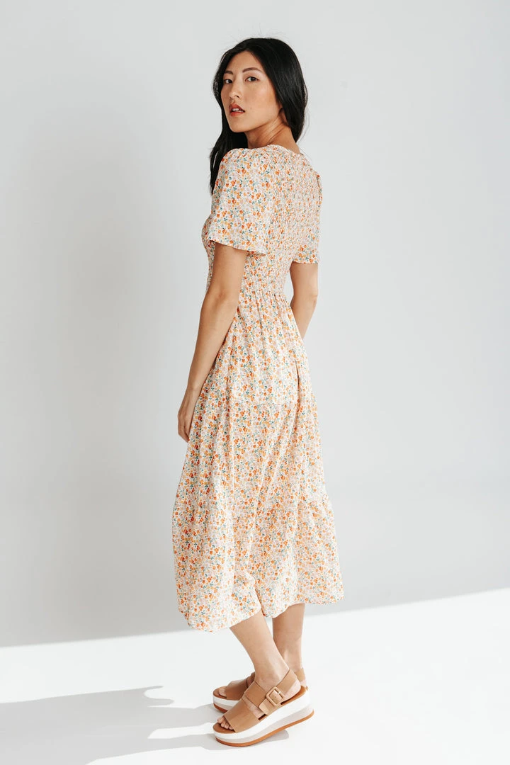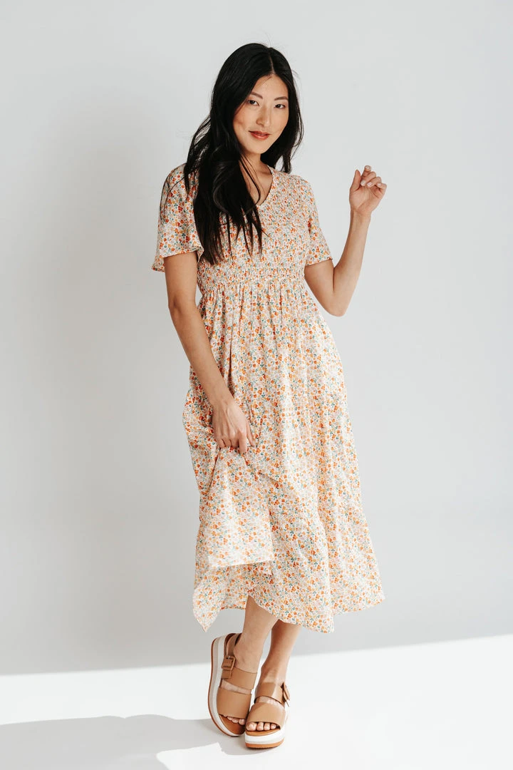 The Rodney Smocked V-Neck Midi Dress features a watercolor floral print. It has a flexible smocked bodice with a v-neckline + breathable flutter short sleeves. This dress is as versatile as it is comfortable in vibrant colors.Â