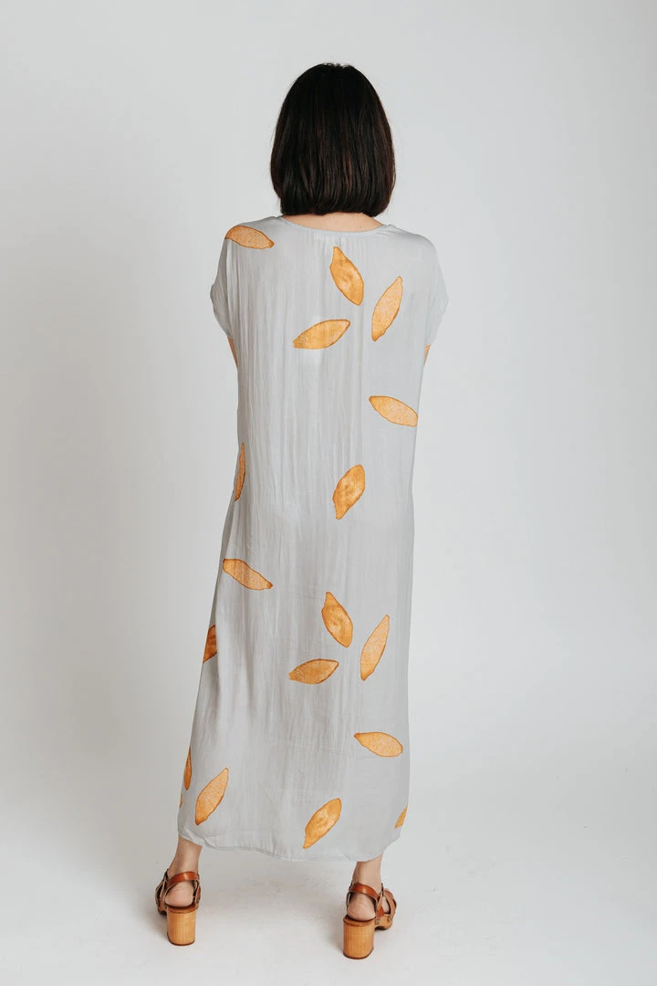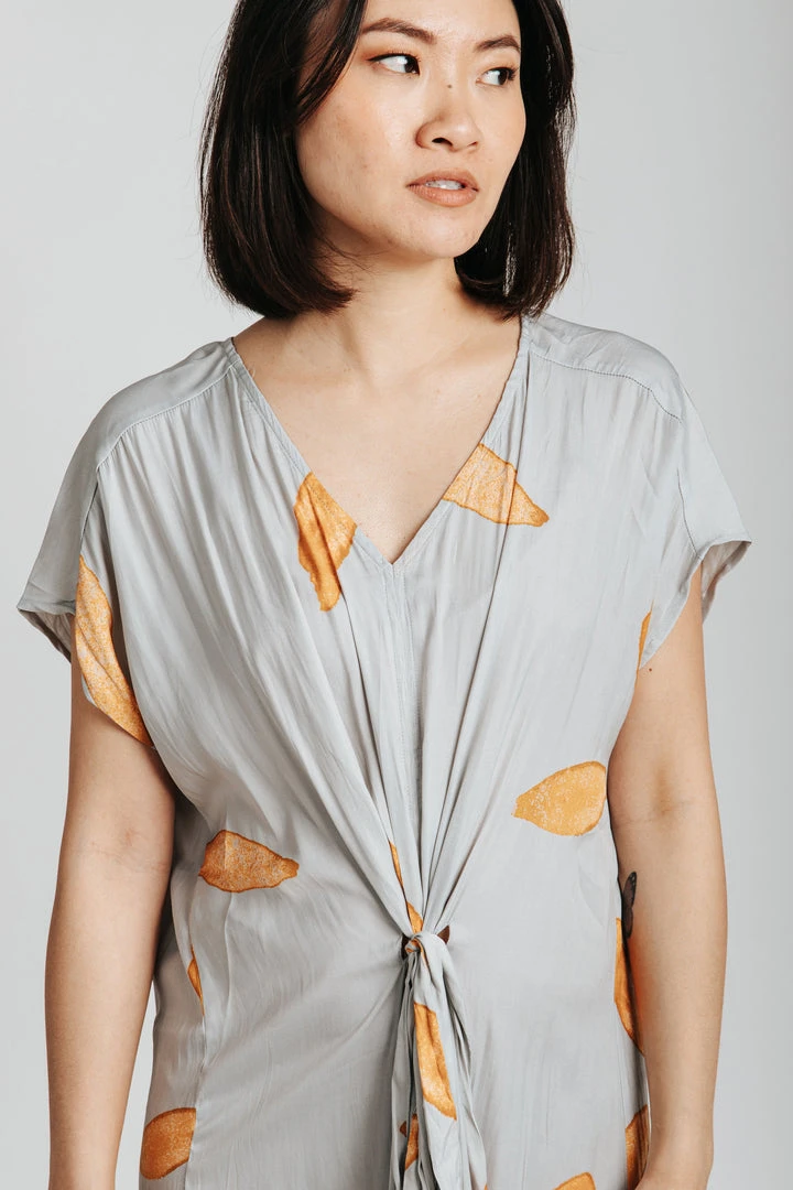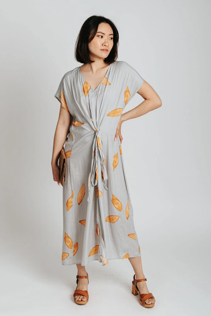 The Romy Satin Petal Dress has a v-neckline with an adjustable tie on the front of the waistline. It has a delicate petal print with a structured silhouette.Â