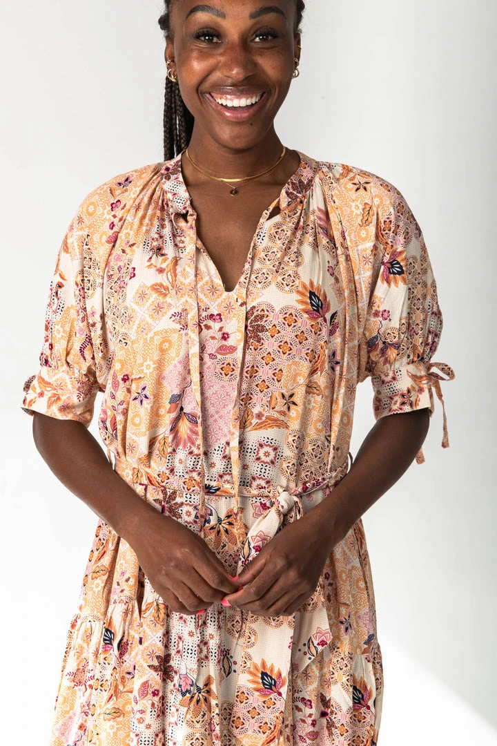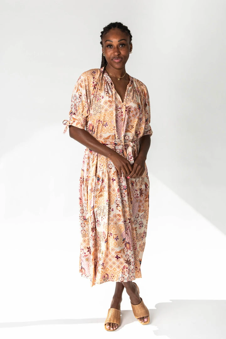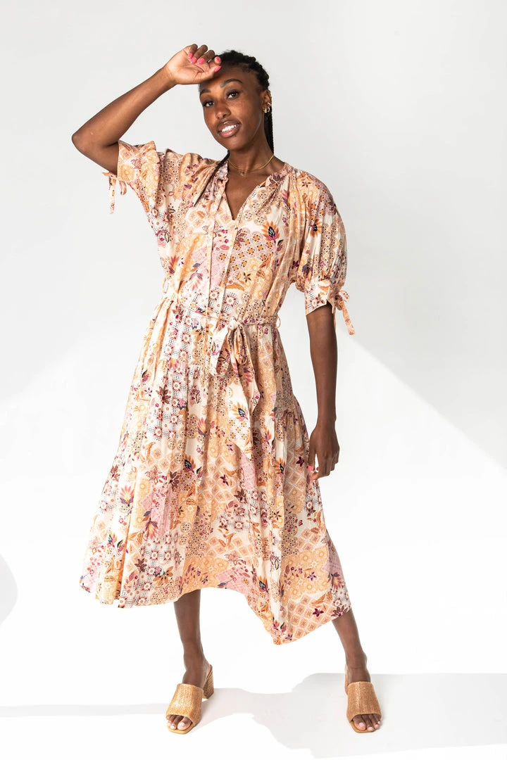 A stunning print in gorgeous colors?! Yes, please. The Rosalind Paisley Midi Dress has a v-neckline with ties. It has adjustable tie sleeves + an adjustable waistline with a tie. It is maternity friendly.
