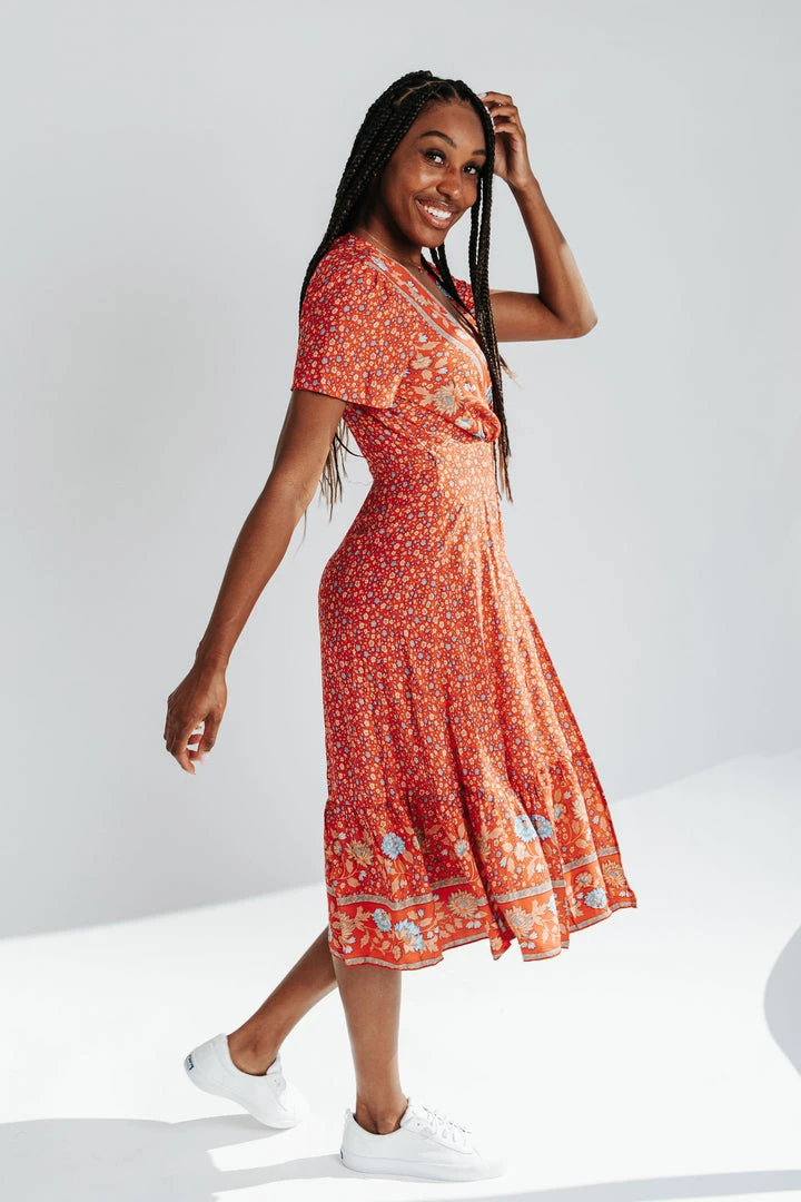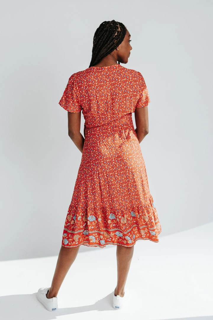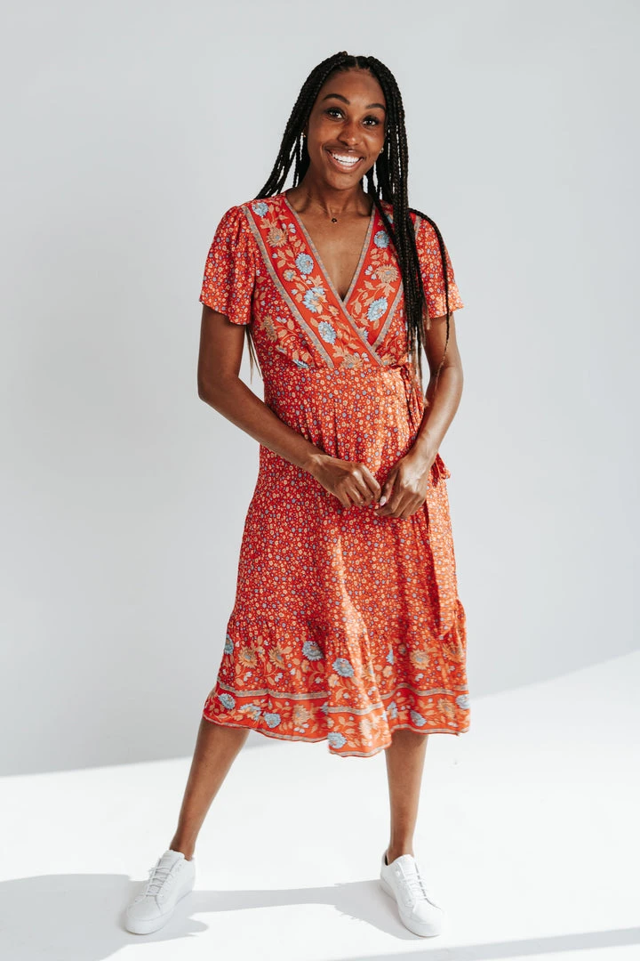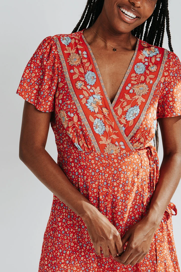 The Sandstrom Patterned Wrap Dress brings the color + the style. It features two floral prints in the same amazing color scheme. It has a wrap-style top with a tie under the bust. The hemline is ruffled.