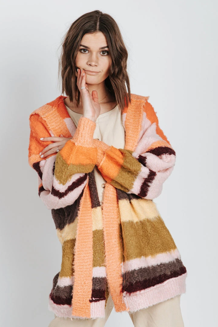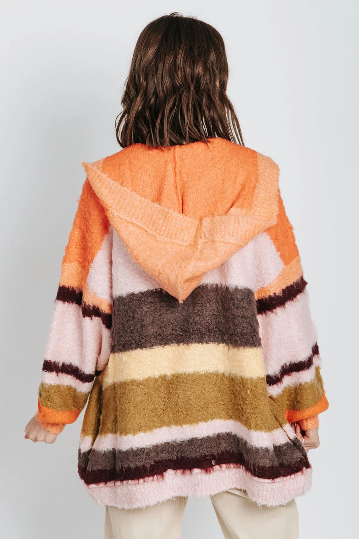 This open-style cardigan has drop shoulder long sleeves with ribbed cuffs + hemline. It has stripes + a hood! It is as cute as it is soft.