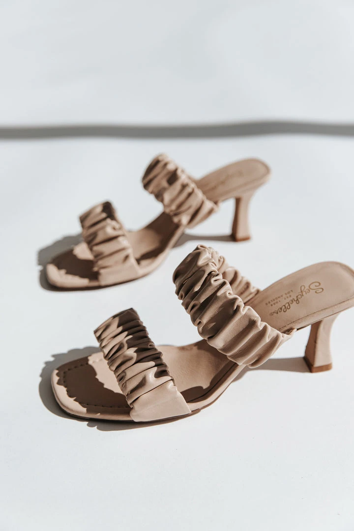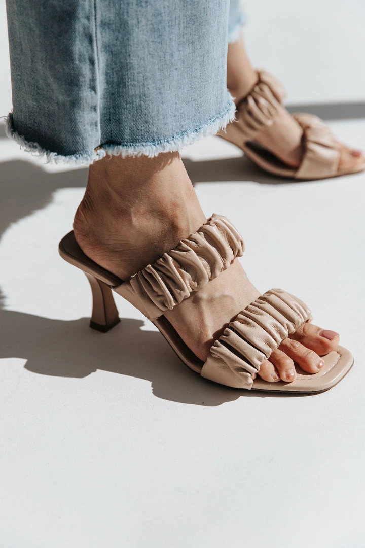 The Leeward Heels are an easy slip-on style with ruched satin straps across the front. They have a skinny heel + a square toe. They are sleek + stylish.