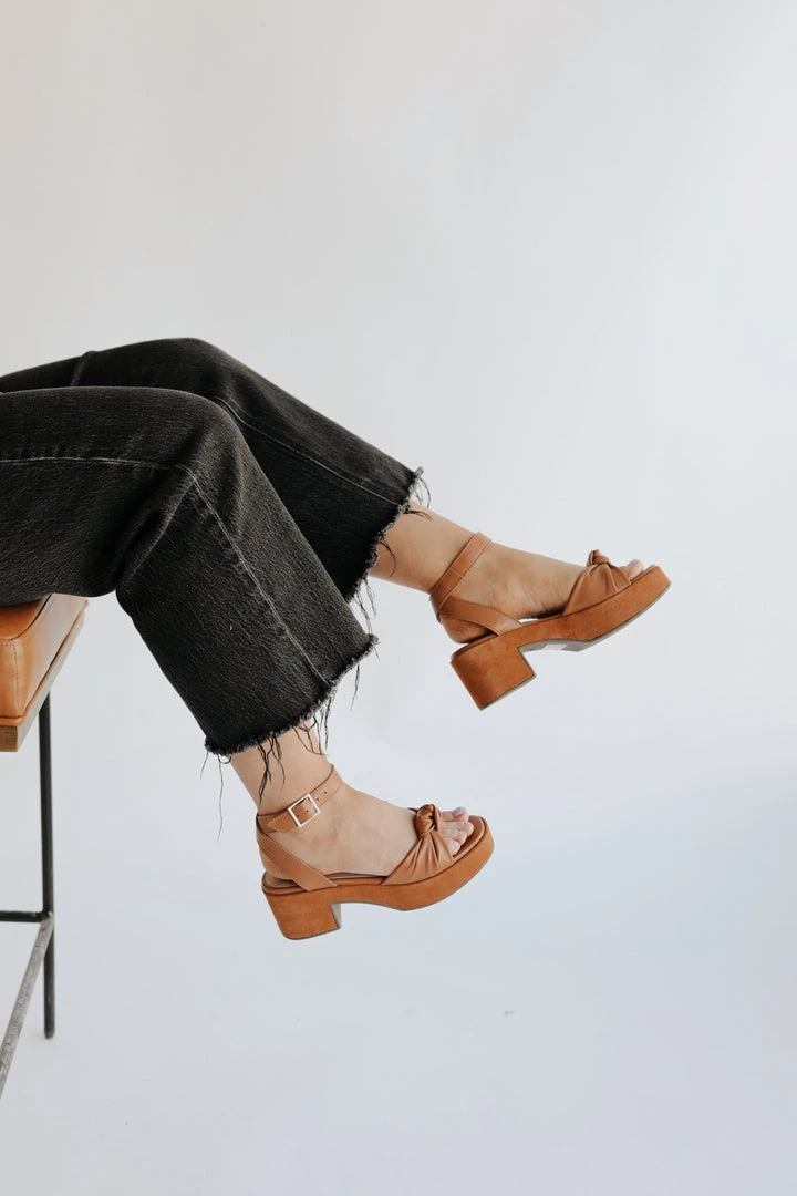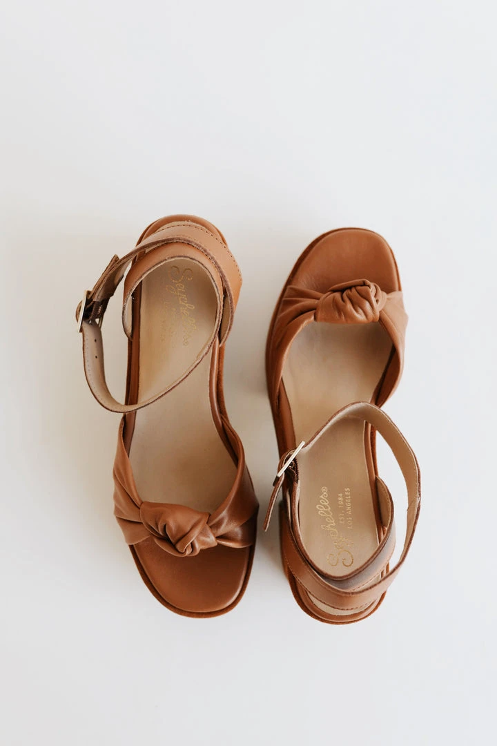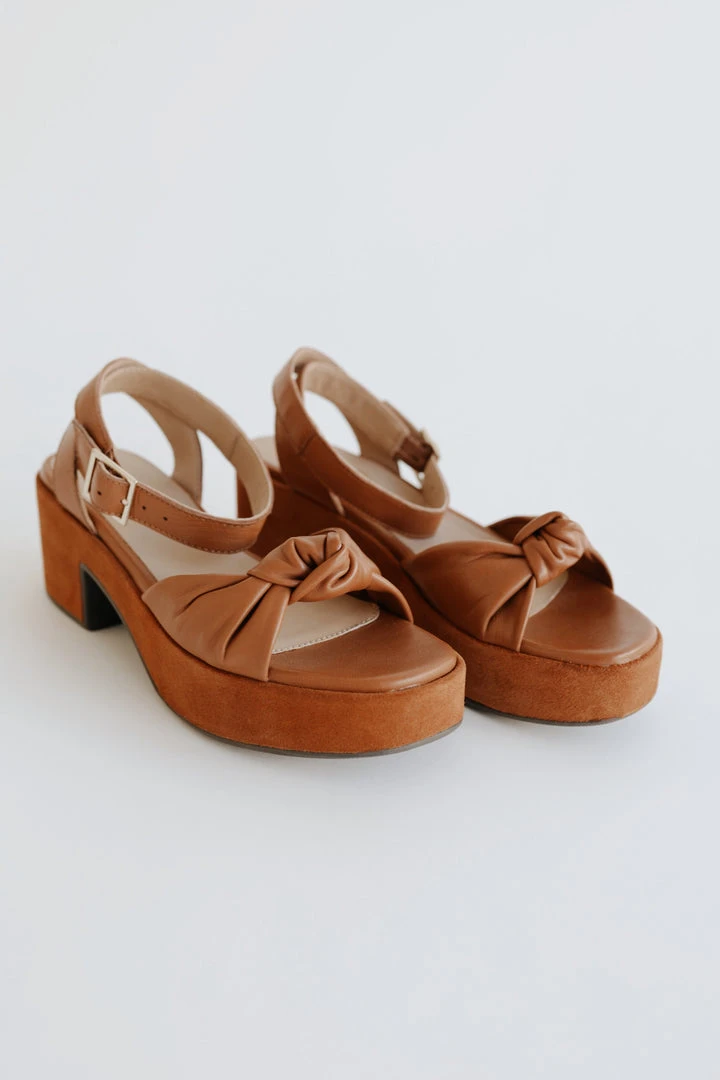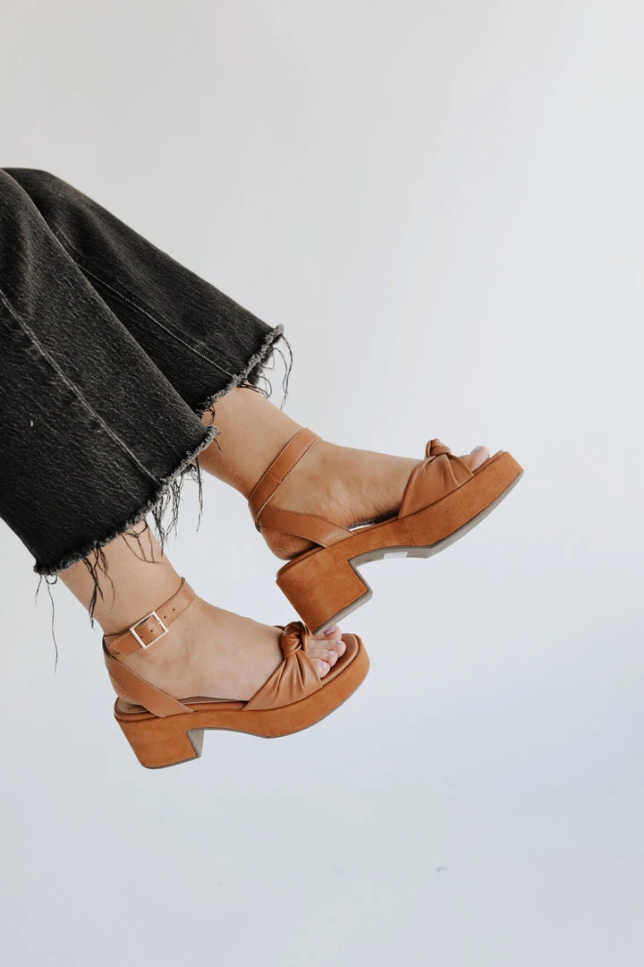 The newest style designed on our most-comfortable platform construction, this sweet sandal looks like a heel but feels like a flat. With feminine details like a knotted upper, leather wrapped platform, and adjustable ankle strap, this versatile shoe can be styled with ease.