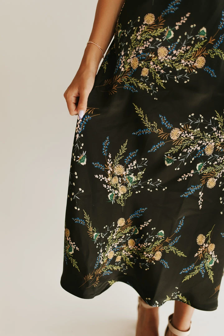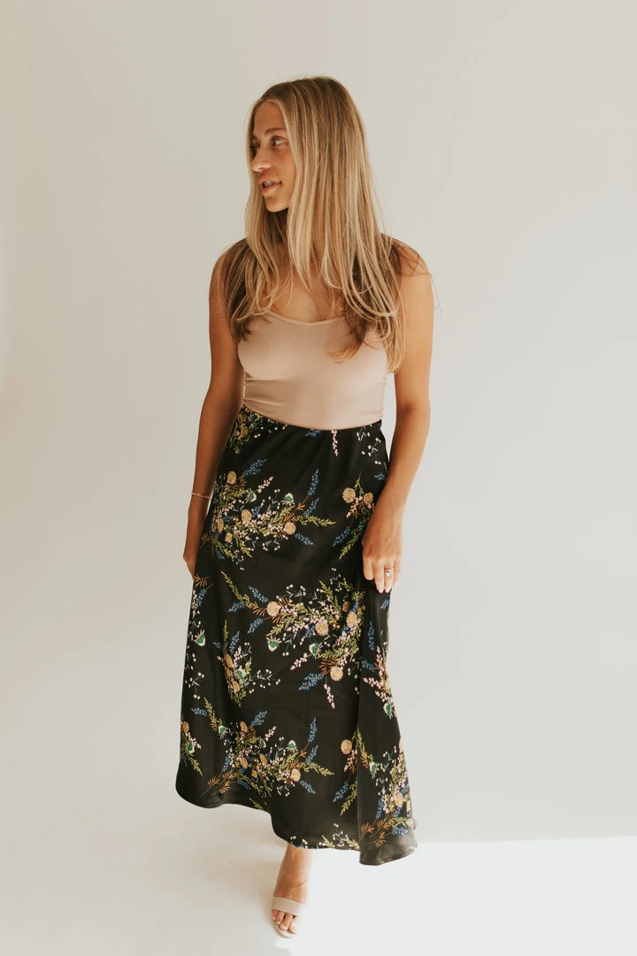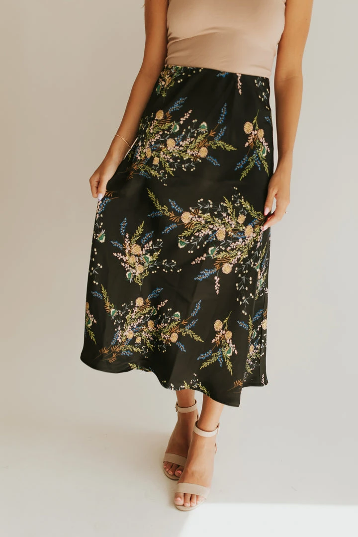 The Adelaide Floral Satin Skirt is a black slip-style skirt with colorful + unique floral print. It has an elastic waistline.
