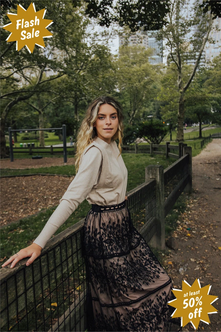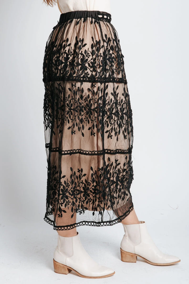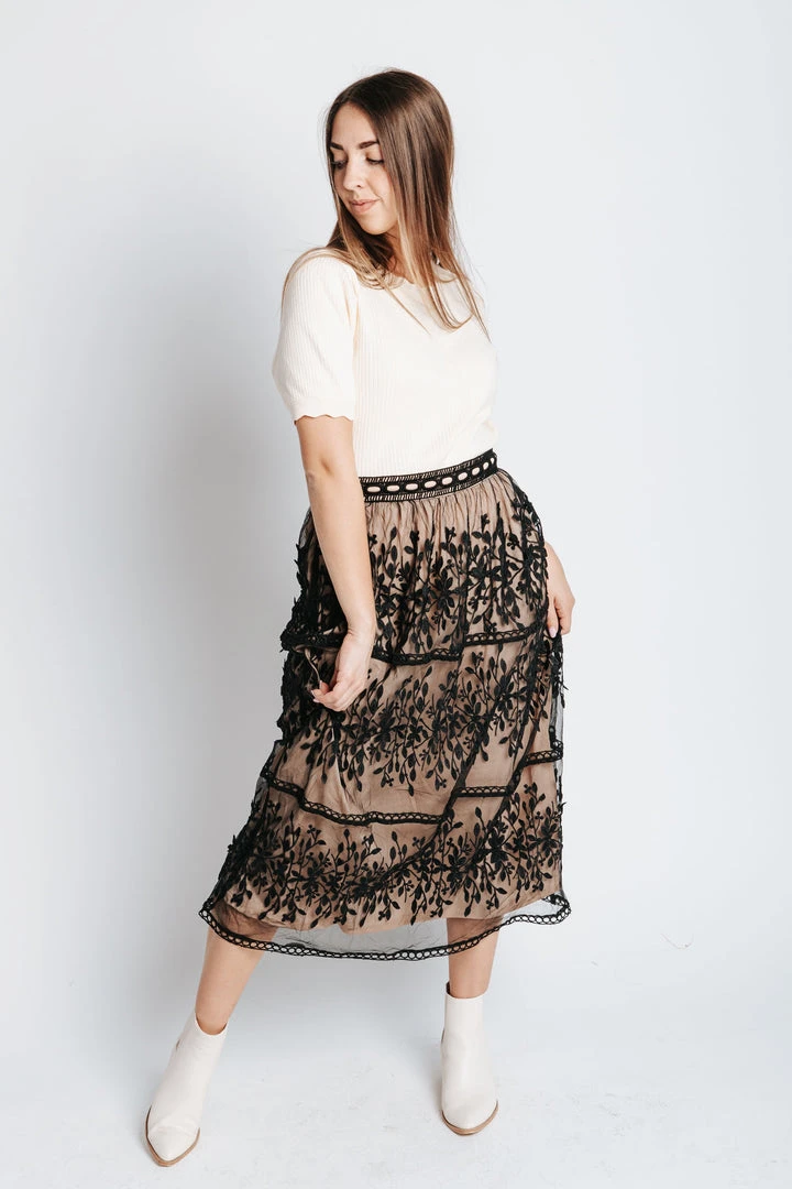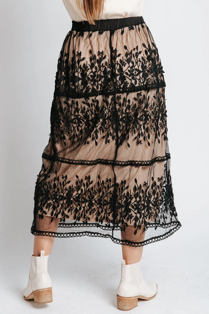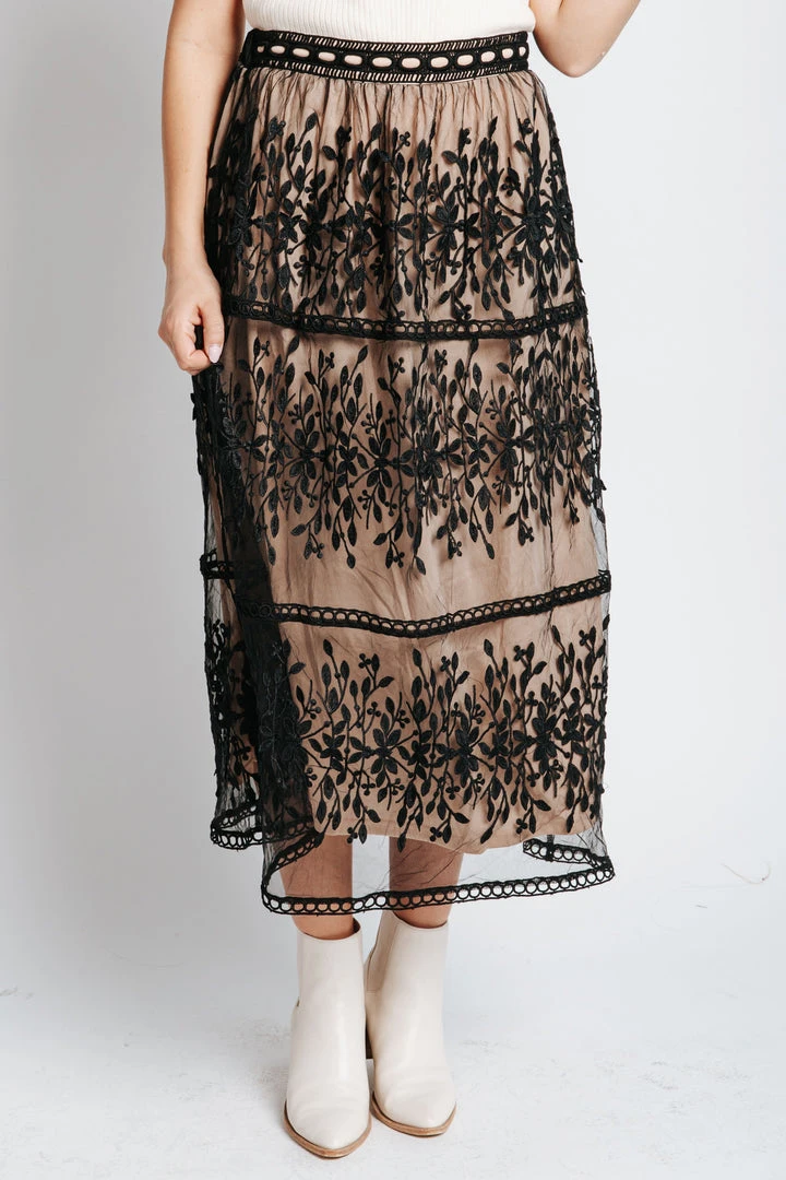 This skirt has a fancy look without sacrificing comfort. The Aimee Lace Detail Skirt has an elastic panel in the back of the waistline. It has a black lace overlay with a beige liner. It is perfect for any special occasion.Â