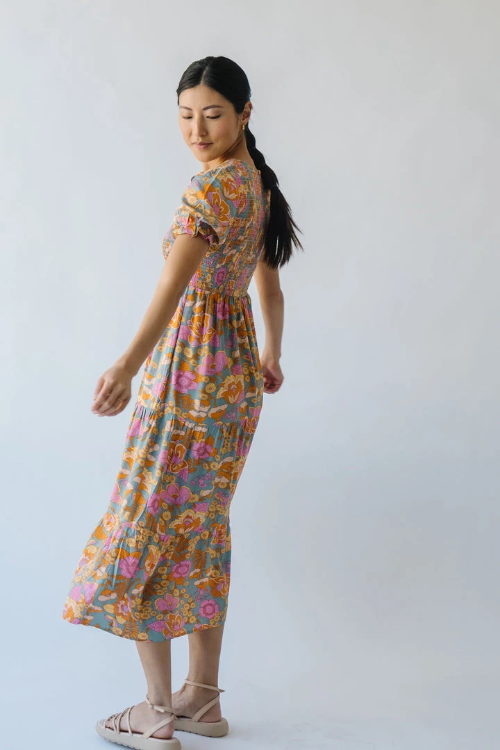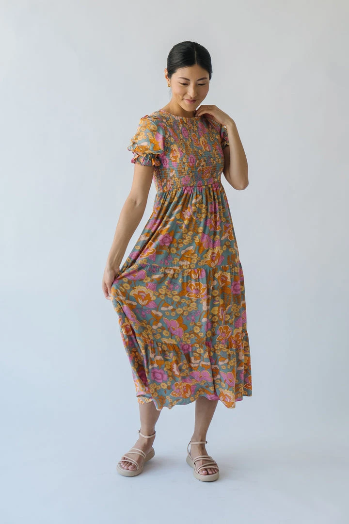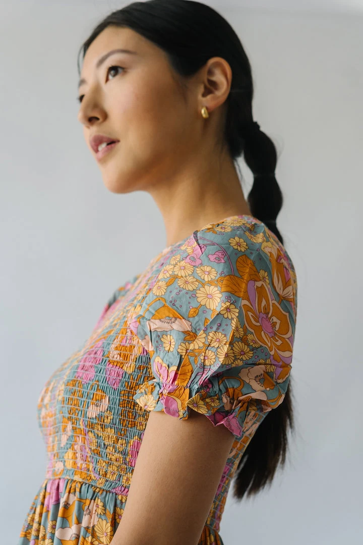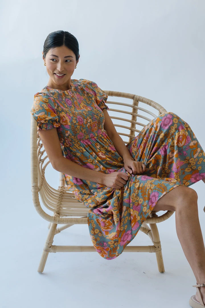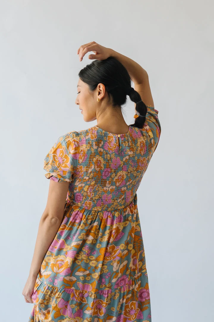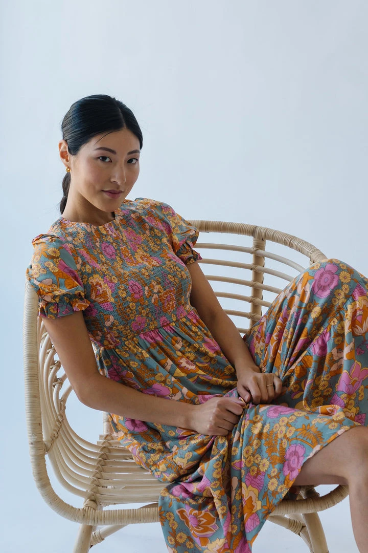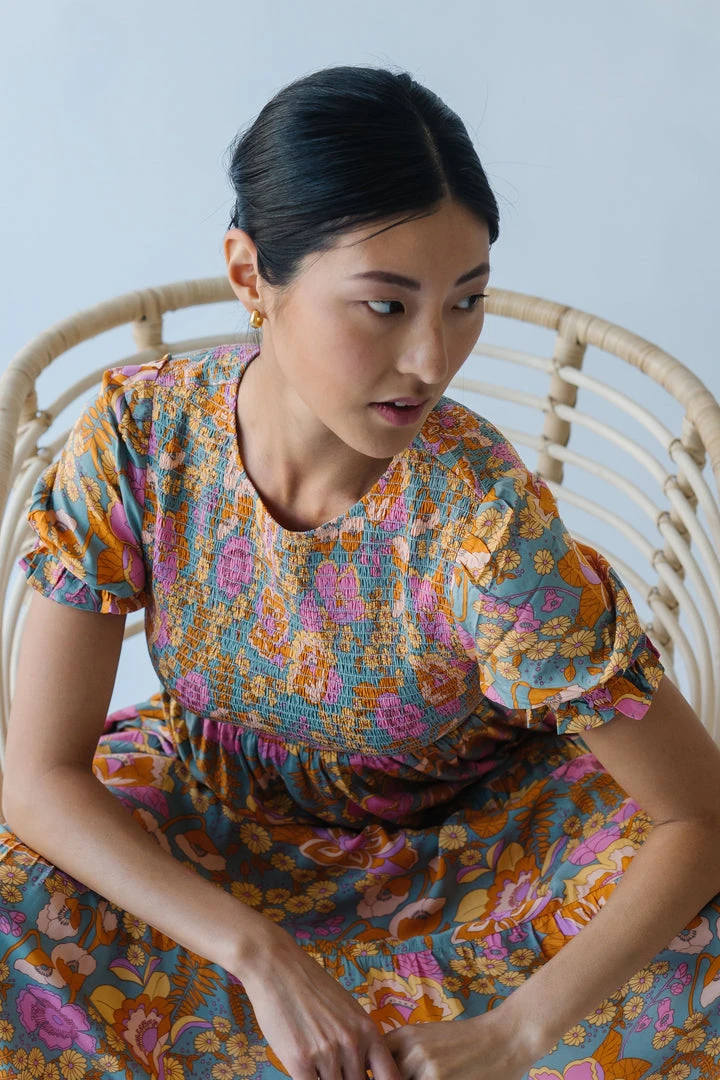 The Allred Puff Sleeve Midi Dress has a psychedelic floral print with ruffles short sleeves, a smocked bodice, and a tiered skirt. It is maternity-friendly.Â