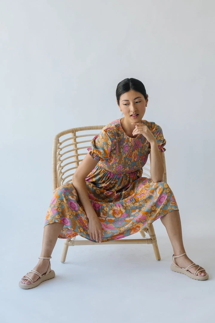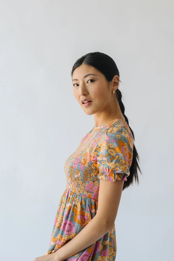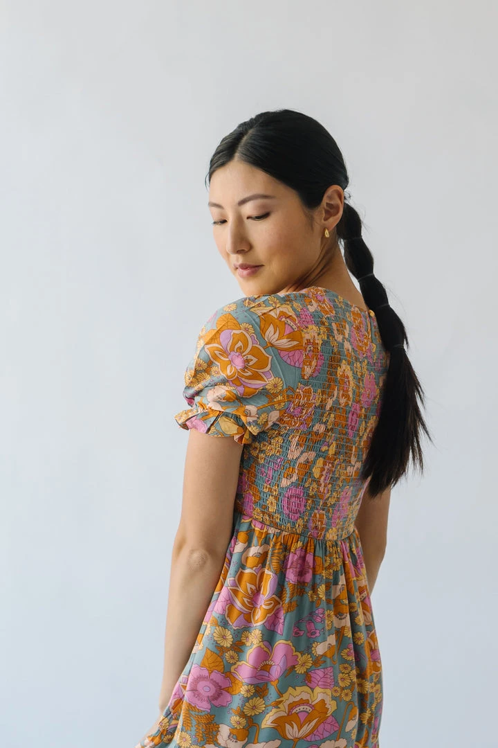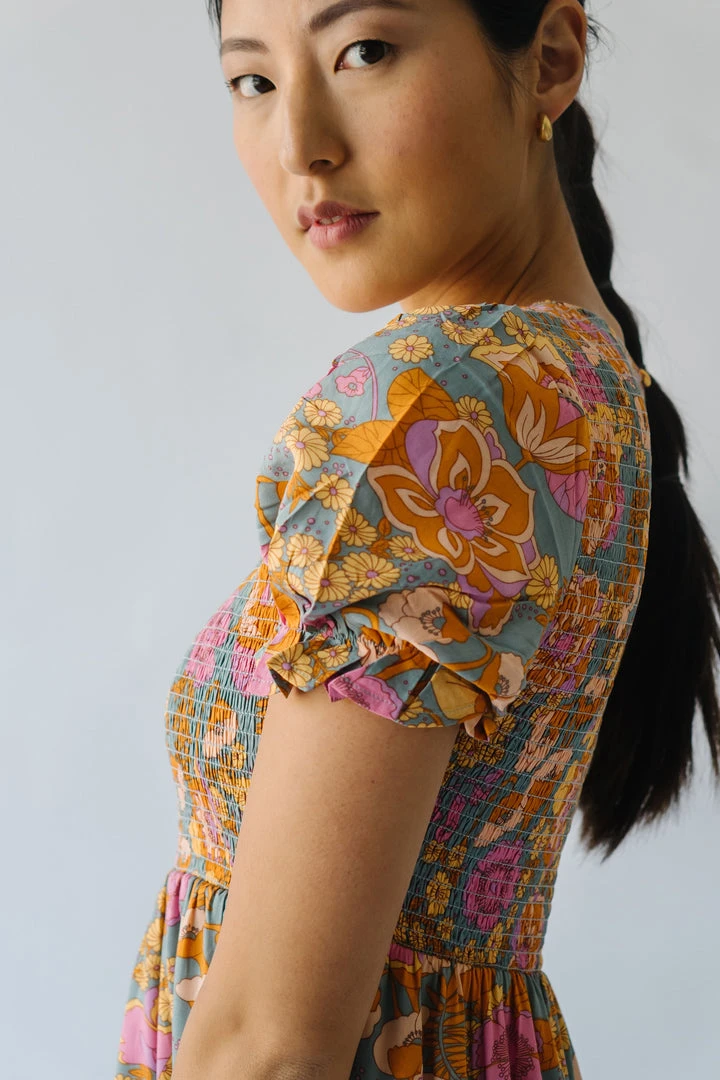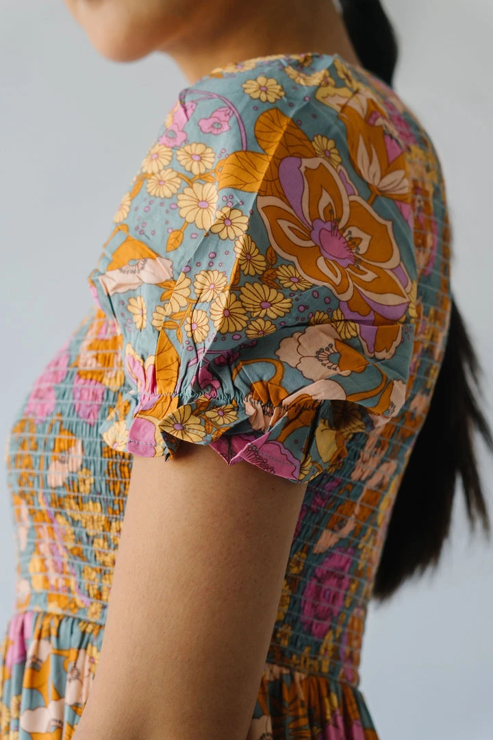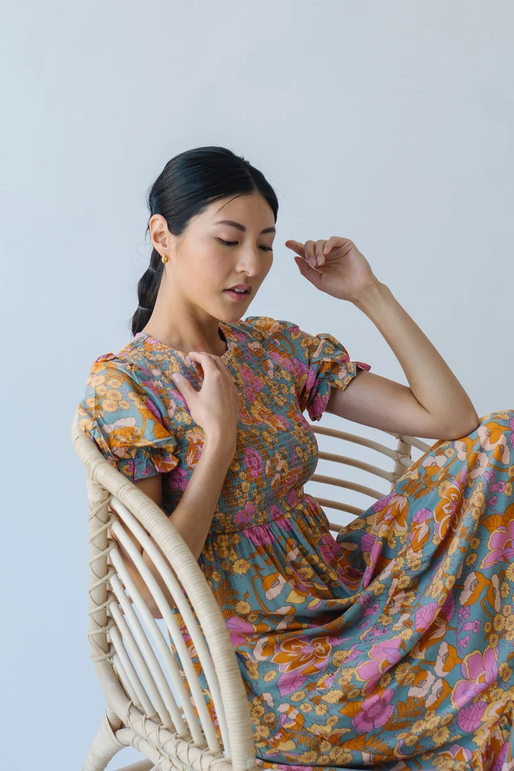 The Allred Puff Sleeve Midi Dress has a psychedelic floral print with ruffles short sleeves, a smocked bodice, and a tiered skirt. It is maternity-friendly.Â