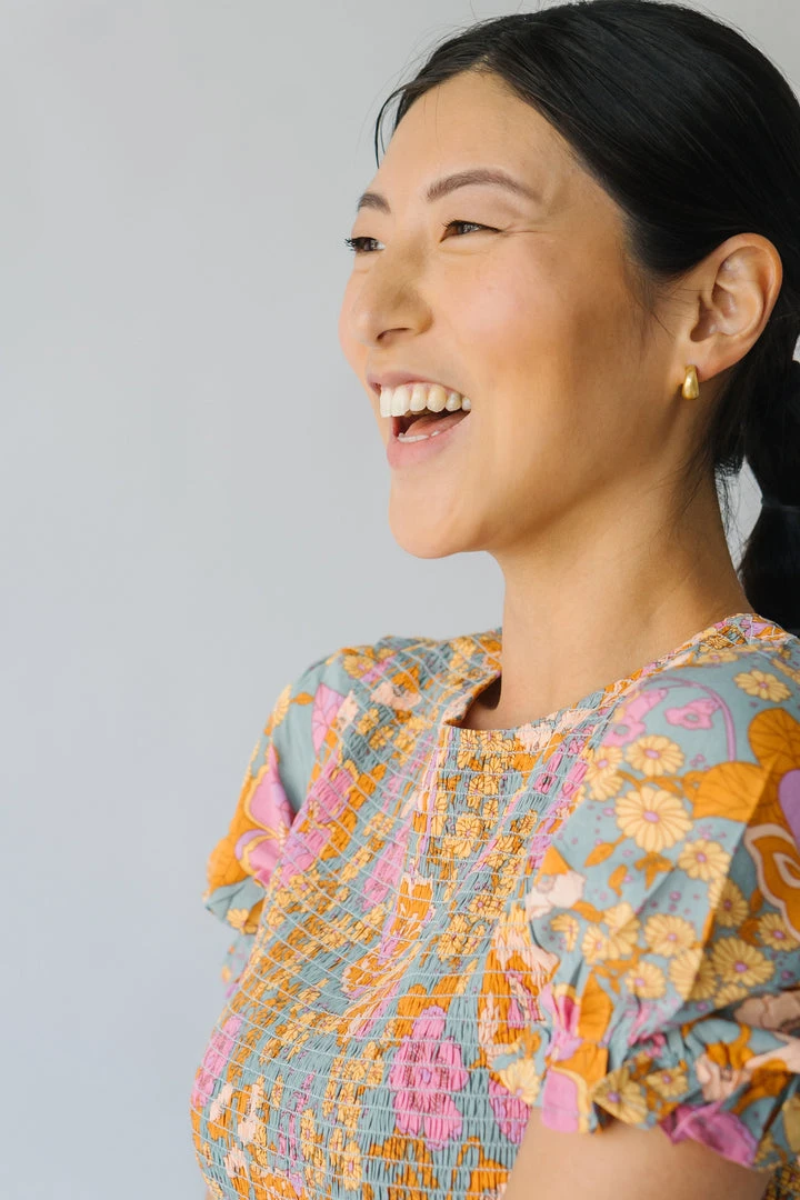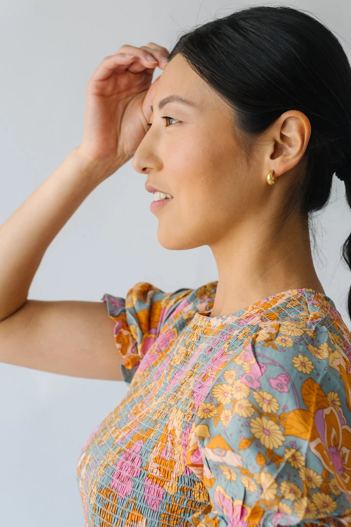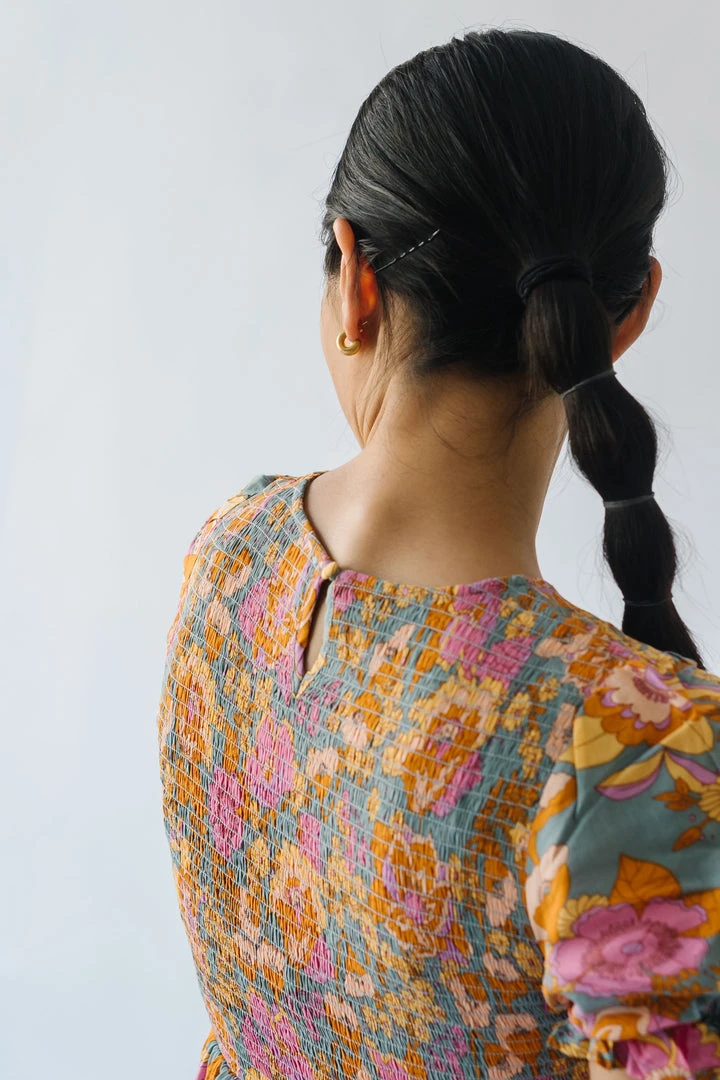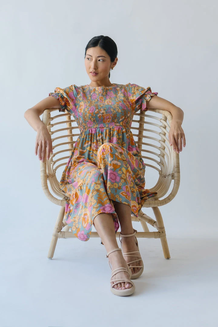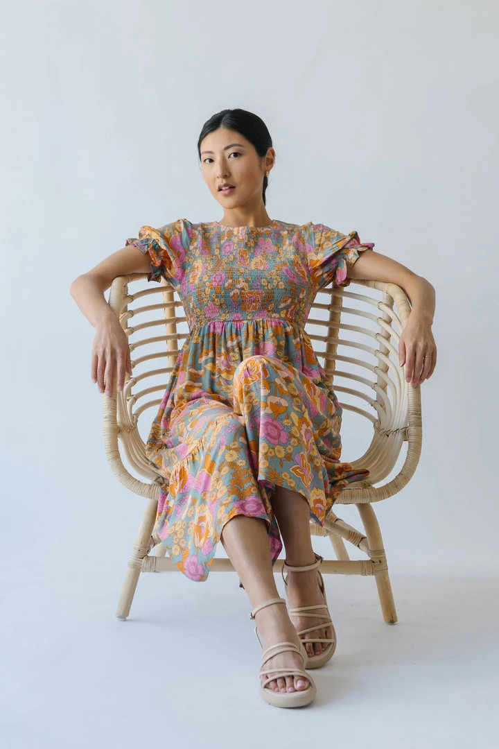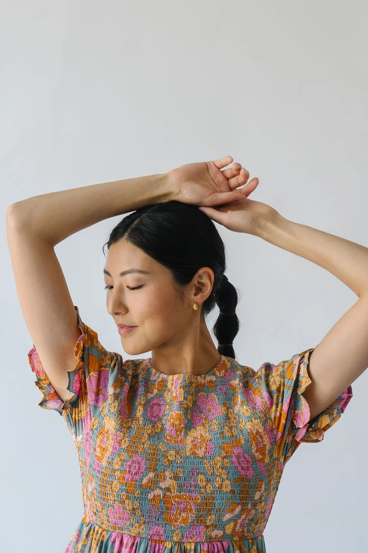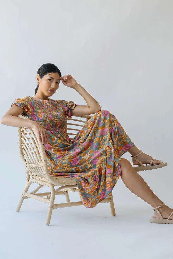 The Allred Puff Sleeve Midi Dress has a psychedelic floral print with ruffles short sleeves, a smocked bodice, and a tiered skirt. It is maternity-friendly.Â