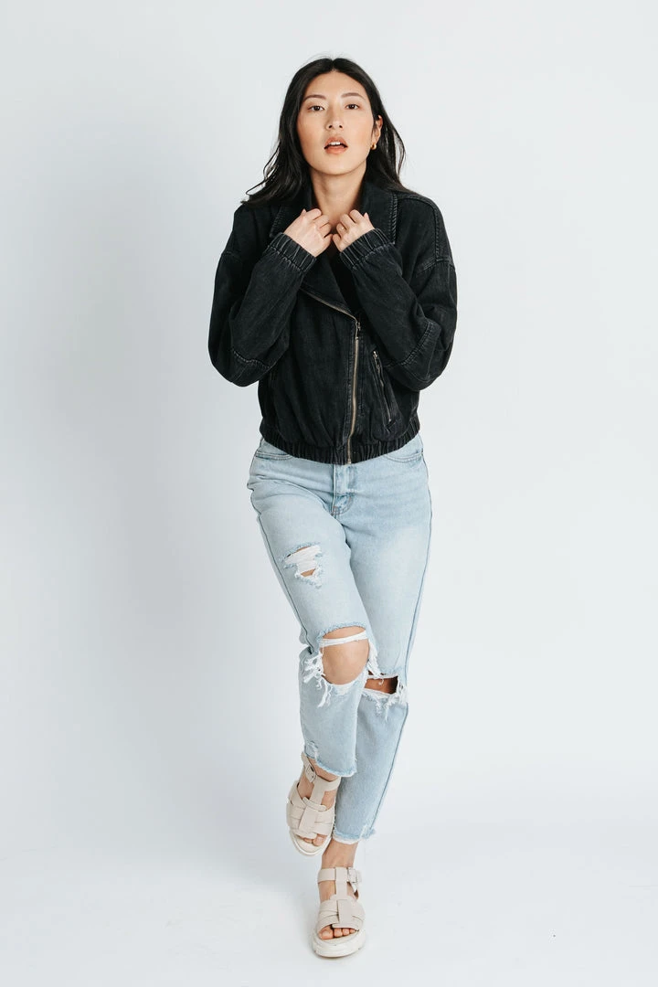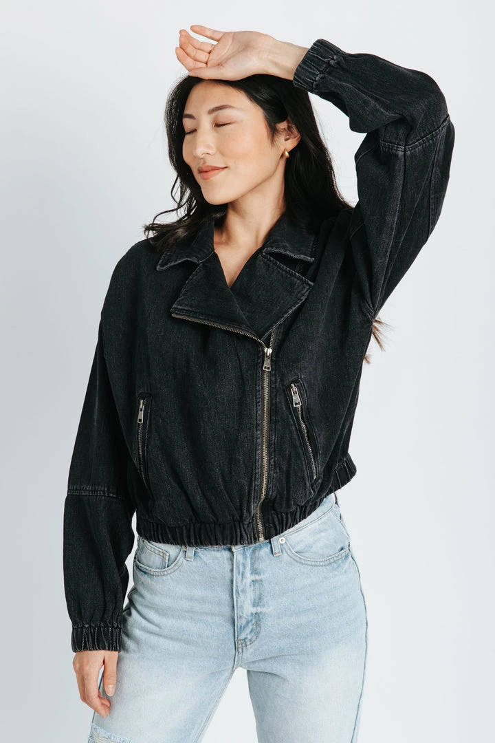 Add some edge to your winter wardrobe. The Alondra Zip Up Jacket is black with a notched collar. It has a zipper closure down the front with zipper side pockets. It has an elastic hemline + sleeve cuffs.