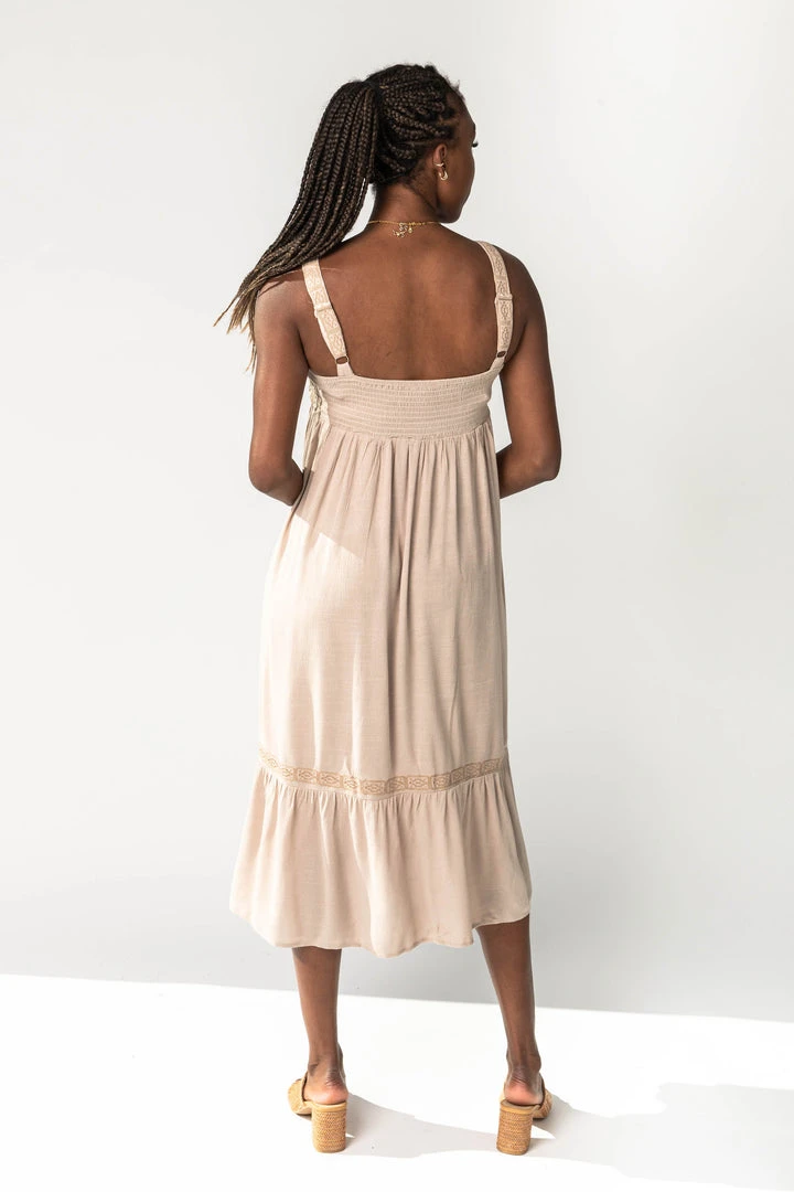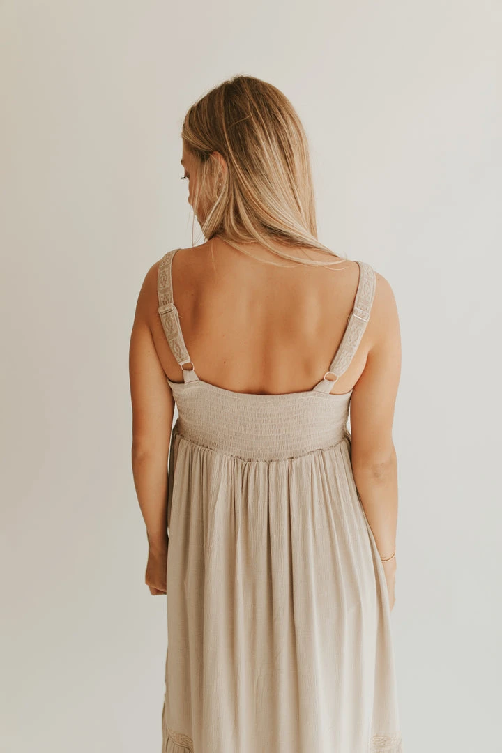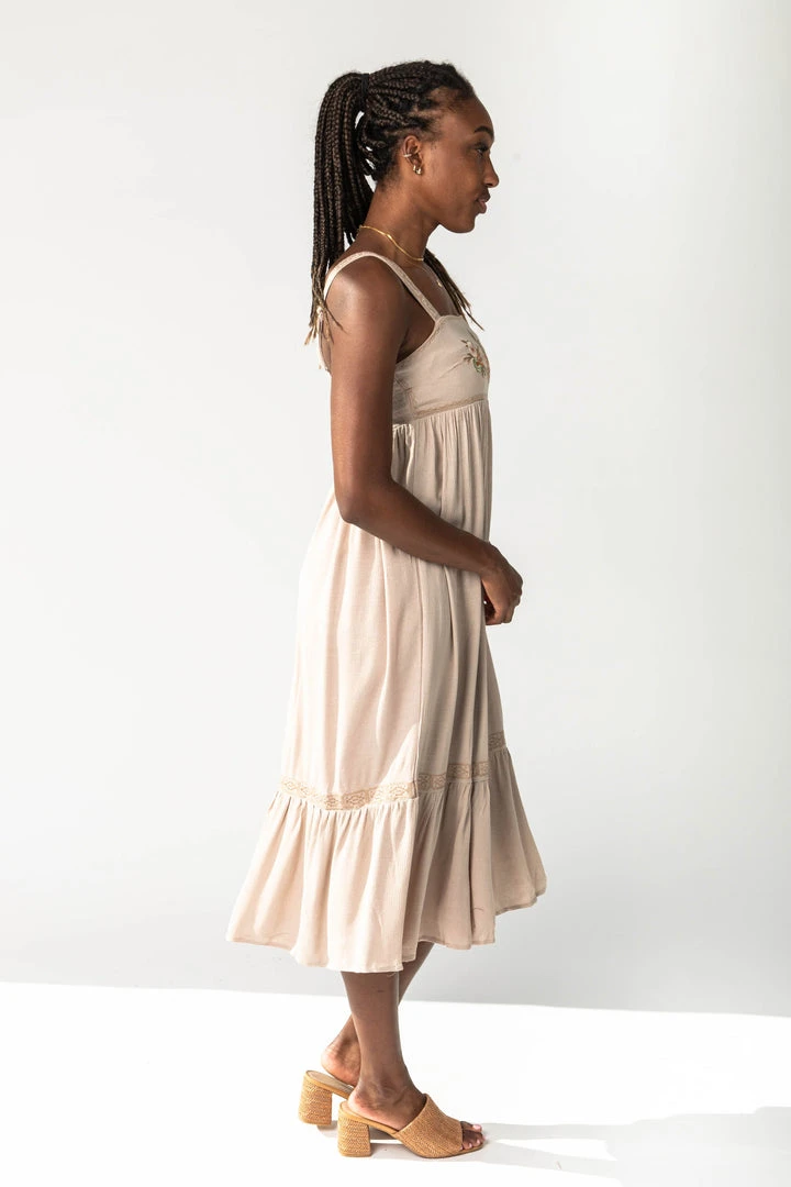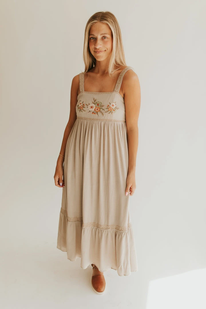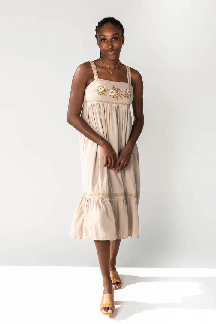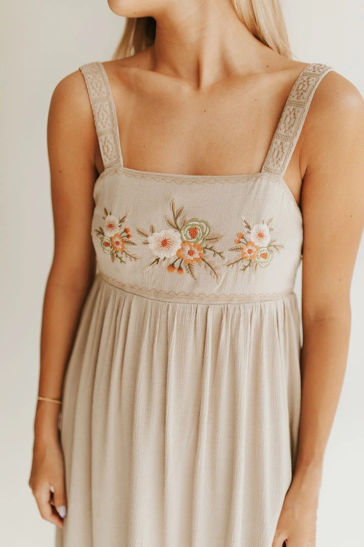 The Bonifay Embroidered Tank Dress has a square neckline with floral embroidery on the front + an empire waistline. It is lightweight + perfect for sunny days.