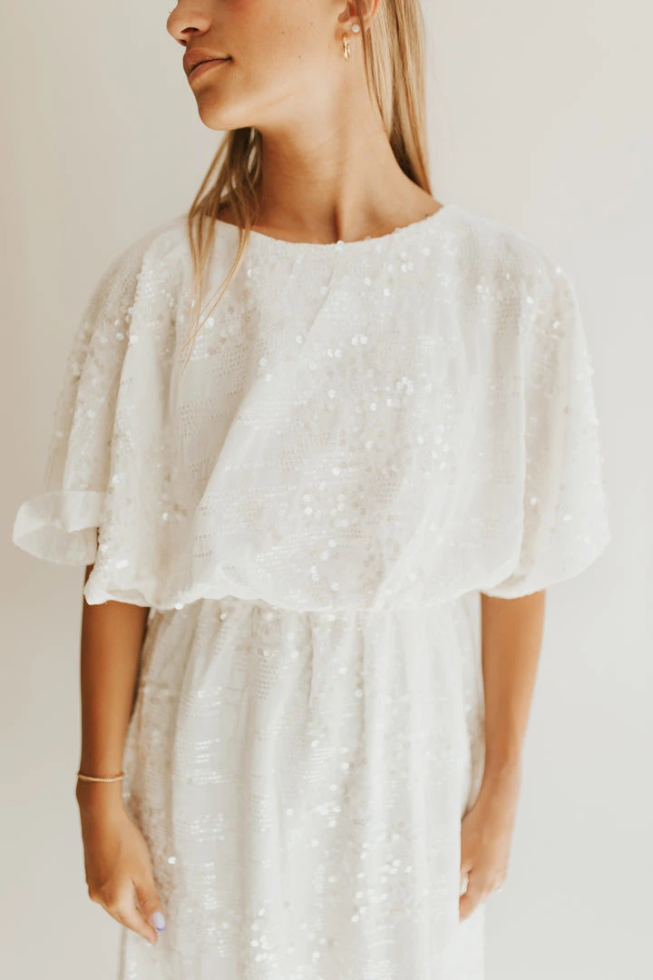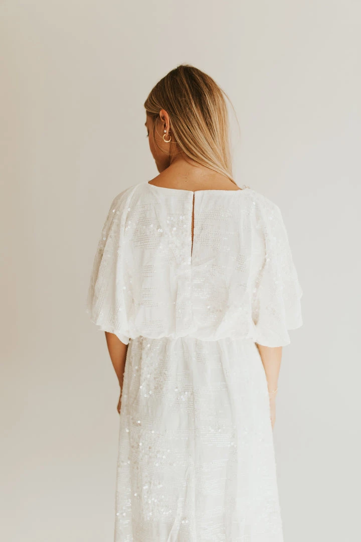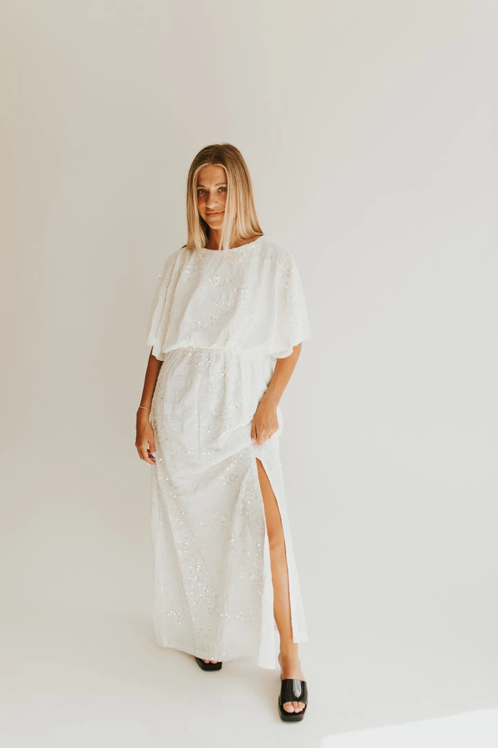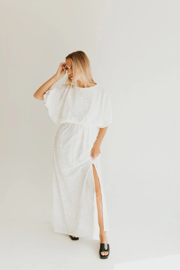 Sequins for the season. The Briggs Sequin Detail Maxi Dress has shimmering off-white sequins. It has breathable + flattering dolman-style short sleeves. The waistband is elastic. It has a slit in the front to stylishly showcase your leg. It comes in two colors.