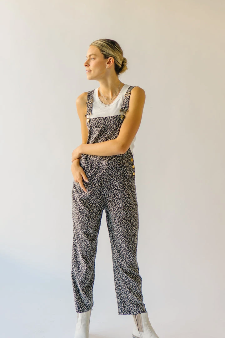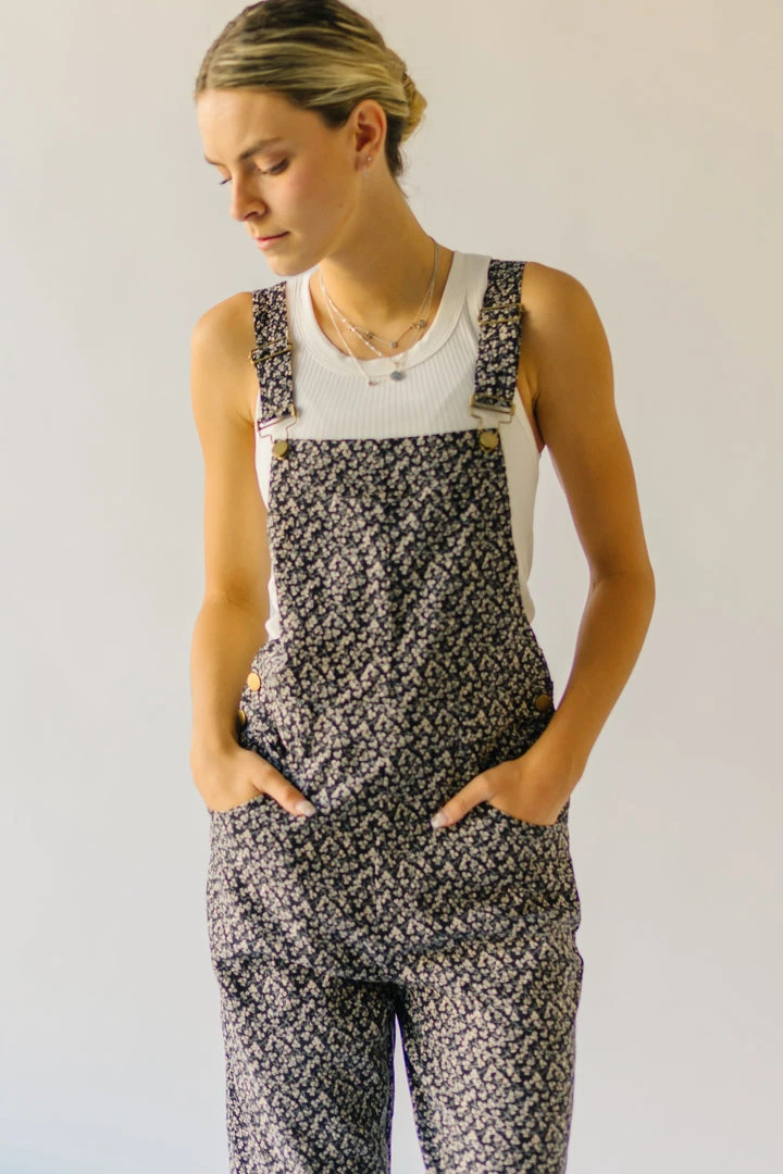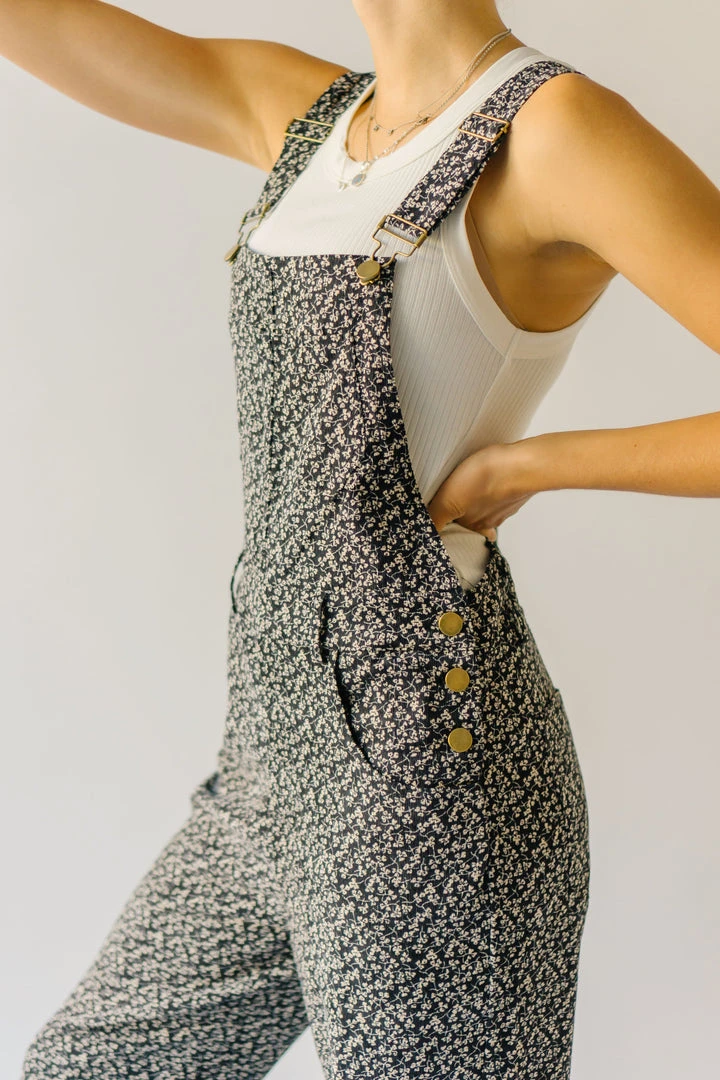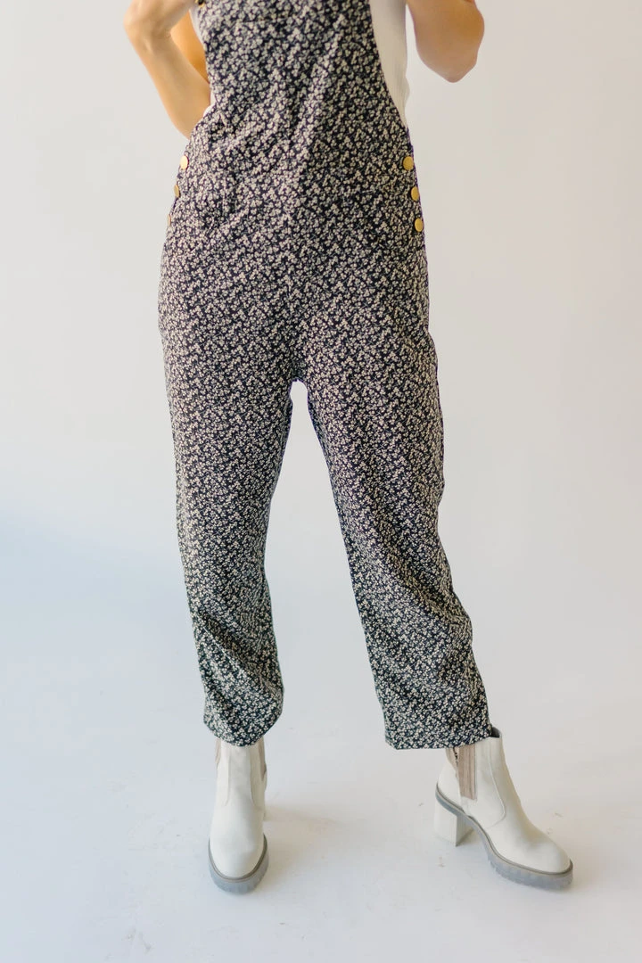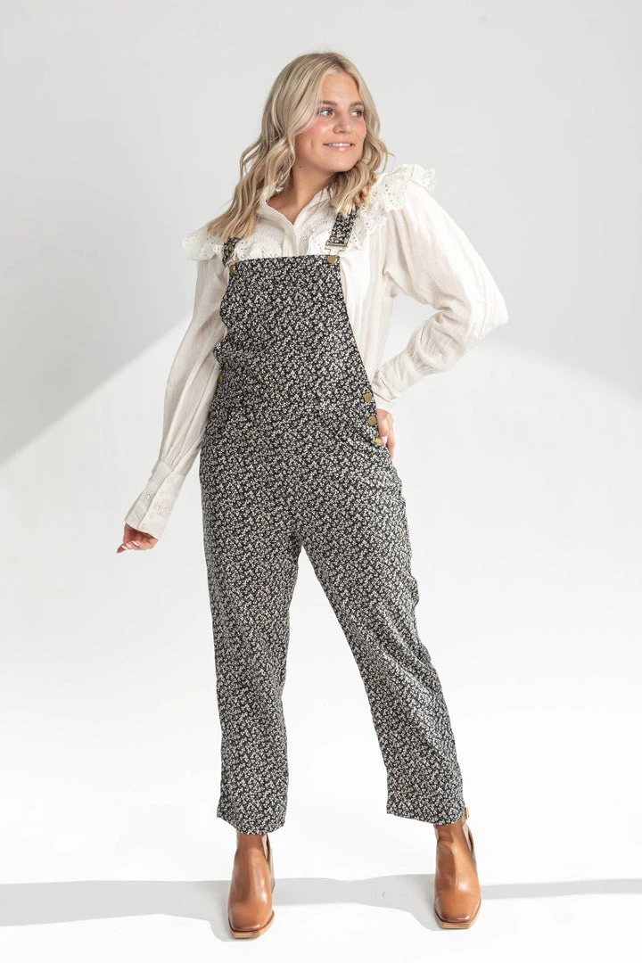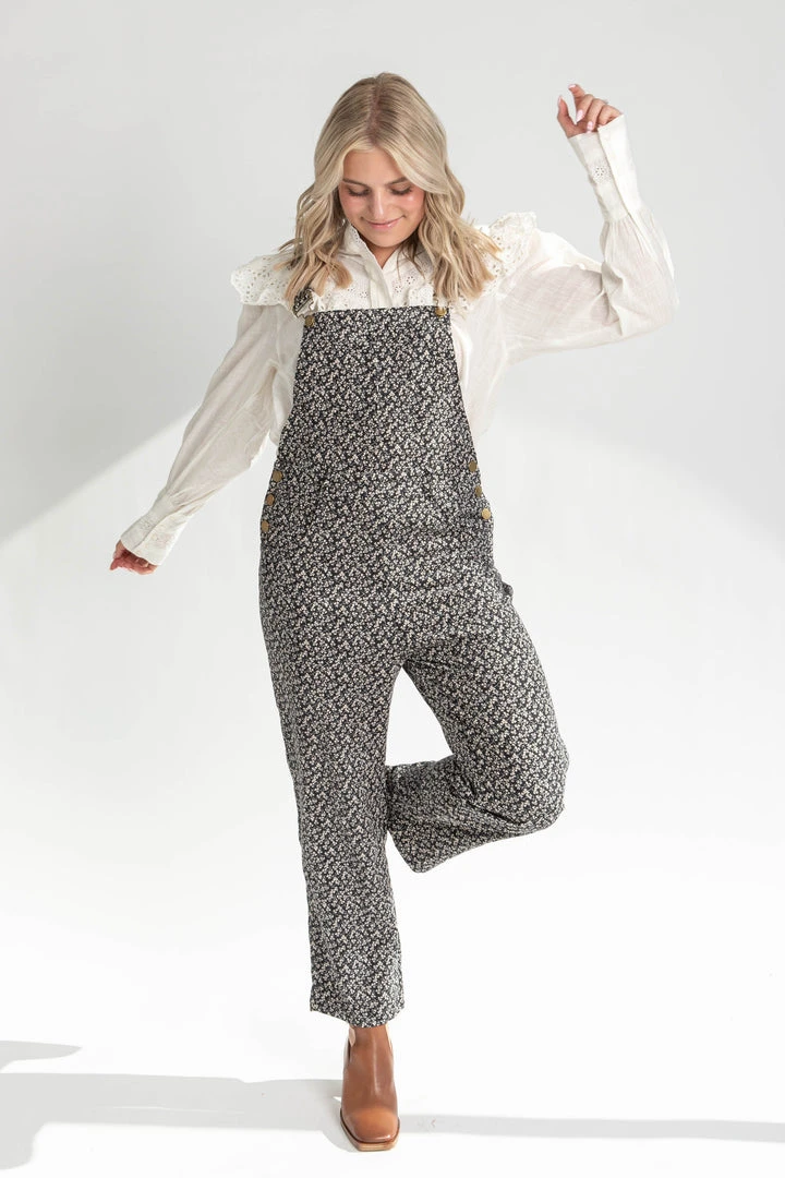 The Bruno Floral Overalls have adjustable straps. They have brass hardware with a floral print. They can be worn year-round. They have a slightly cropped wide leg.