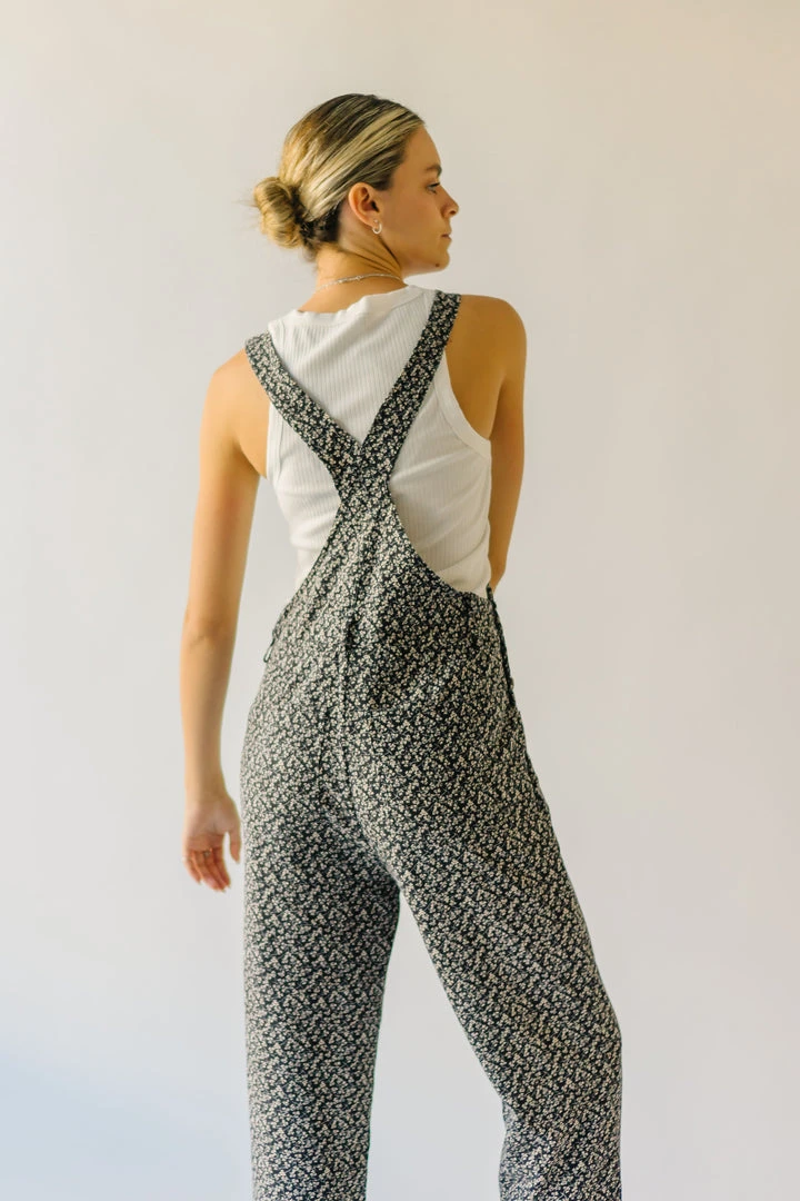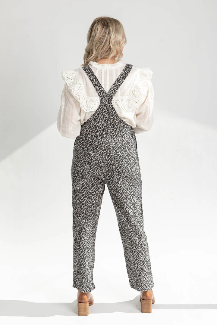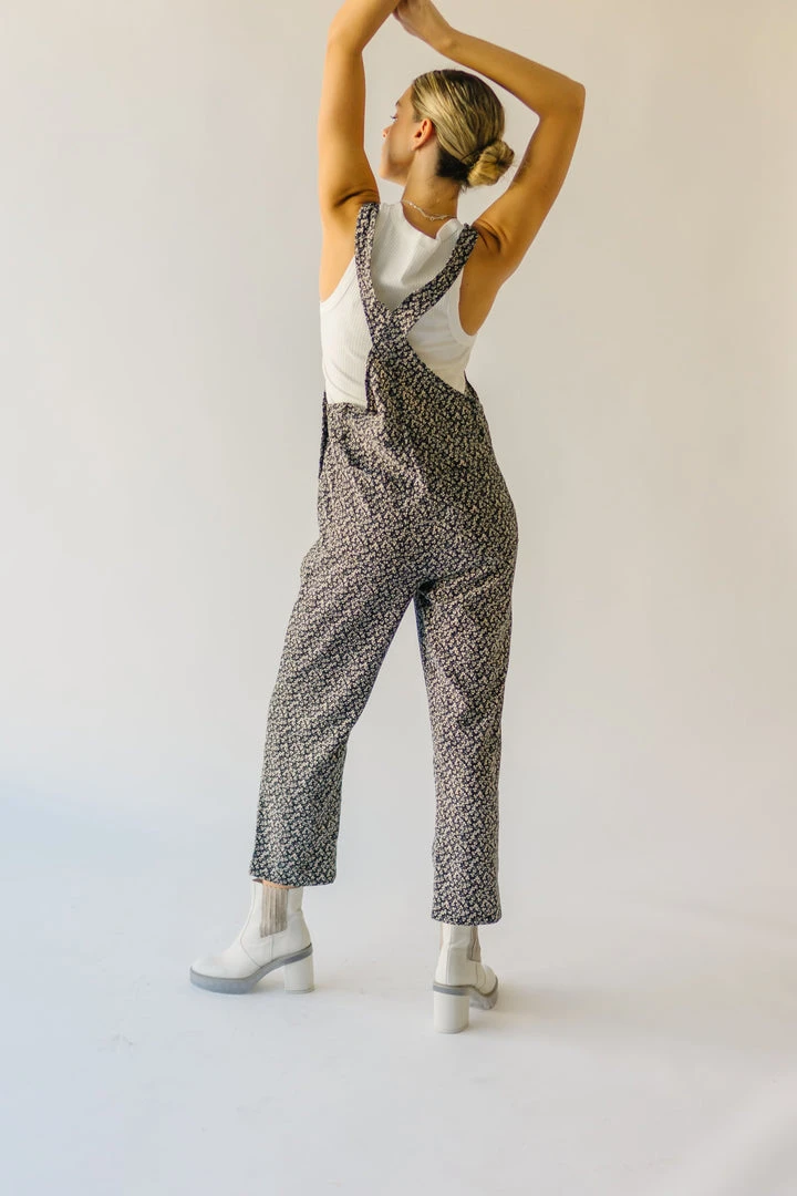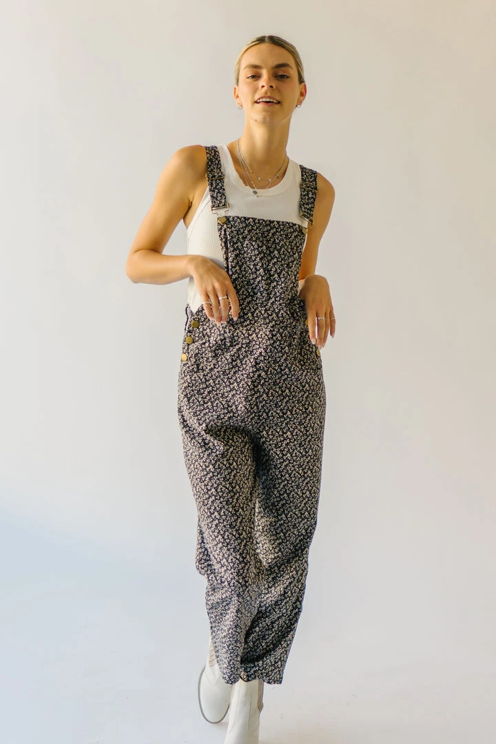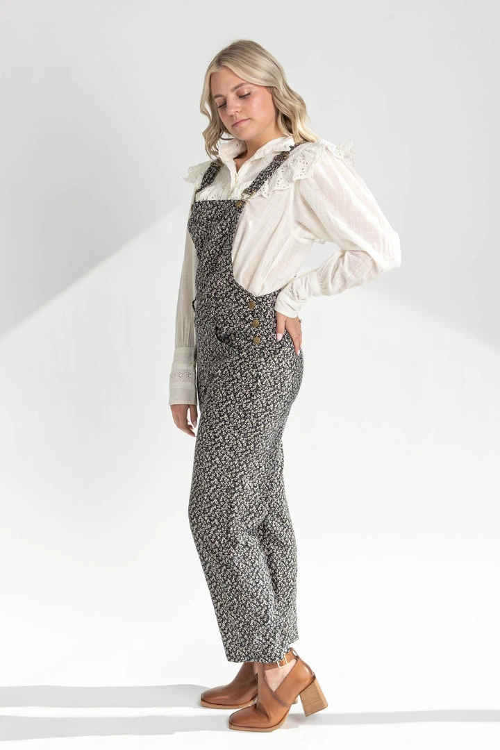 The Bruno Floral Overalls have adjustable straps. They have brass hardware with a floral print. They can be worn year-round. They have a slightly cropped wide leg.