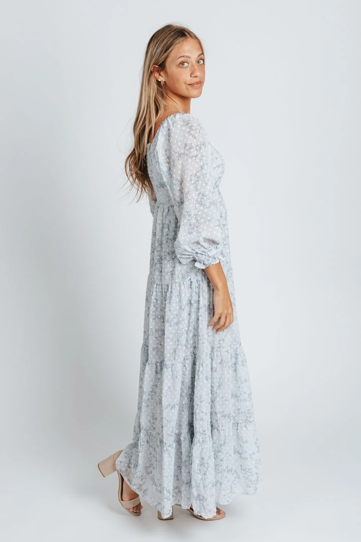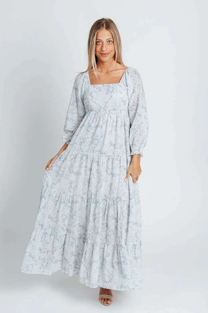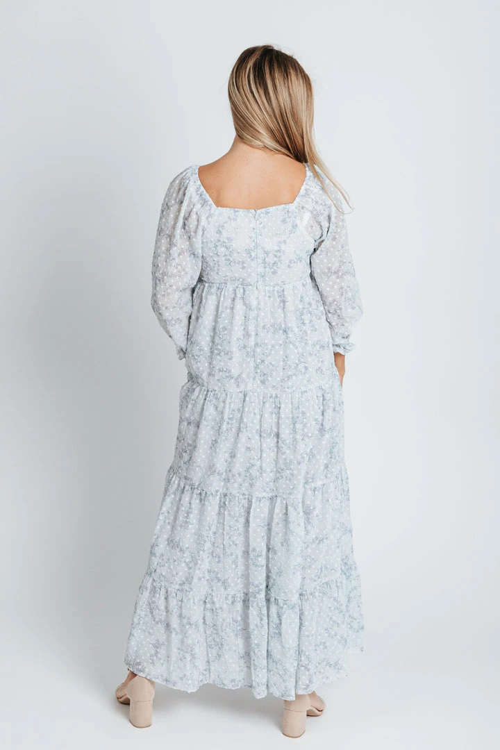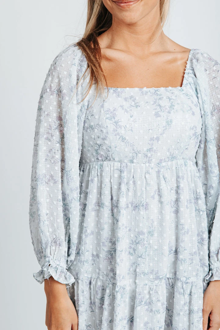 The Brunswick Square Neck Dress is dusty blue with a delicate swiss dot + floral print combo. It has a square neckline + back with an empire waistline. It has sheer long sleeves with ruffled + elastic cuffs. It has a tiered skirt that is lined. It comes in extended sizing.Â