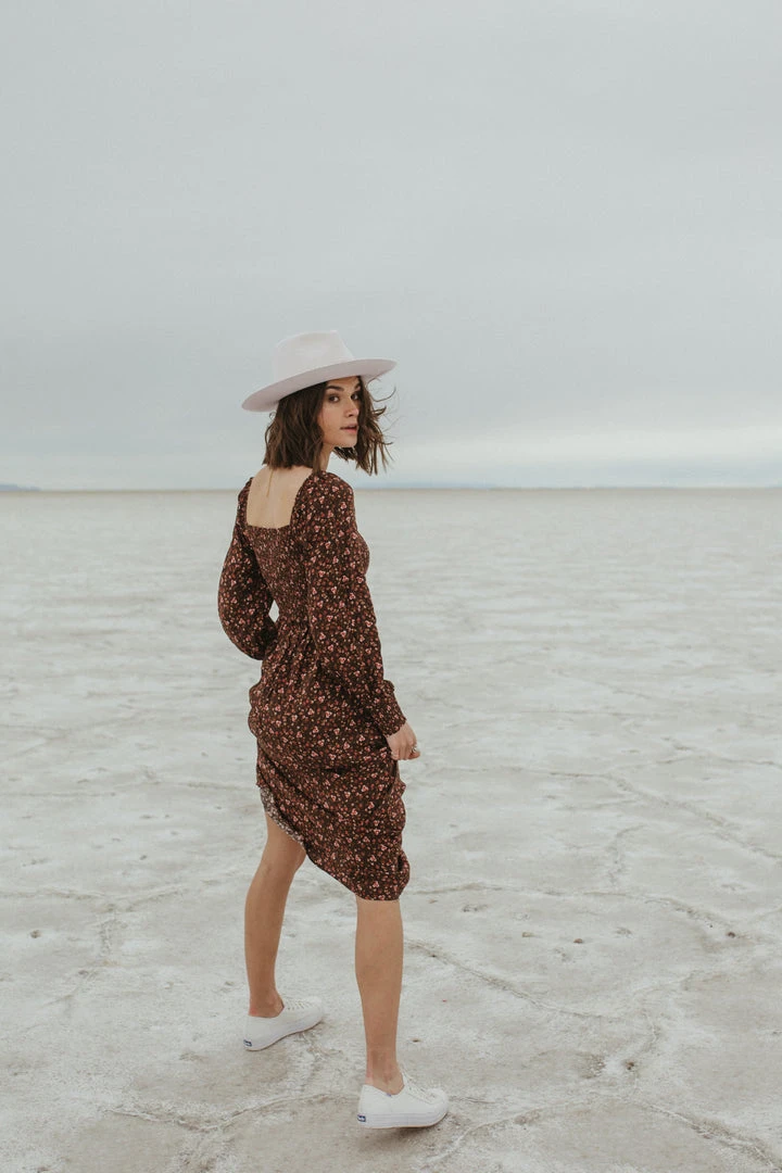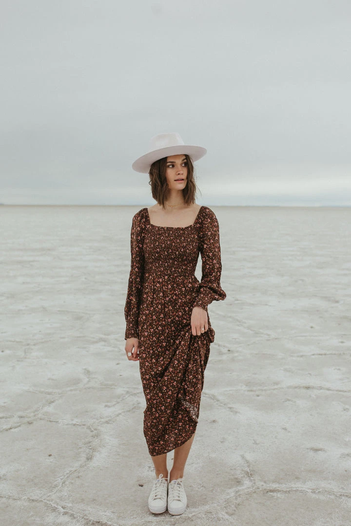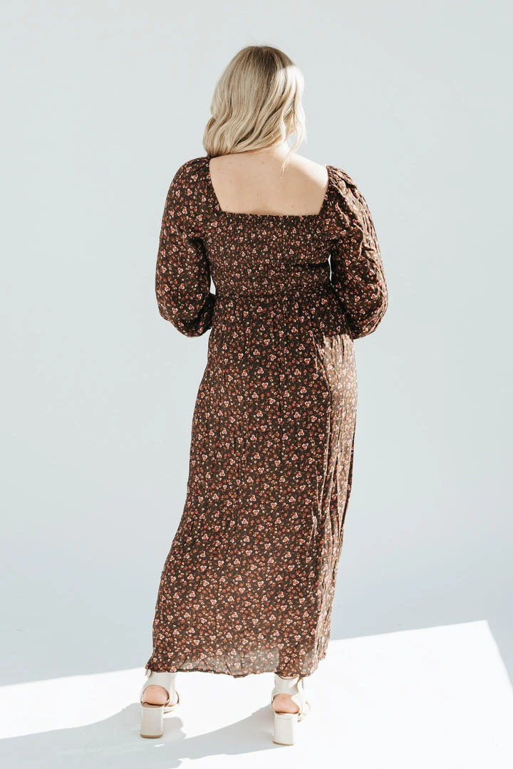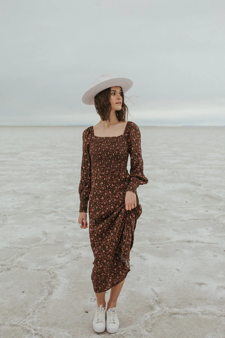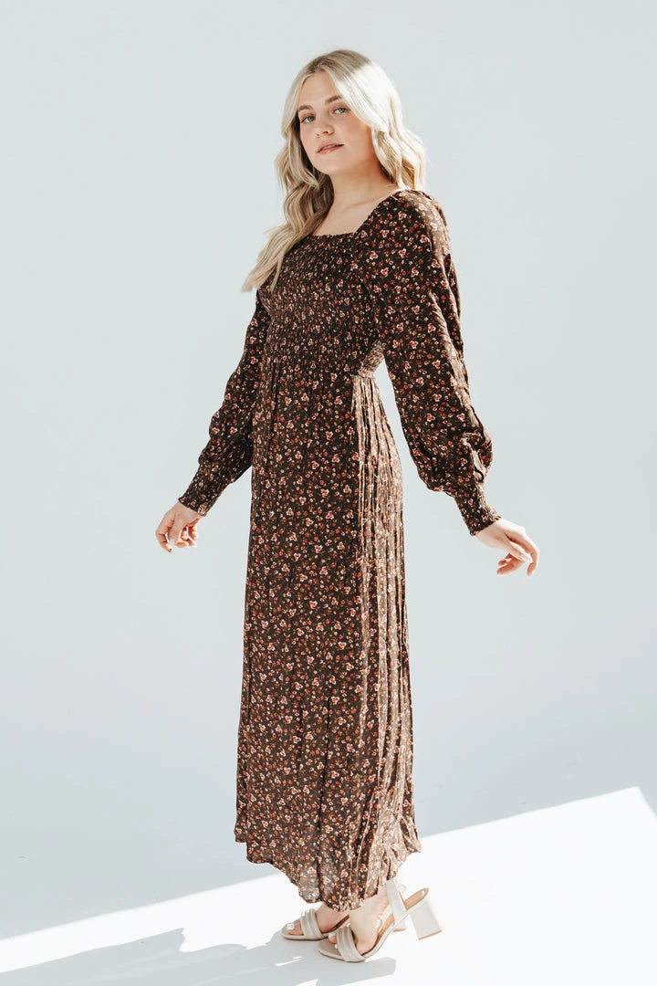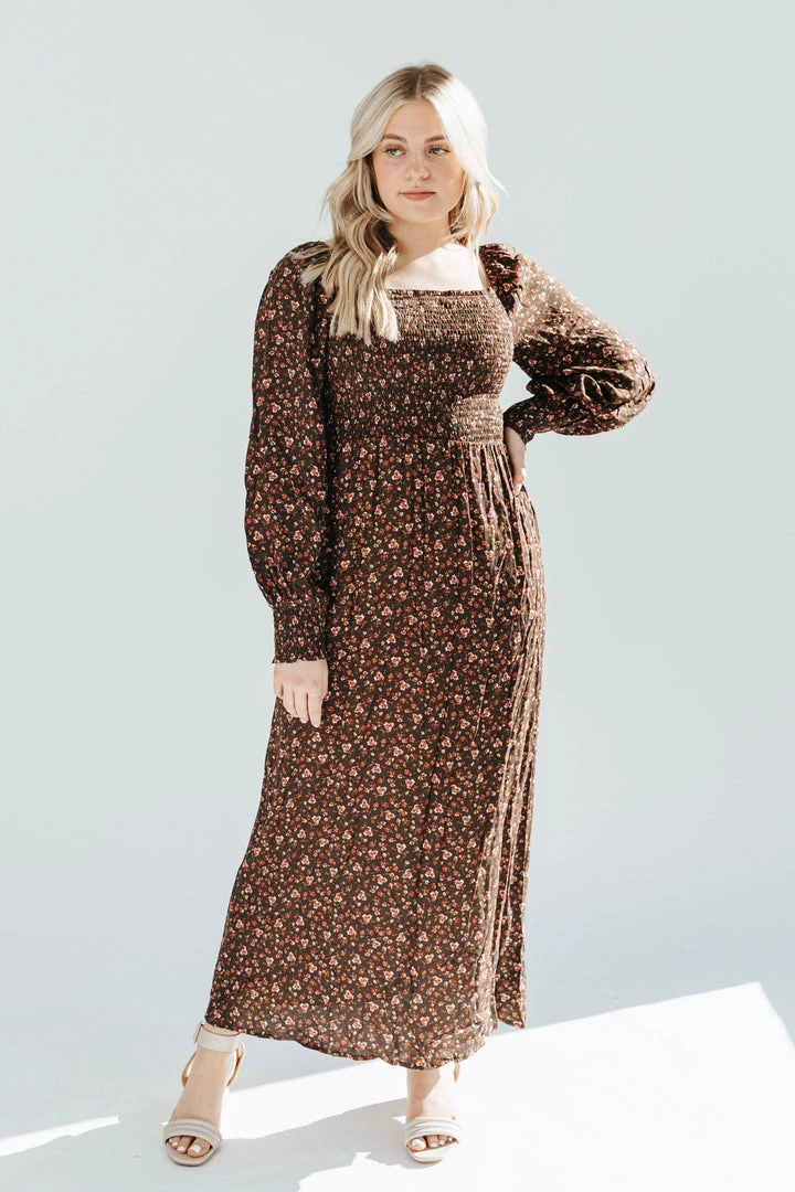 This floral dress has rich colors with cute coverage. It has a square neckline + back. The smocked bodice provides flattering flexibility. It has long sleeves + a maxi length.