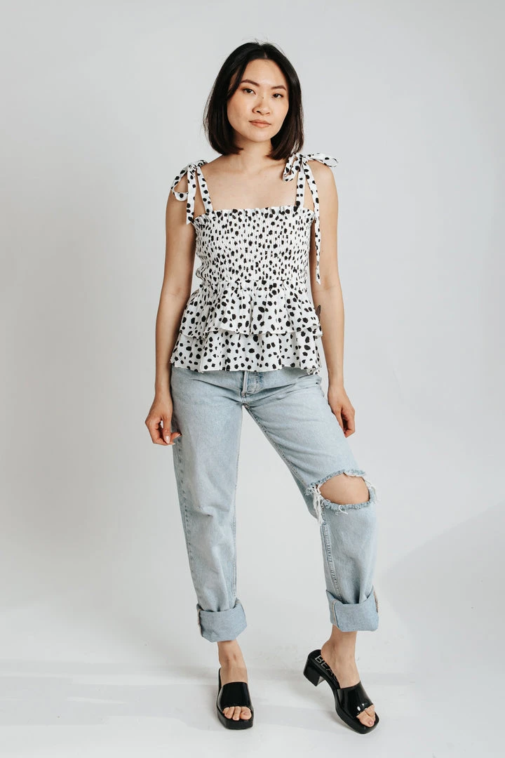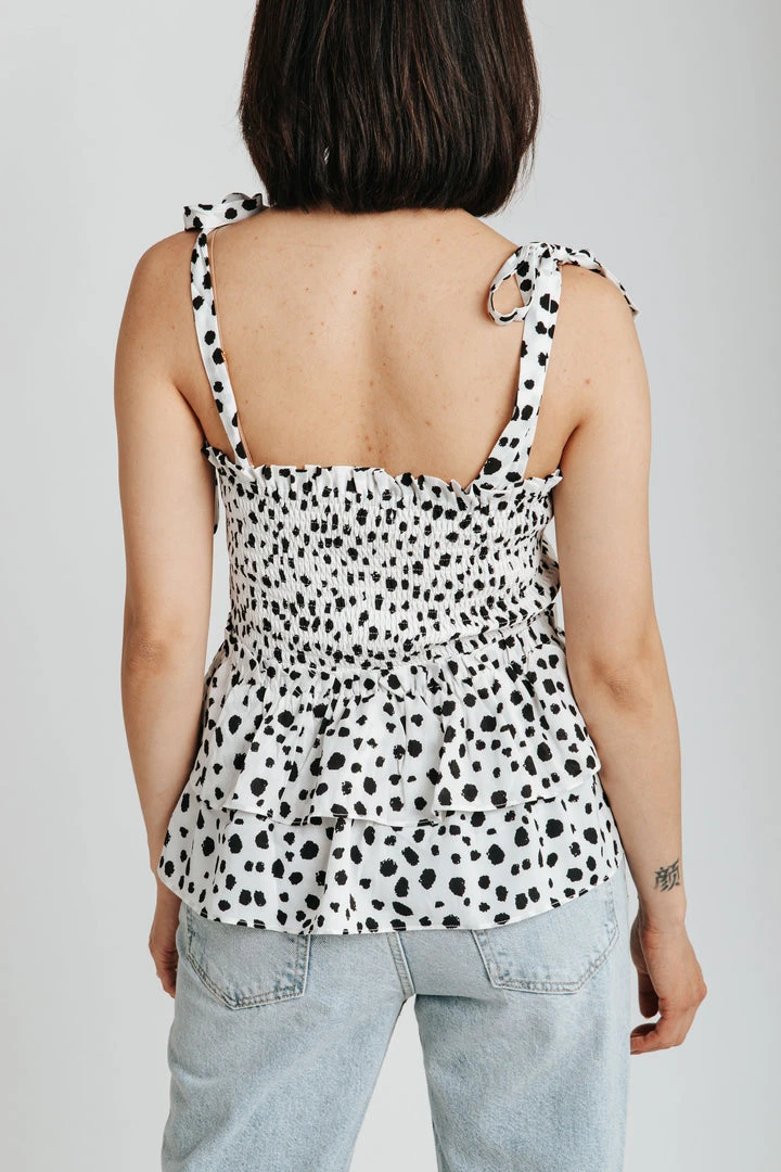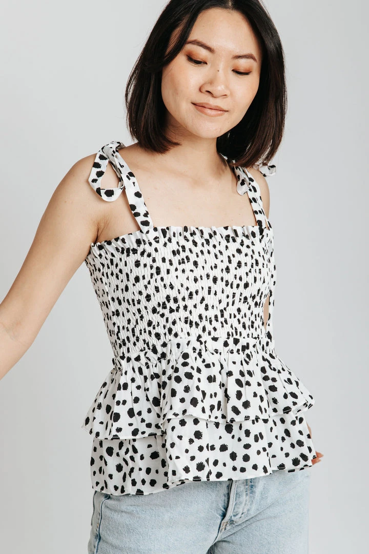 The Cindy Polkadot Tank Top is (dot, dot, dot) the BEST for all the things: brunch, date nights, and basically any event where you want to make a stylish impression. It has a smocked bodice with a square neckline + back and a tiered peplum hemline.
