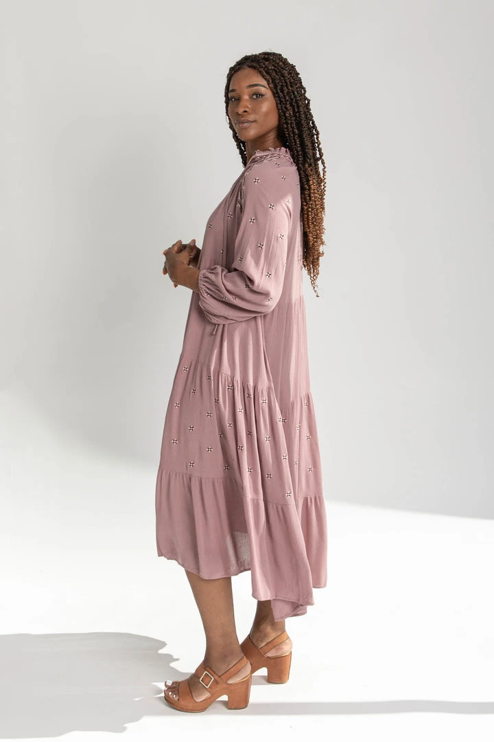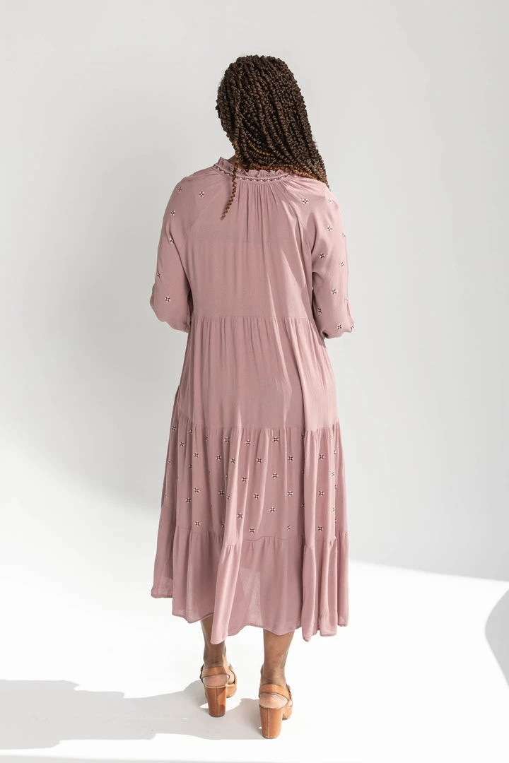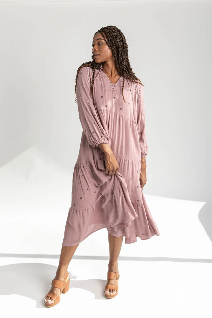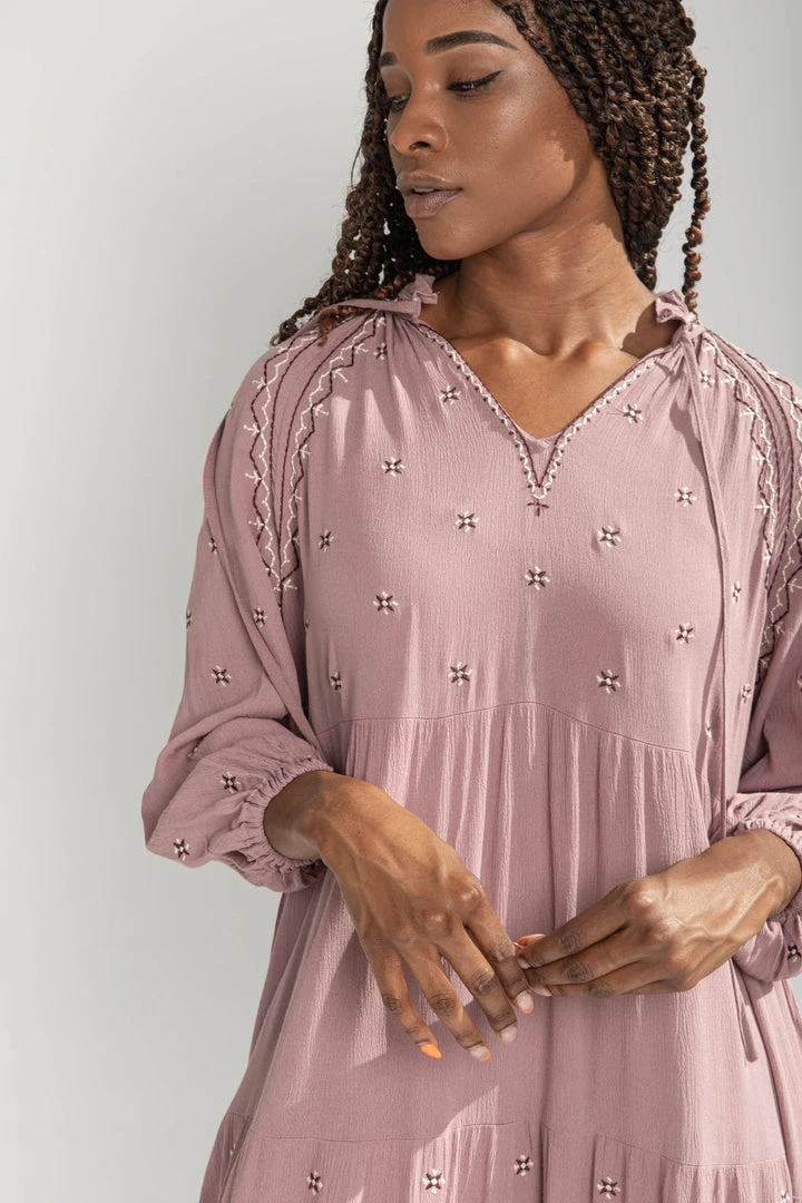 Beachy boho. This maxi dress has a loose + flowy fit with embroidery throughout. There are long ties at the neckline that offer more fine-detailing. It has a tank-style slip underneath that hits around the knee.