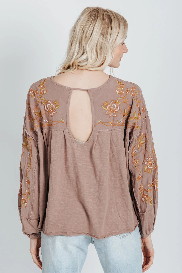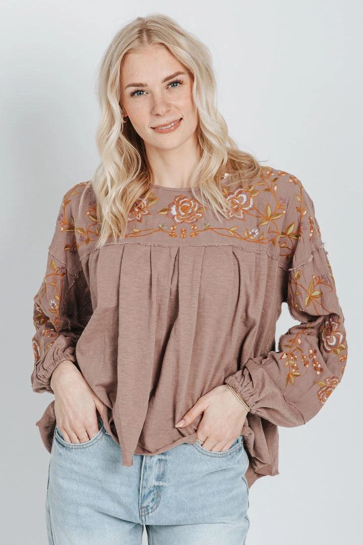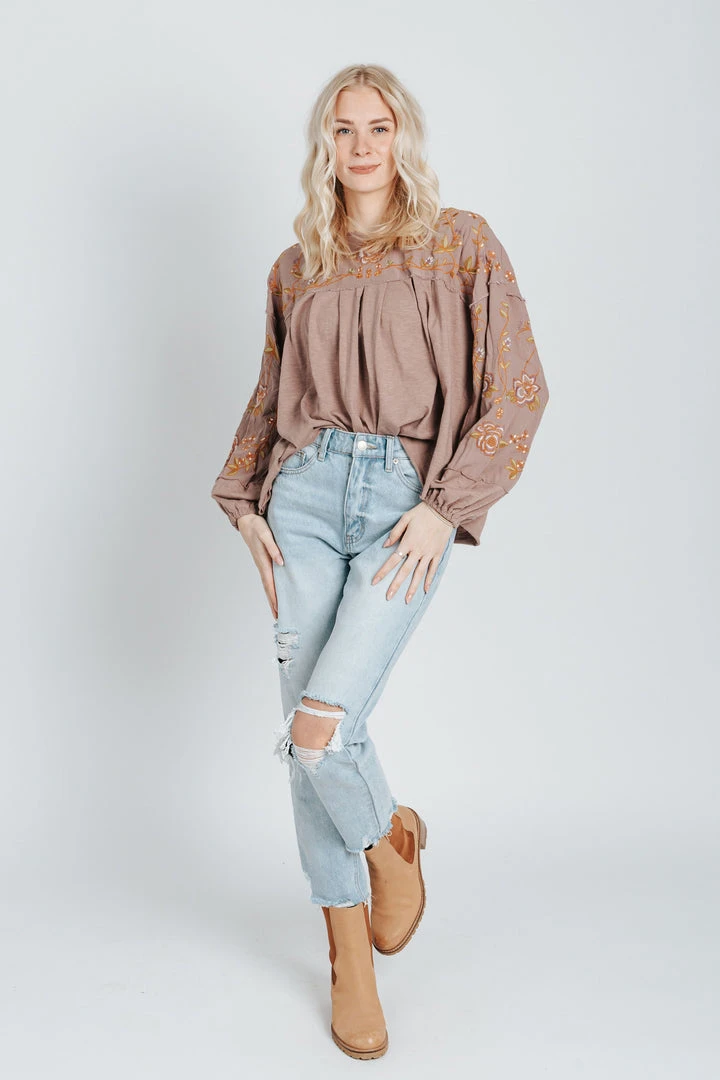 The Darrow Embroidered Blouse is dusty rose-colored with rose embroidery along the neckline + down long sleeves. It has a subtle pleated front that adds a flattering detail with a cut-out in the back. It has a swingy fit with a raw hemline.