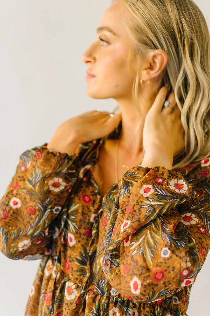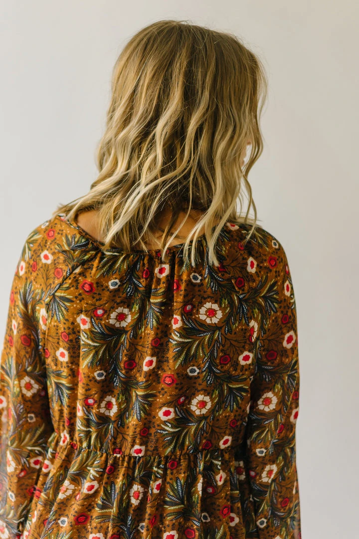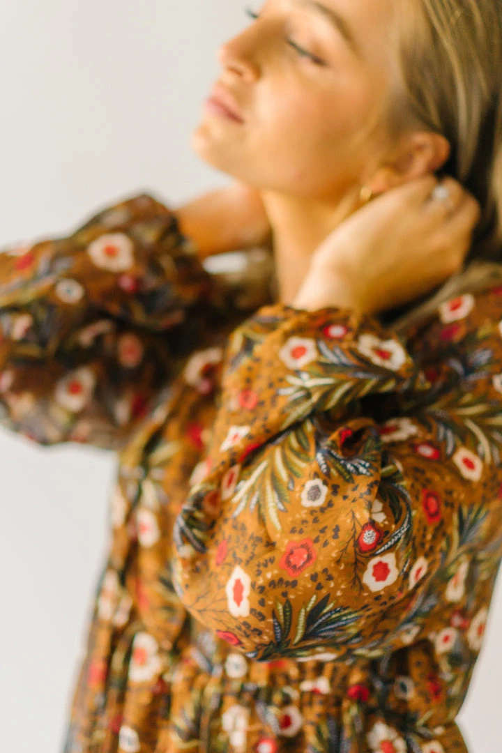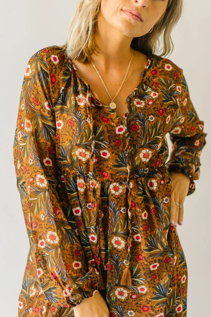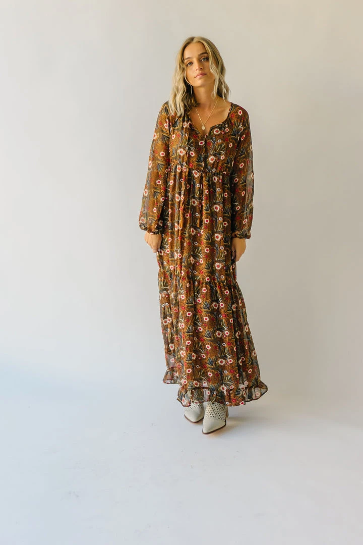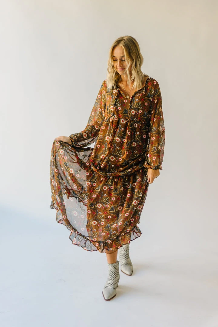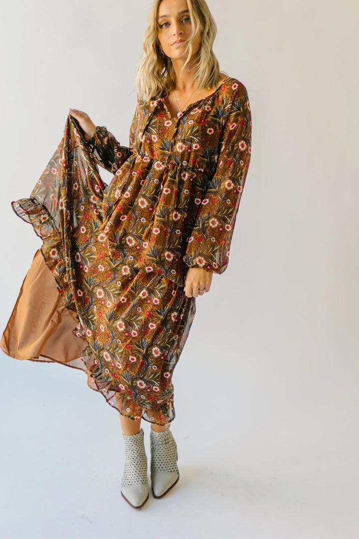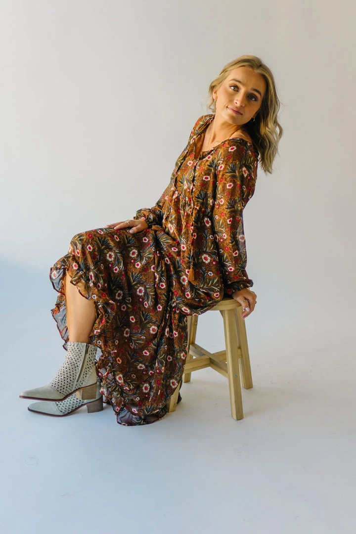 The Davina Ruffle Detail Maxi Dress has a loosely structured silhouette with a brown floral print. It has tassel ties at the neckline, elastic cuff long sleeves, and a ruffled hemline. It is maternity friendly.ย