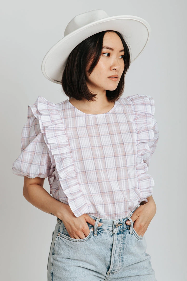 Picnic + parties. The Dayton Plaid Blouse is the perfect blouse for it all. It has a traditional length + fit with ruffle detailing + puff sleeves.