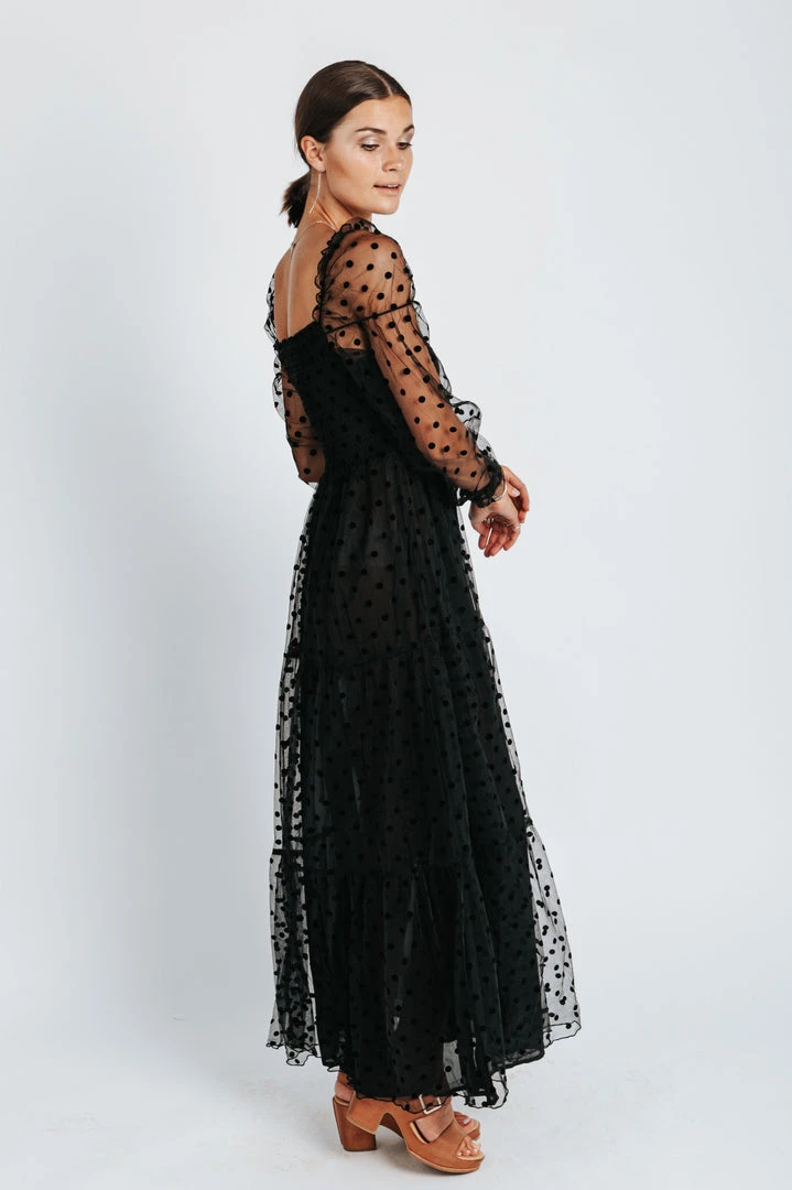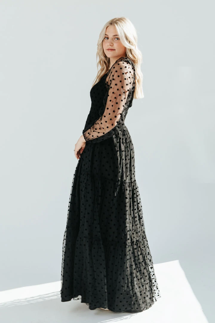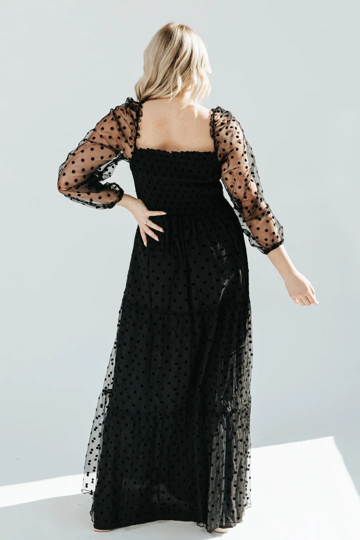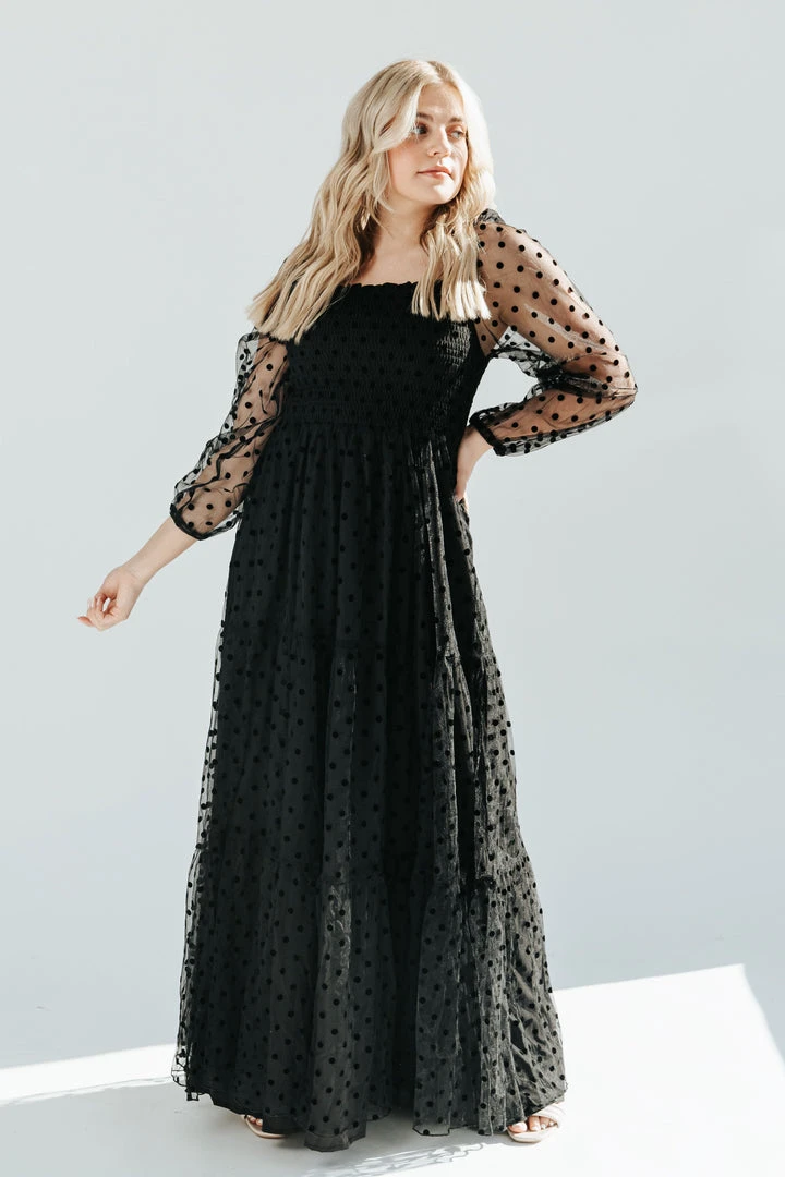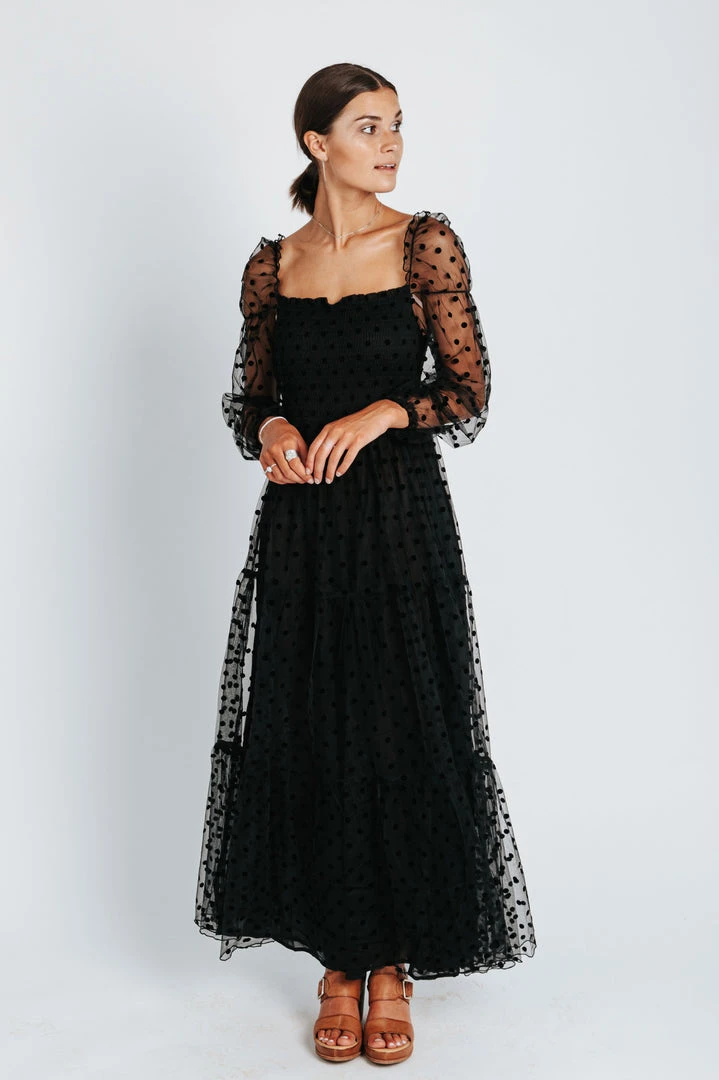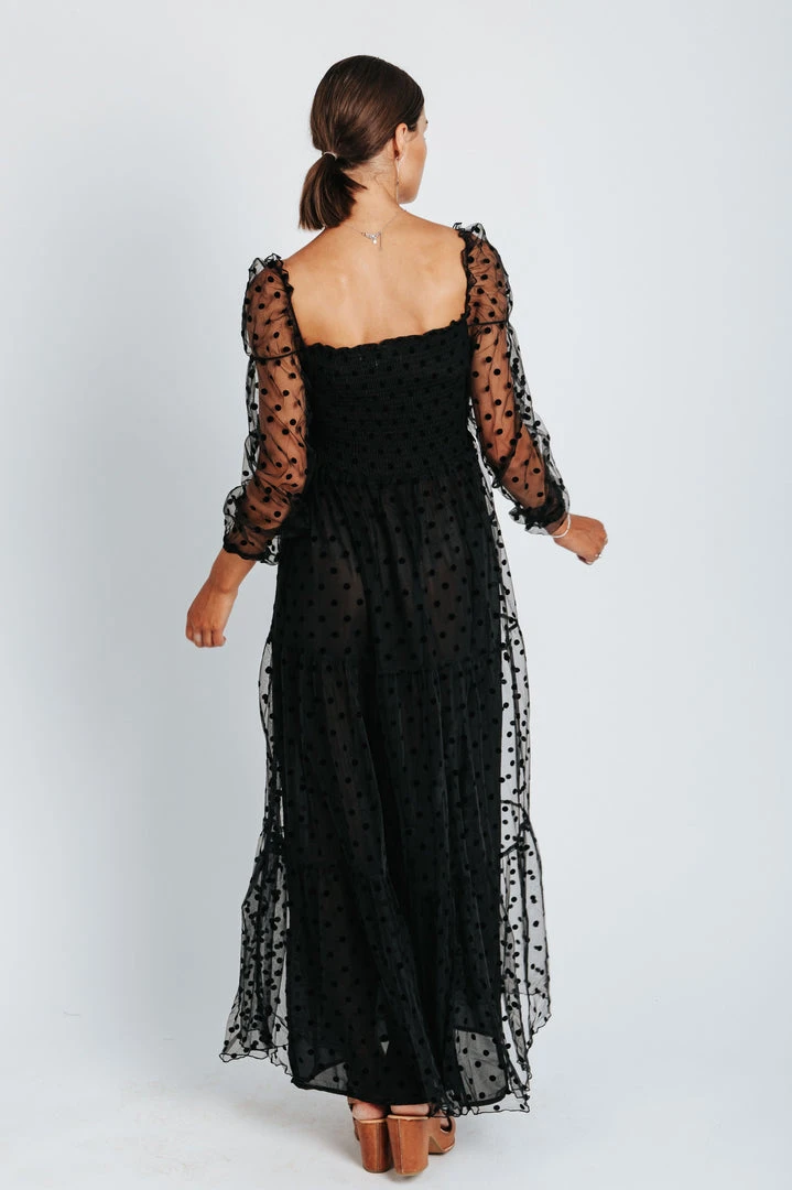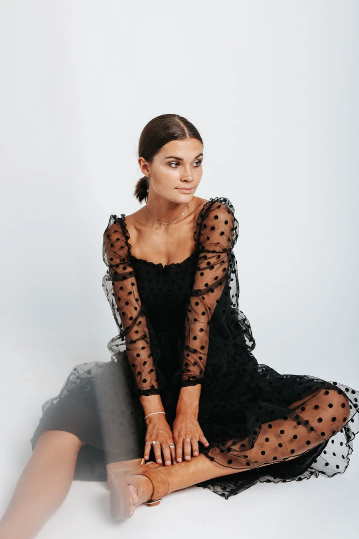 The Easton Dot Detail Dress is STUNNING. This black dress features a textural dot pattern that is accentuated on the sheer long sleeves. It has a square neck + back. It has a smocked bodice + is thinly lined through the skirt.