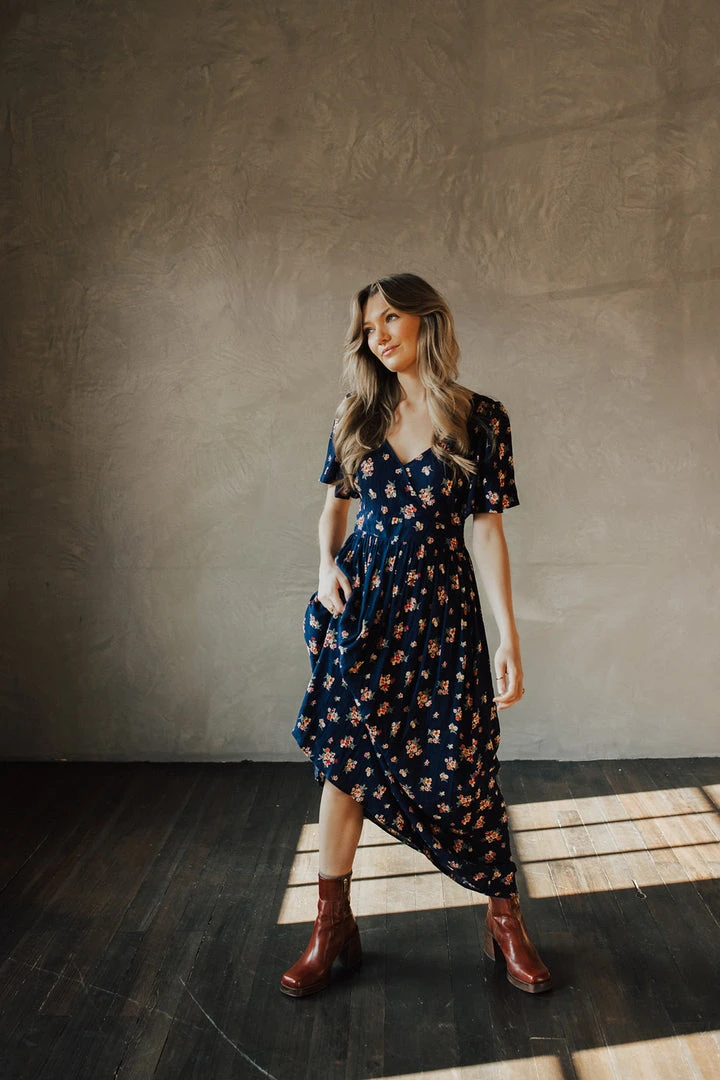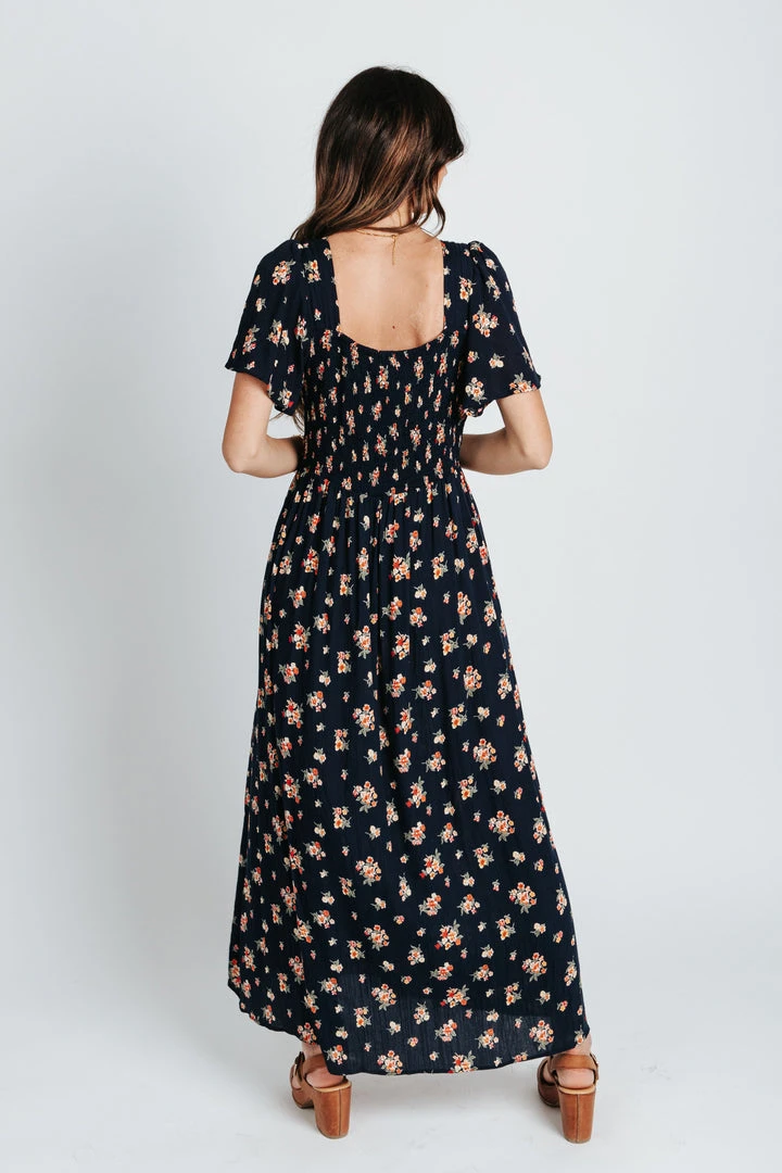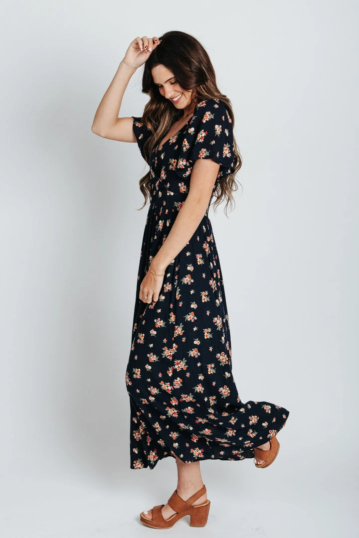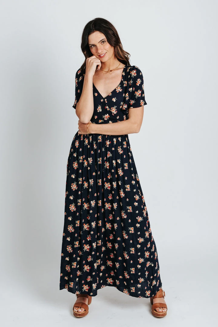 The Elias Floral Maxi Dress offers timeless style in a comfortable silhouette. It has a v-neckline, flutter short sleeves, and a flexible fit. It comes in extended sizing.Â