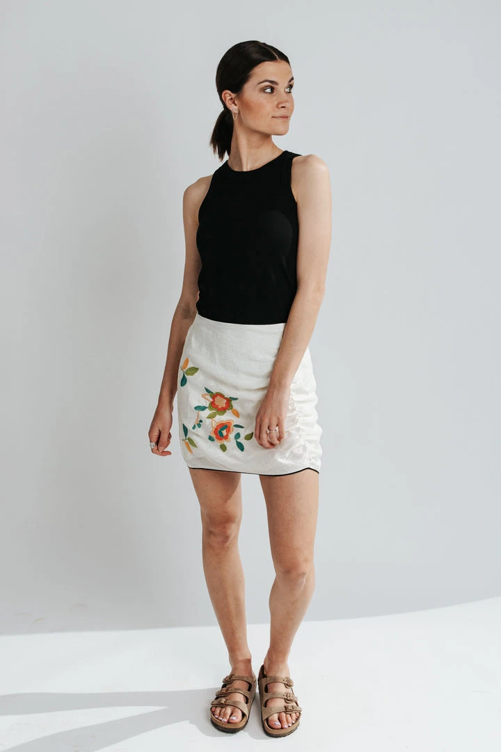 The Elmer Embroidered Skirt is cream-colored with colorful floral embroidery + a ruched side. It has an elastic band on the back of the waistline. The hemline is trimmed in black.
