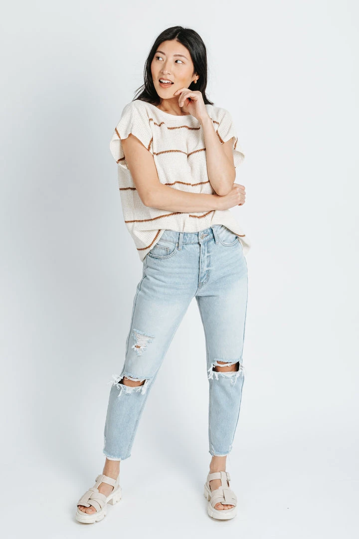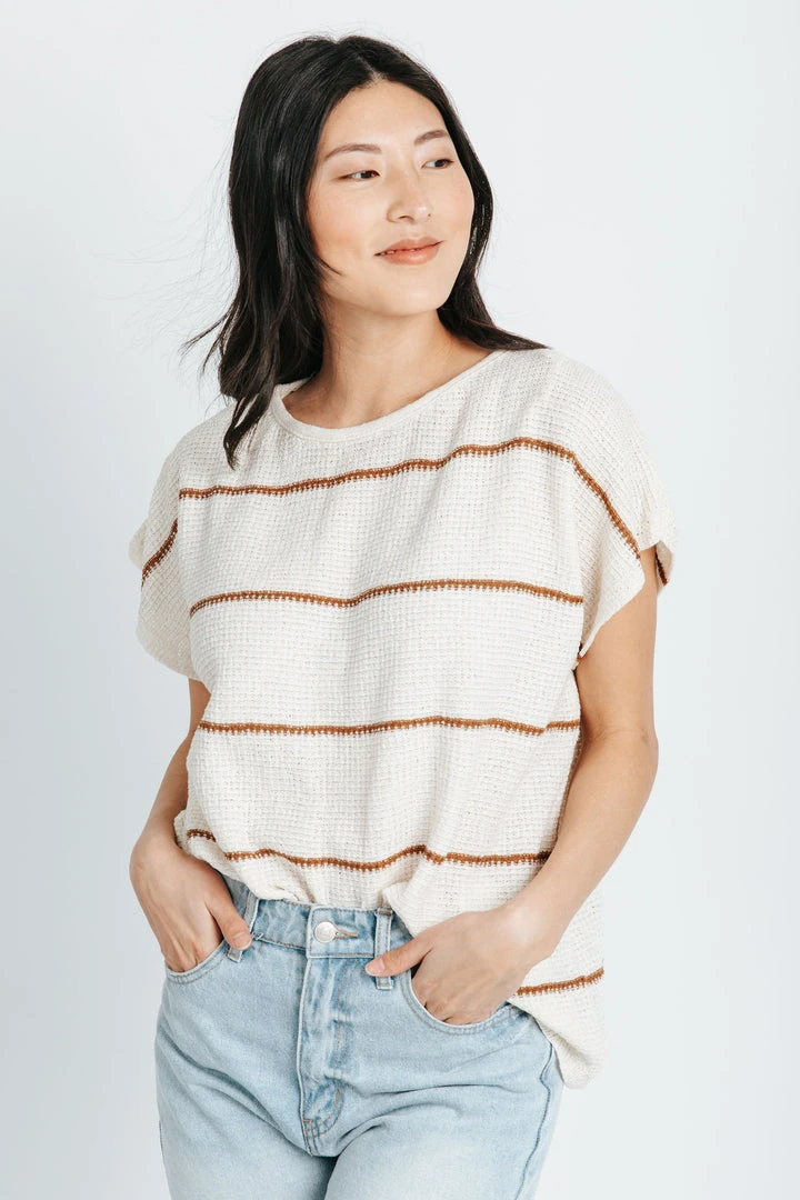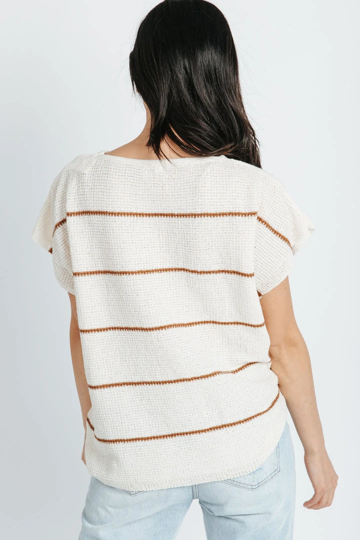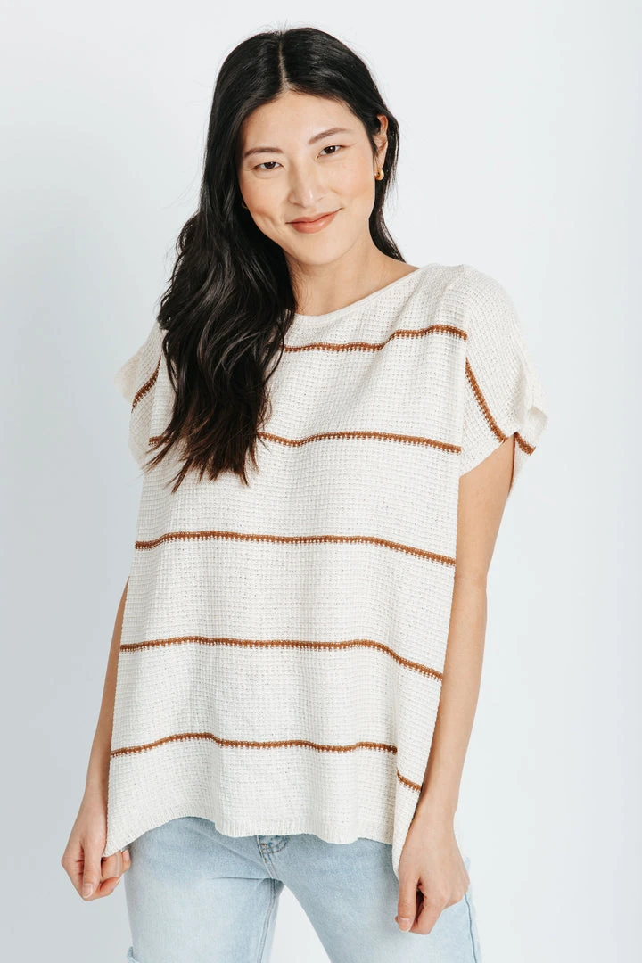A lightweight + stretchy knit makes for the perfect layering option. The Fionna Striped Knit is ivory with thin panels of horizontal stripes. It has a boxy fit with traditional length.Â